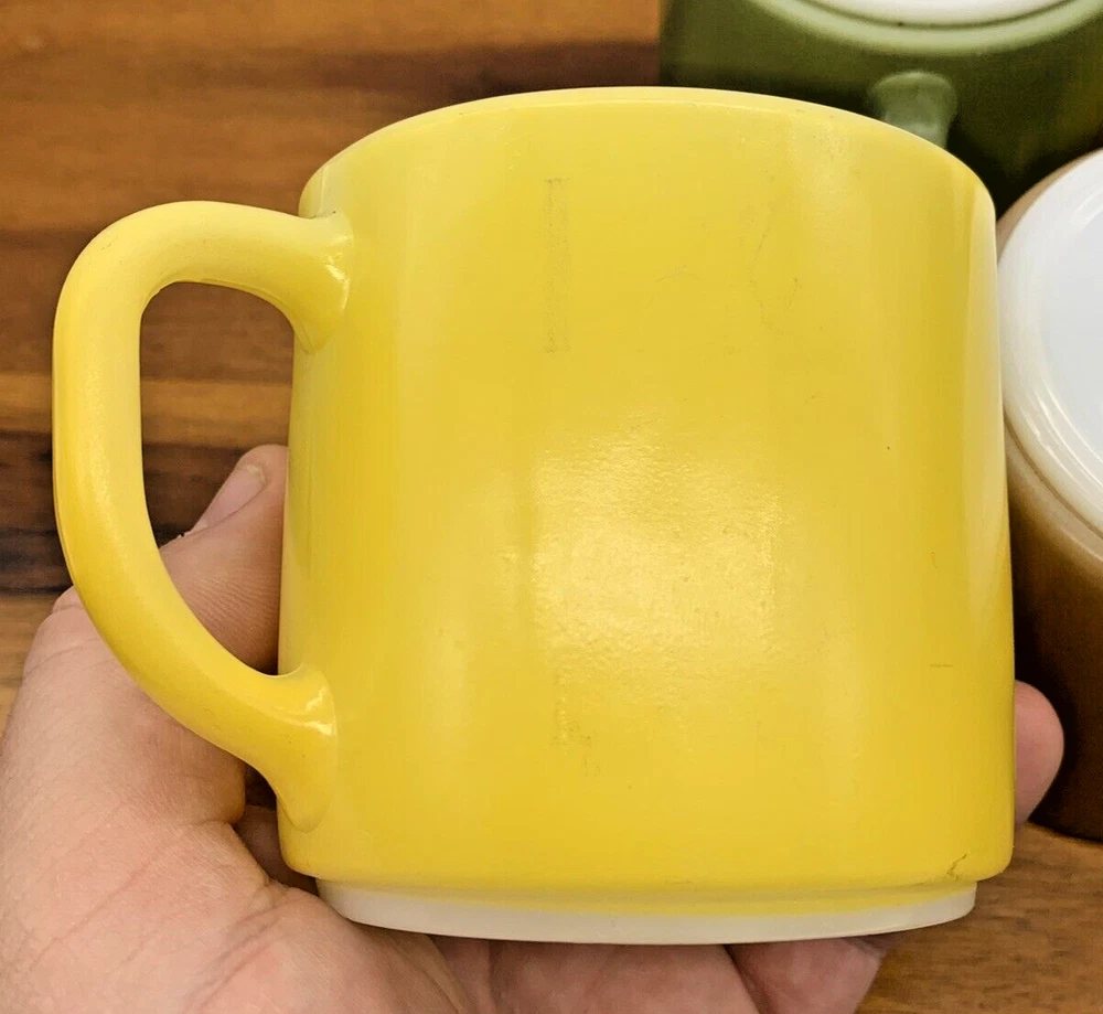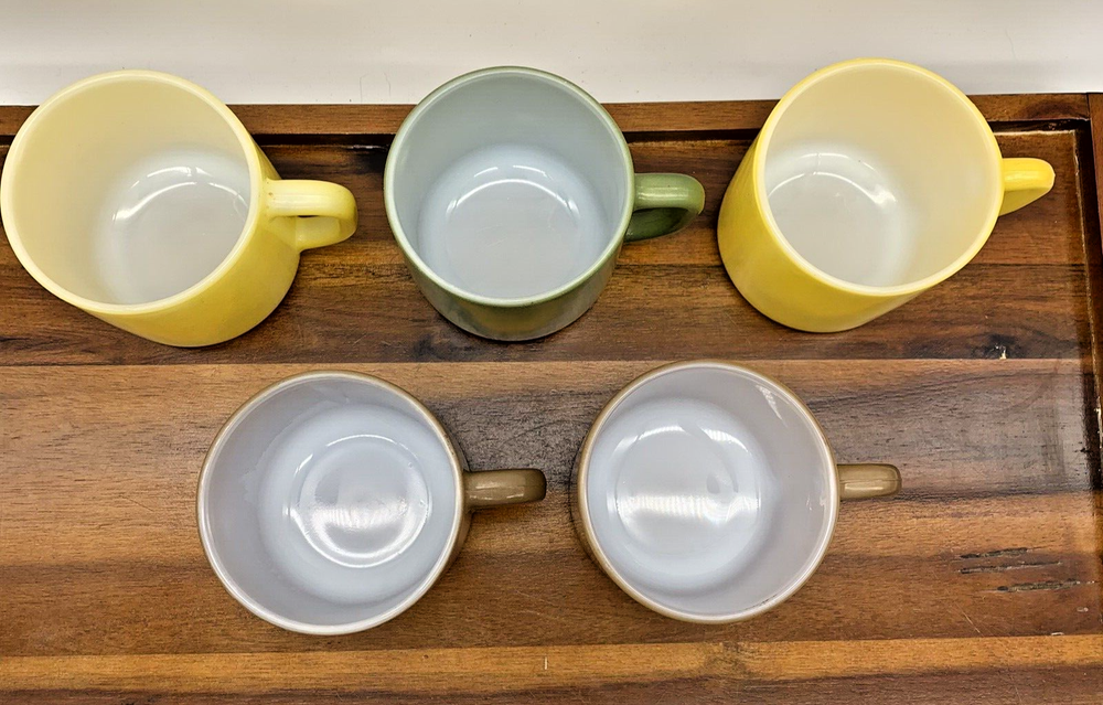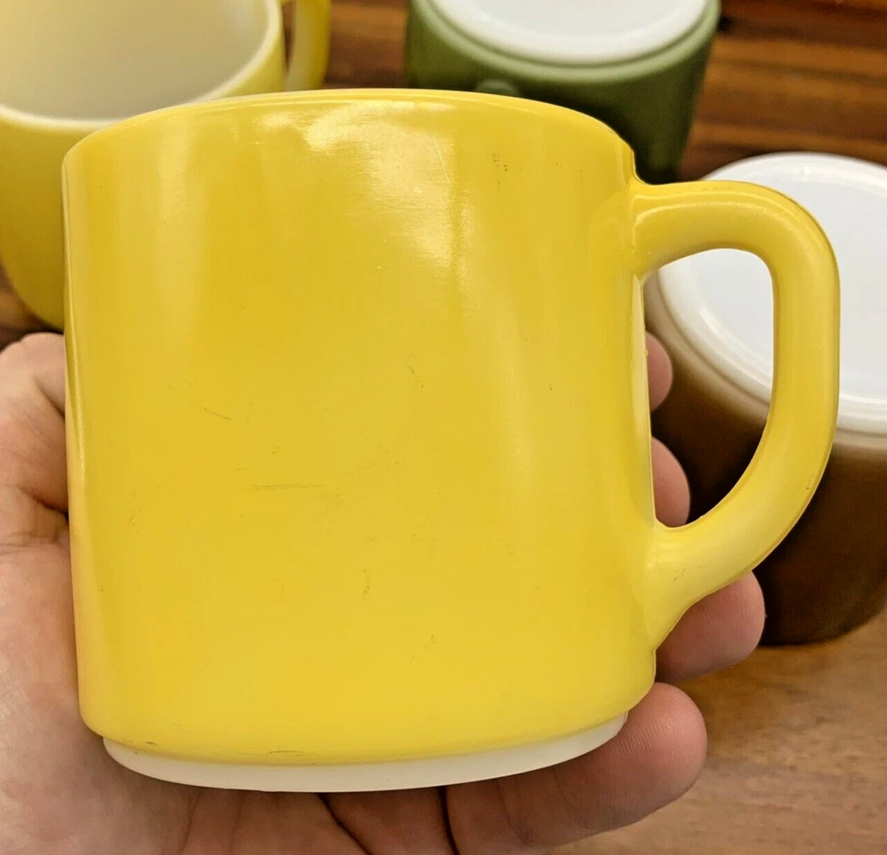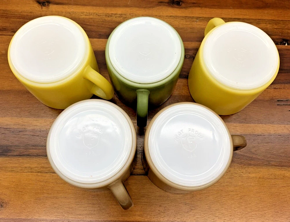 Vintage Set of 5 Federal Glass Multicolor MCM Coffee Cup Mug D Handles Yellow Brown Green In great vintage pre-owned condition, especially considering the age and use! No chips or cracks that I could find! They may show some minor marks from being used. The two yellow mugs look to have the most use to them (pictures attached). The two brown and one green are excellent! Yellow - 2 Brown - 2 Green - 1 Please zoom in on photos for a better view of the item's condition. We do our absolute best to research all items we sell. If you ever have questions, please reach out to me! We will always package items securely and with care. Thank you for viewing and please visit our store for more awesome vintage goodies!