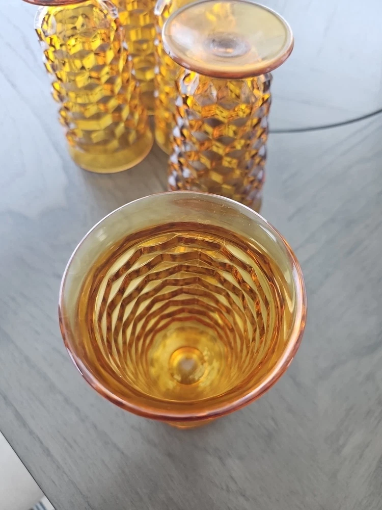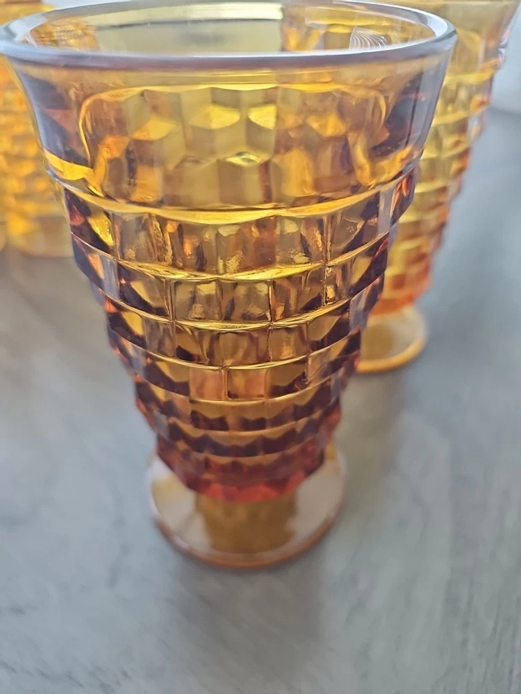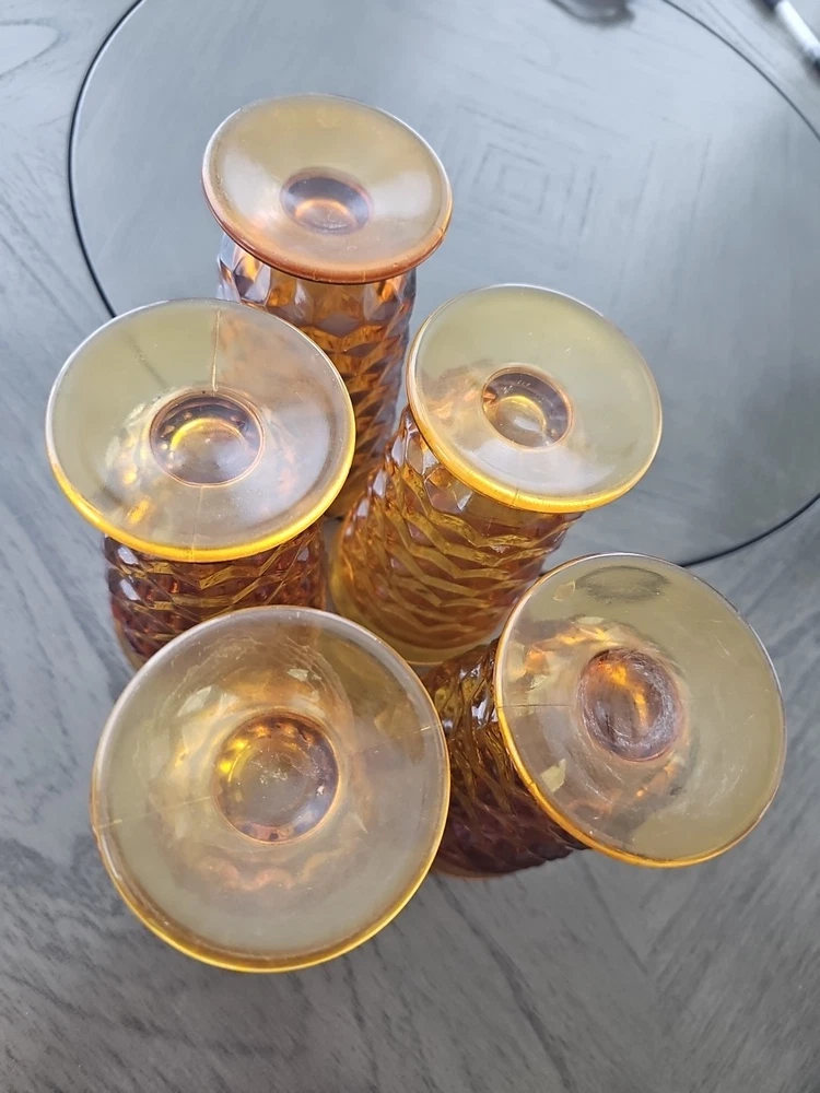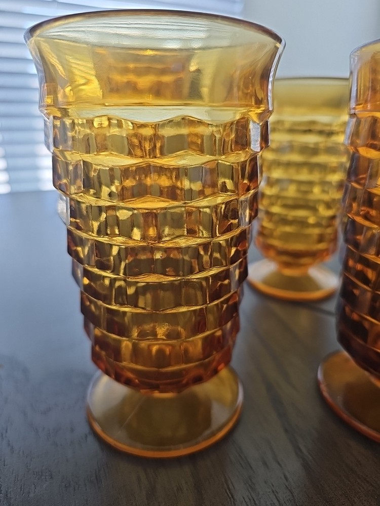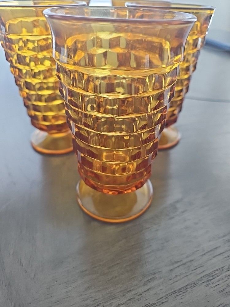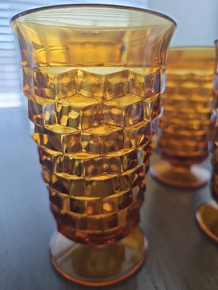 This vintage set of 5 Indiana Whitehall 6" footed glasses in amber/brown color is a charming addition to any drinkware collection. Made of glass with a round shape, these tumbler glasses exude a classic and timeless appeal. Perfect for serving beverages in style, these footed glasses add a touch of elegance to any table setting or home bar. Enjoy the rich history and quality craftsmanship of these vintage Whitehall glasses.