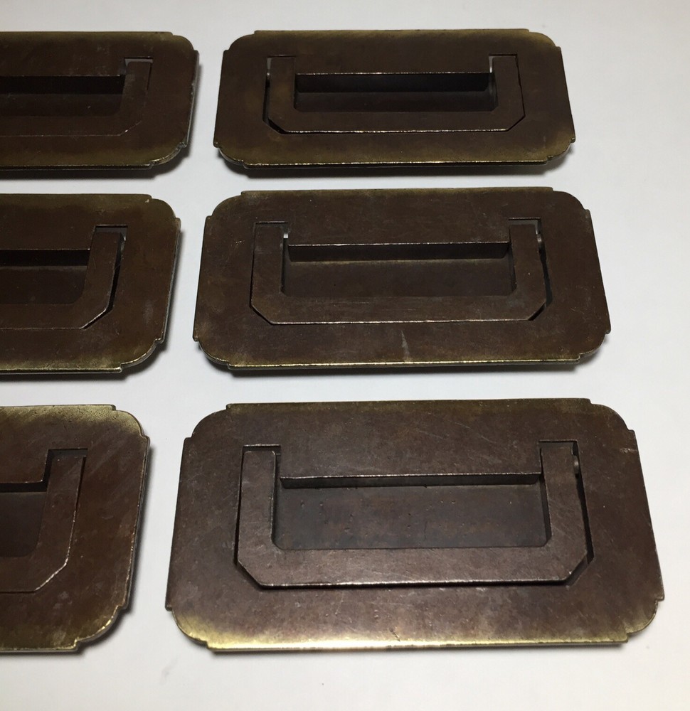 Vintage Set Of 6 Brass Drawer Cabinet Furniture Fold Out Handle Pulls. The handles are in good useable condition. The screw mounts on the back are 3” apart. All of the measurements are shown in the pictures. Please feel free to ask any questions. The lot will ship out safely and securely the same or next business day.