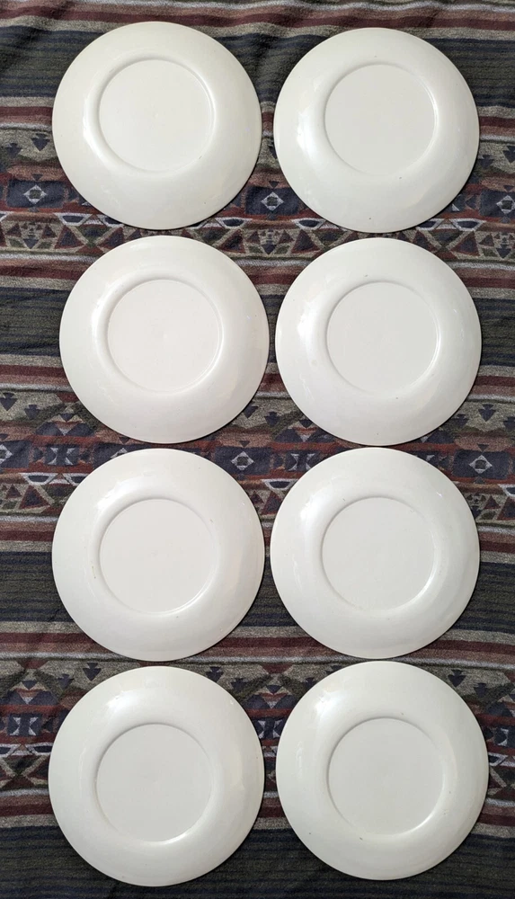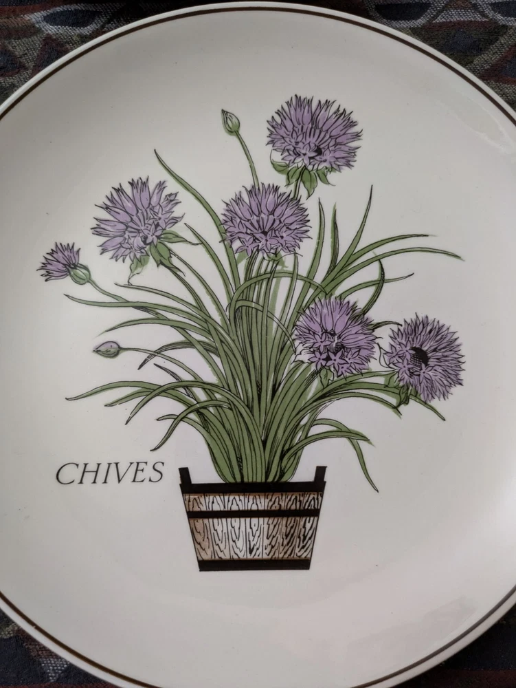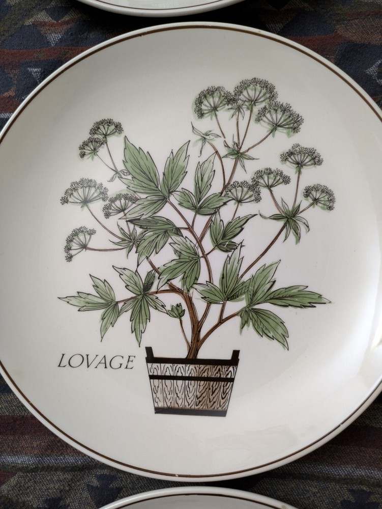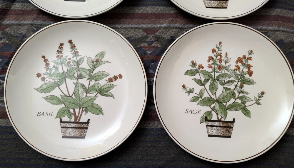 Vintage Set of 4 Herb Plates 8.5 Inch 1950s/1960s. Plates show minimal wear, some scratching from use no nicks or cracks. Each plate measures 8.25 inches across and features the name of the herb along with a colorful depiction. Plates are unmarked. Each has a small divot in the back. Each plate is a different herb. -Basil -Sage -Lovage -Dill -Chives -Borage -Paraley -Mustard