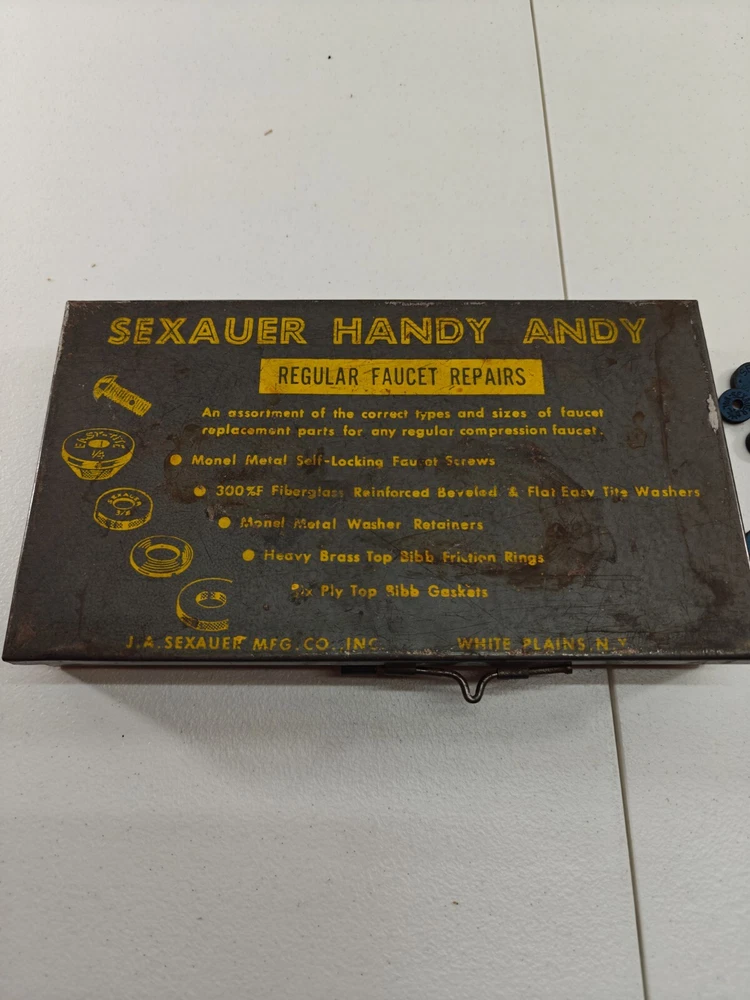 Sexauer Handyman repair kit with assorted gaskets, washers, and screws for plumbing repairs.