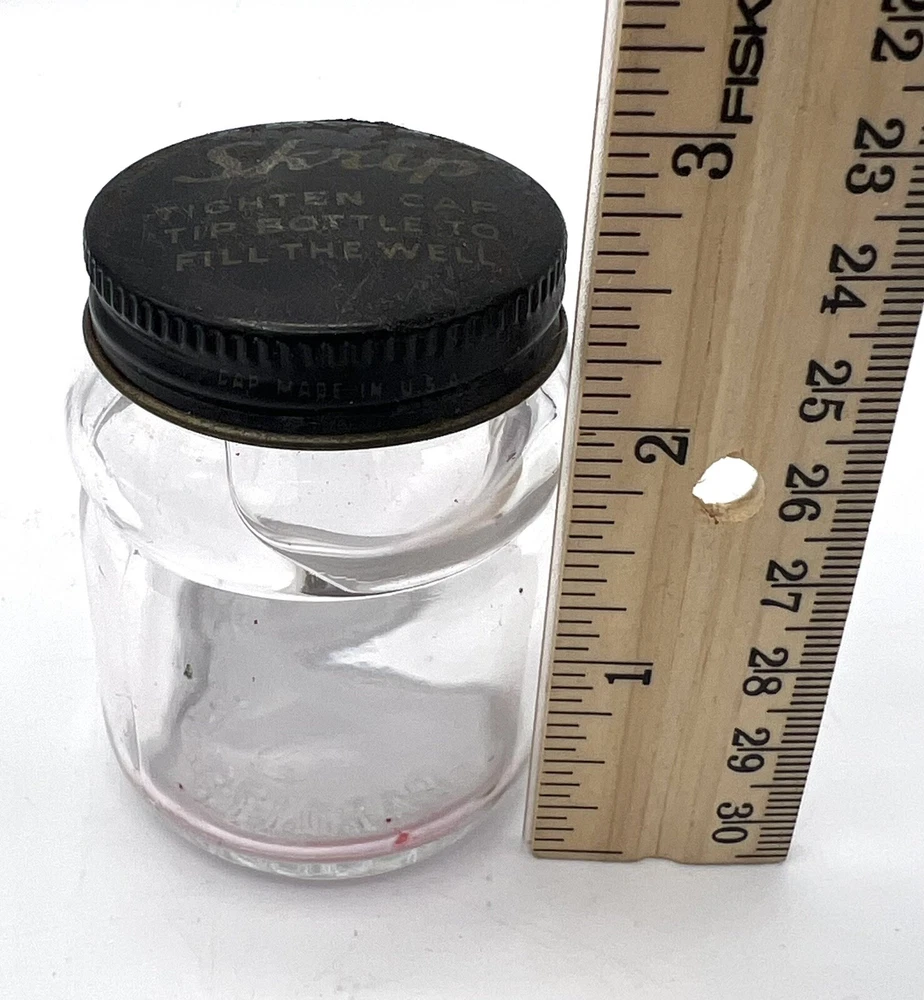 This vintage Sheaffer glass skrip ink bottle with lid is a great addition to any penmanship enthusiast's collection. The clear ink color and glass material make it a stylish and durable option for those who love to write. Its unique design, with a patent number of 1759866, adds to its value as a collectible item. This ink bottle was made in the United States and is in excellent condition, with no modifications. It is a great option for those who appreciate vintage items and want to add a unique touch to their writing accessories.