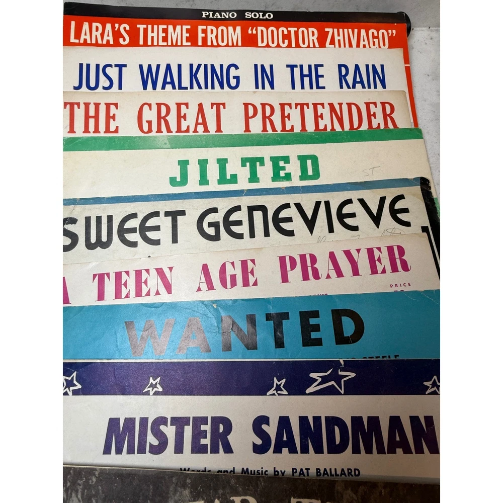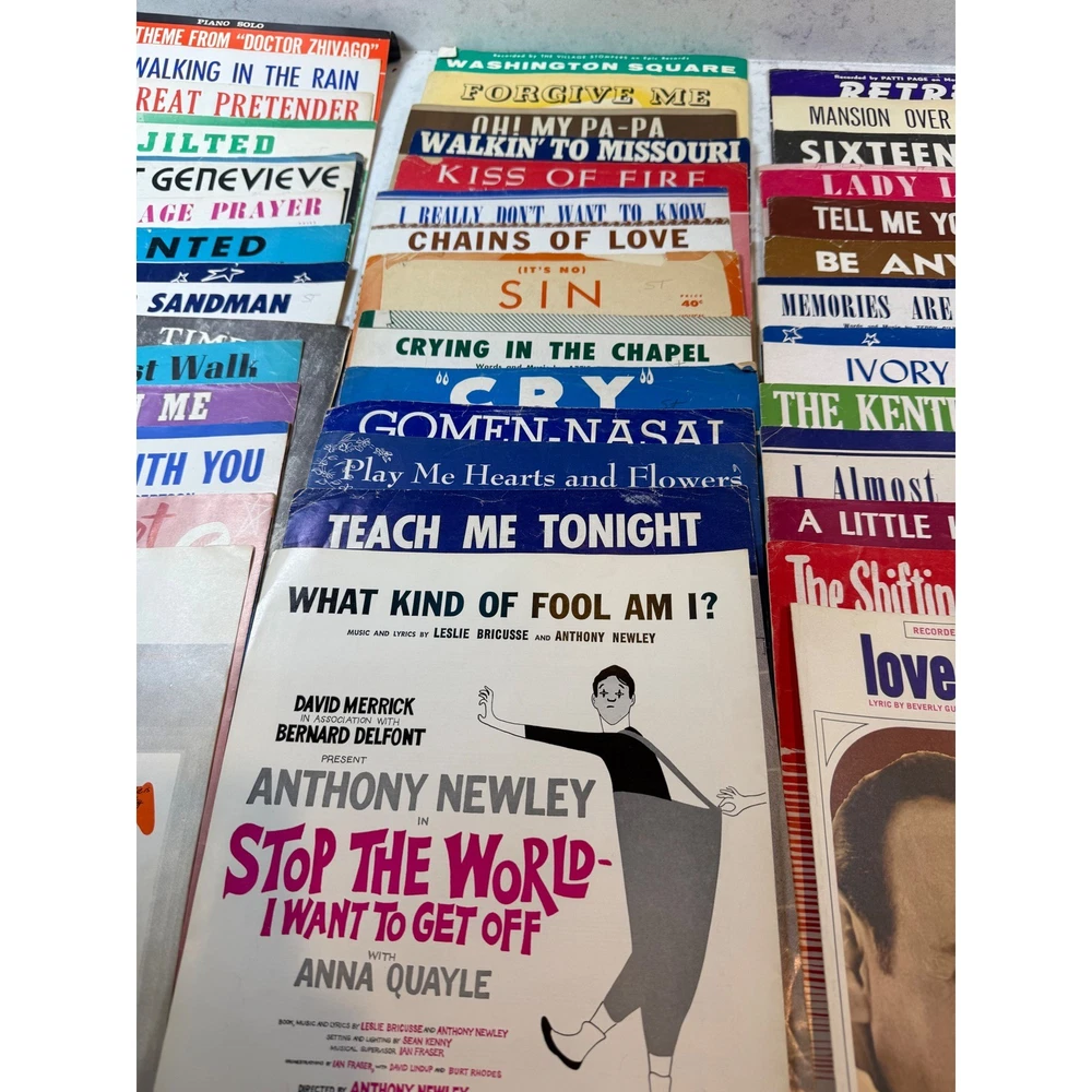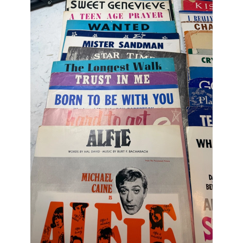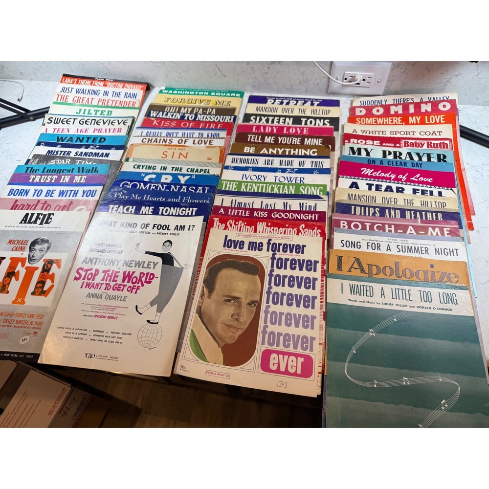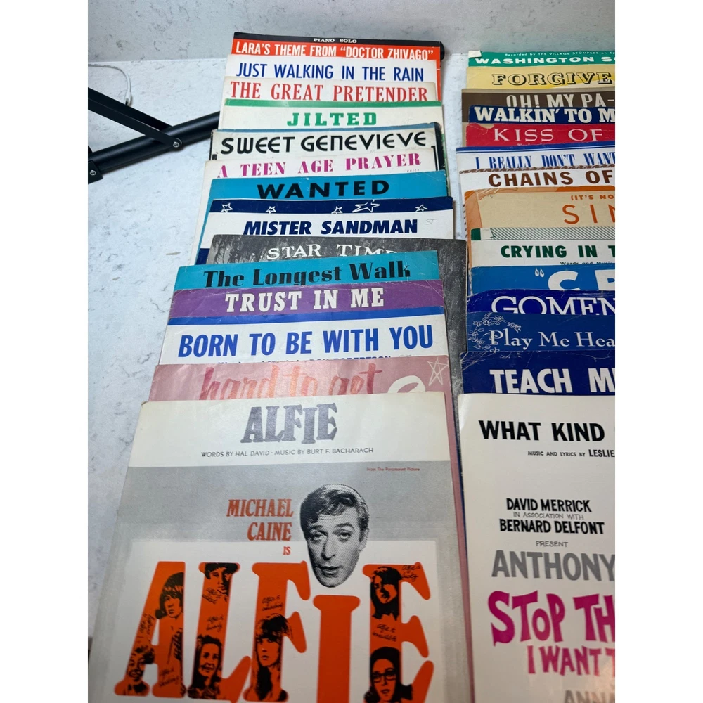 Large collection of vintage sheet music featuring popular songs and movie themes from the 1950s and 1960s. This lot includes iconic titles such as "Alfie" (featuring Michael Caine), "Mister Sandman," "Sixteen Tons," and "Lara's Theme" from Doctor Zhivago. Many pieces showcase vibrant mid-century cover art and typography, making them excellent for musicians, collectors, or as decorative ephemera. The collection spans various genres including pop standards, show tunes, and film scores, with some copies bearing light age-appropriate wear or vintage shop stamps. Keywords: Mid Century Modern, MCM, 1950s, 1960s, Ephemera, Paper Americana, Songbook, Piano Music, Retro Decor, Junk Journal, Scrapbooking, Movie Memorabilia, Musical Theatre, Pop Standards, Old Hollywood