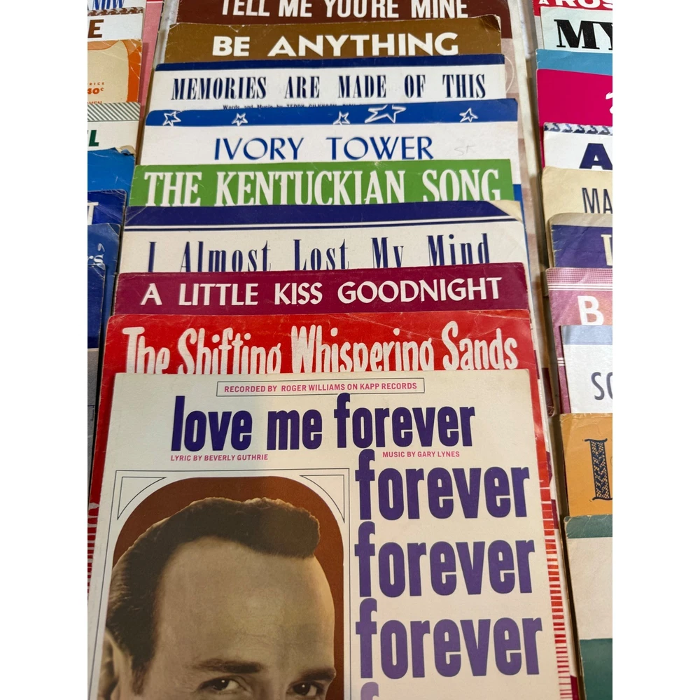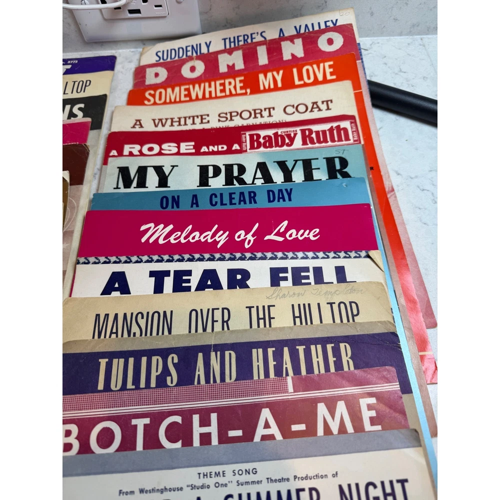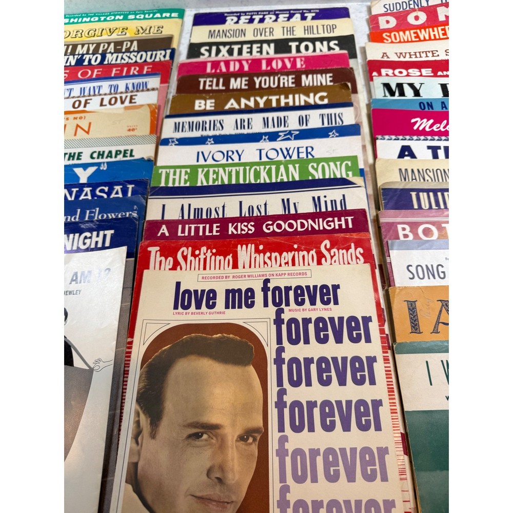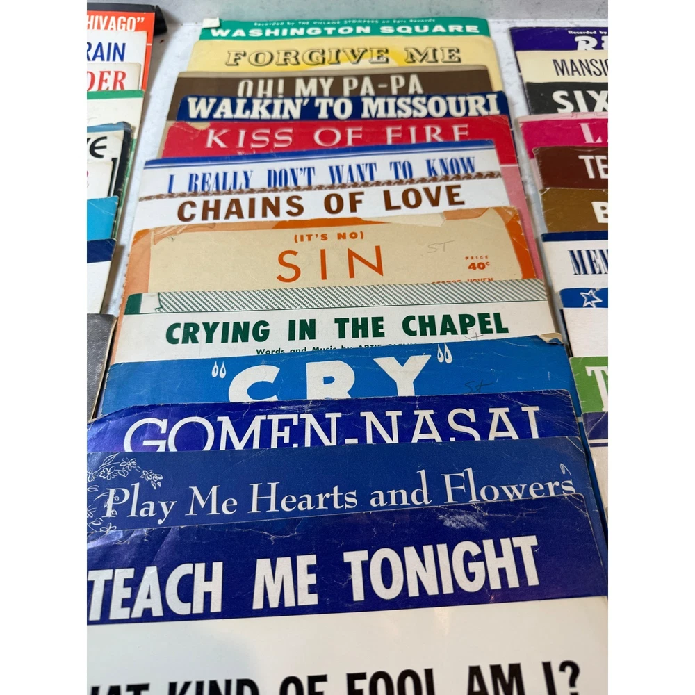 Large collection of vintage sheet music featuring popular songs and movie themes from the 1950s and 1960s. This lot includes iconic titles such as "Alfie" (featuring Michael Caine), "Mister Sandman," "Sixteen Tons," and "Lara's Theme" from Doctor Zhivago. Many pieces showcase vibrant mid-century cover art and typography, making them excellent for musicians, collectors, or as decorative ephemera. The collection spans various genres including pop standards, show tunes, and film scores, with some copies bearing light age-appropriate wear or vintage shop stamps. Keywords: Mid Century Modern, MCM, 1950s, 1960s, Ephemera, Paper Americana, Songbook, Piano Music, Retro Decor, Junk Journal, Scrapbooking, Movie Memorabilia, Musical Theatre, Pop Standards, Old Hollywood