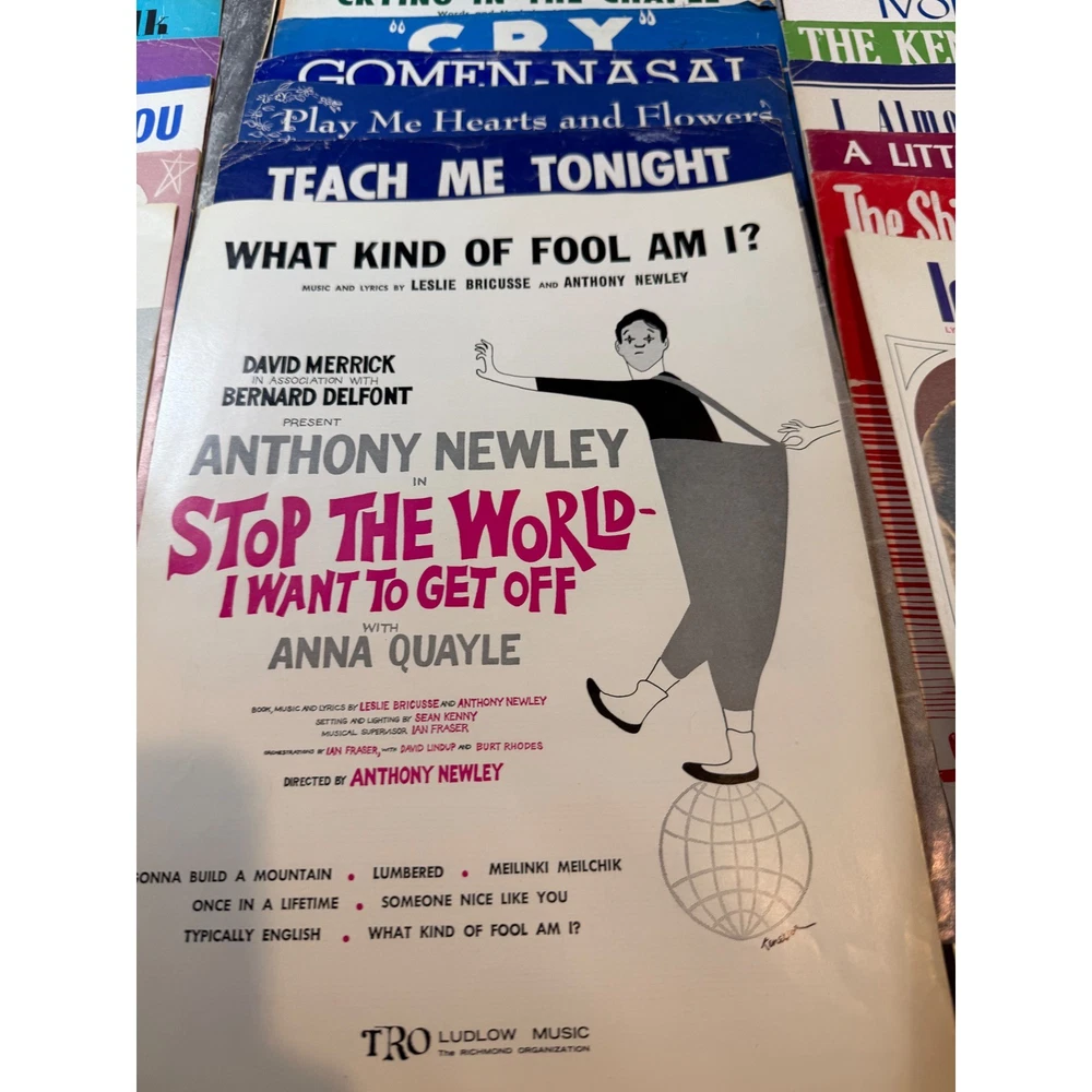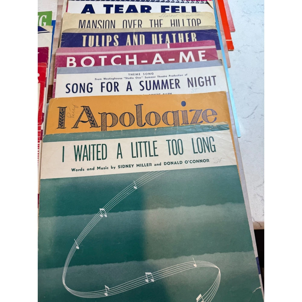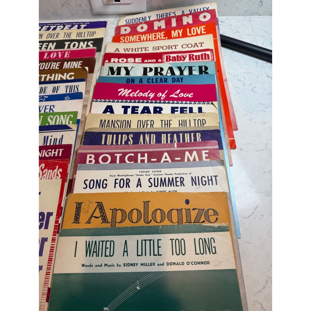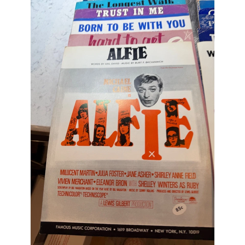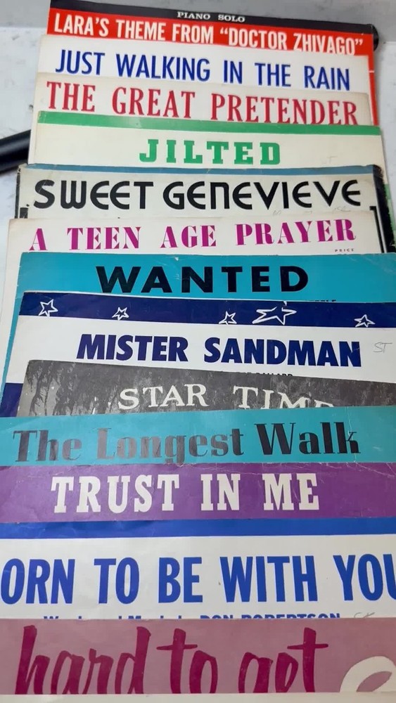 Large collection of vintage sheet music featuring popular songs and movie themes from the 1950s and 1960s. This lot includes iconic titles such as "Alfie" (featuring Michael Caine), "Mister Sandman," "Sixteen Tons," and "Lara's Theme" from Doctor Zhivago. Many pieces showcase vibrant mid-century cover art and typography, making them excellent for musicians, collectors, or as decorative ephemera. The collection spans various genres including pop standards, show tunes, and film scores, with some copies bearing light age-appropriate wear or vintage shop stamps. Keywords: Mid Century Modern, MCM, 1950s, 1960s, Ephemera, Paper Americana, Songbook, Piano Music, Retro Decor, Junk Journal, Scrapbooking, Movie Memorabilia, Musical Theatre, Pop Standards, Old Hollywood