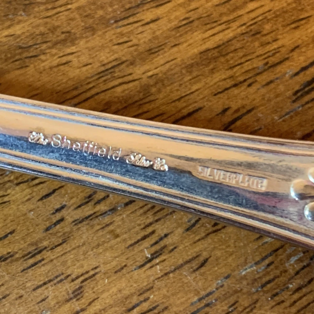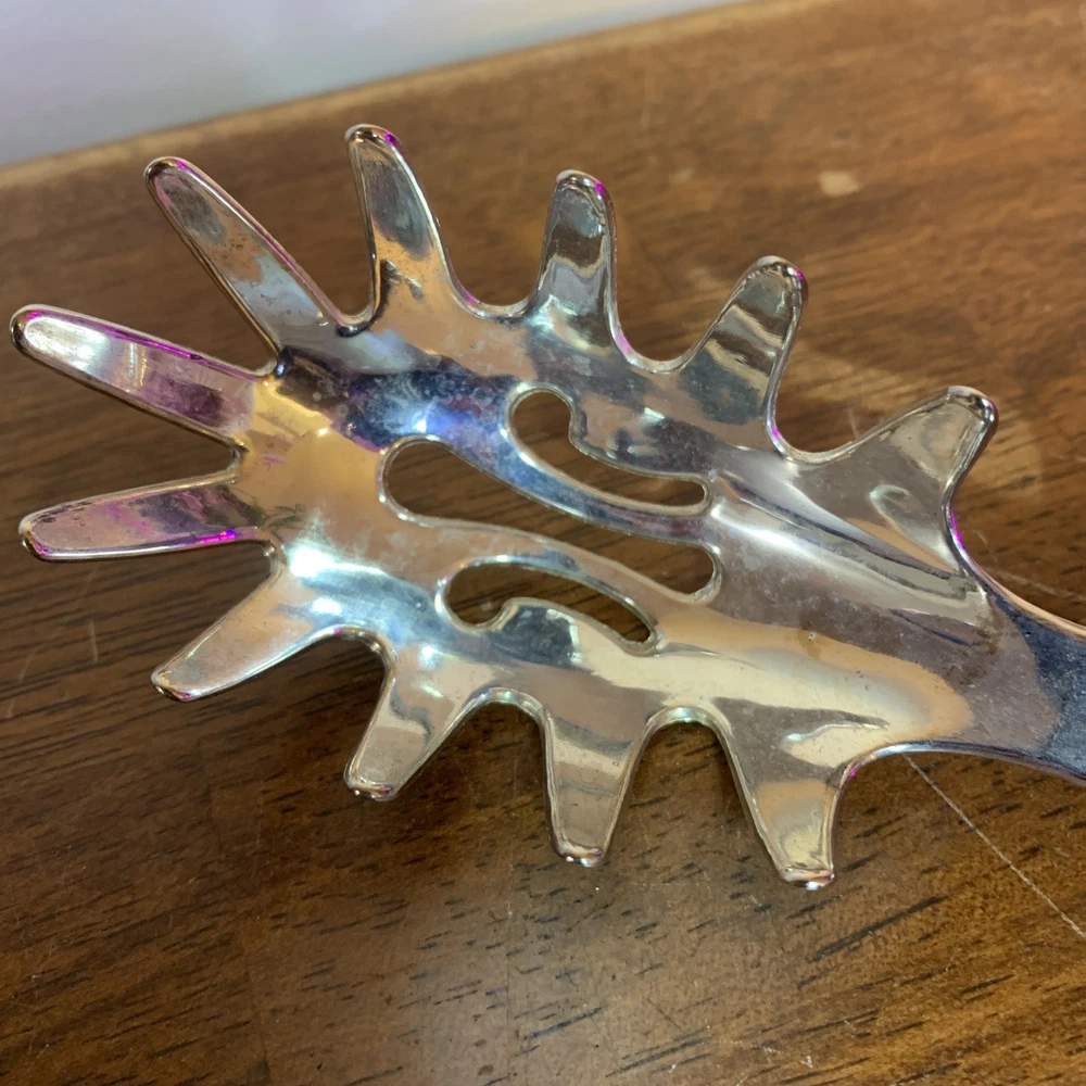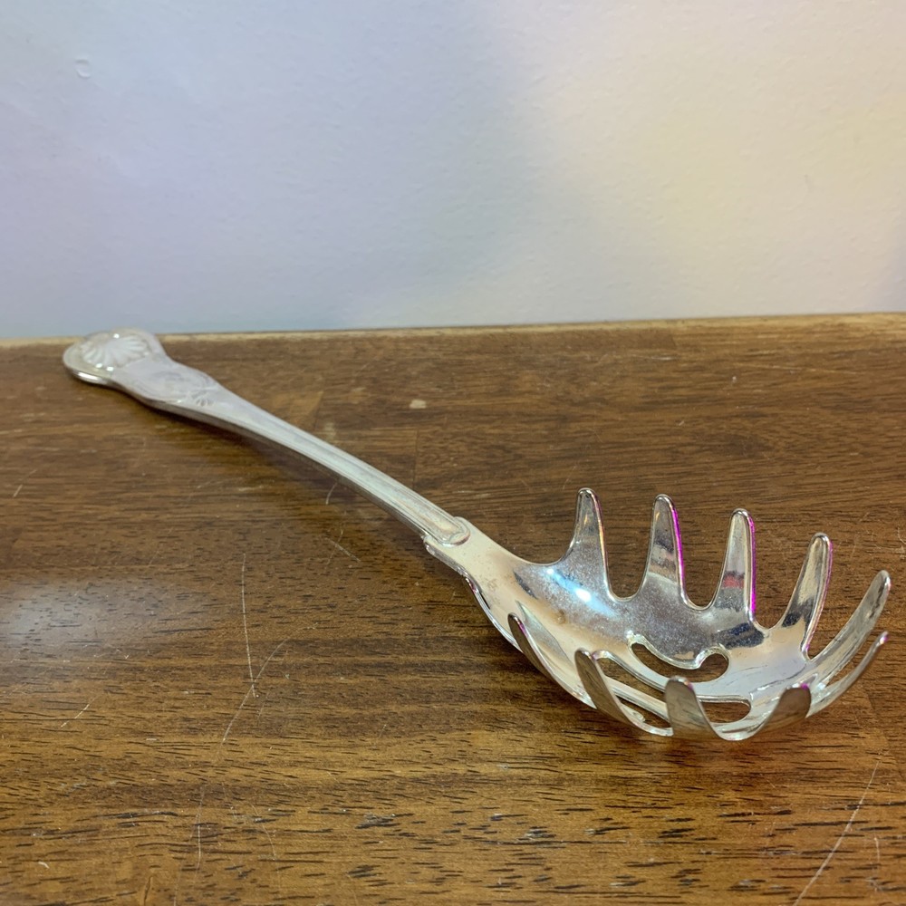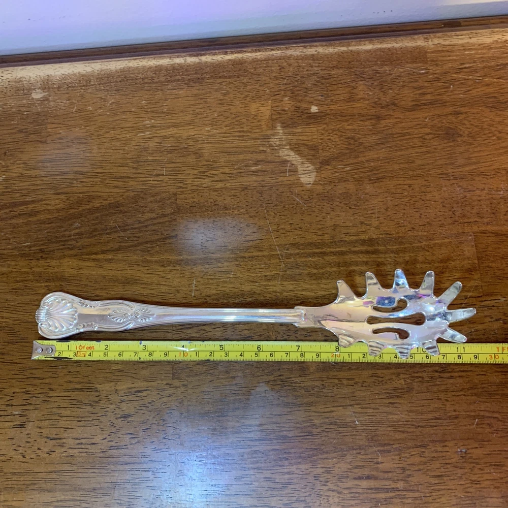 This vintage Sheffield Silver Co. 11" Silverplate Pasta Spoon Utensil is a high-quality silver utensil made in Italy. The spoon features a classic design with a beautiful silverplate finish, perfect for serving pasta or other dishes. Made by the renowned brand Sheffield, this pasta spoon is a timeless piece that adds a touch of elegance to any dining table. Ideal for collectors or those looking for unique and stylish silverware for their kitchen. Good condition but has wear from use and age.