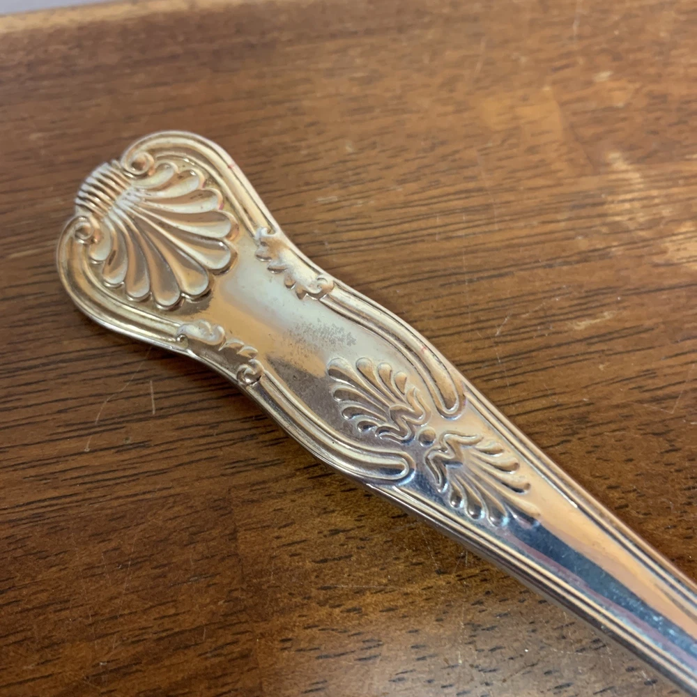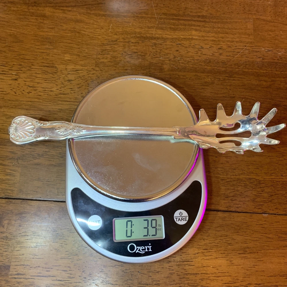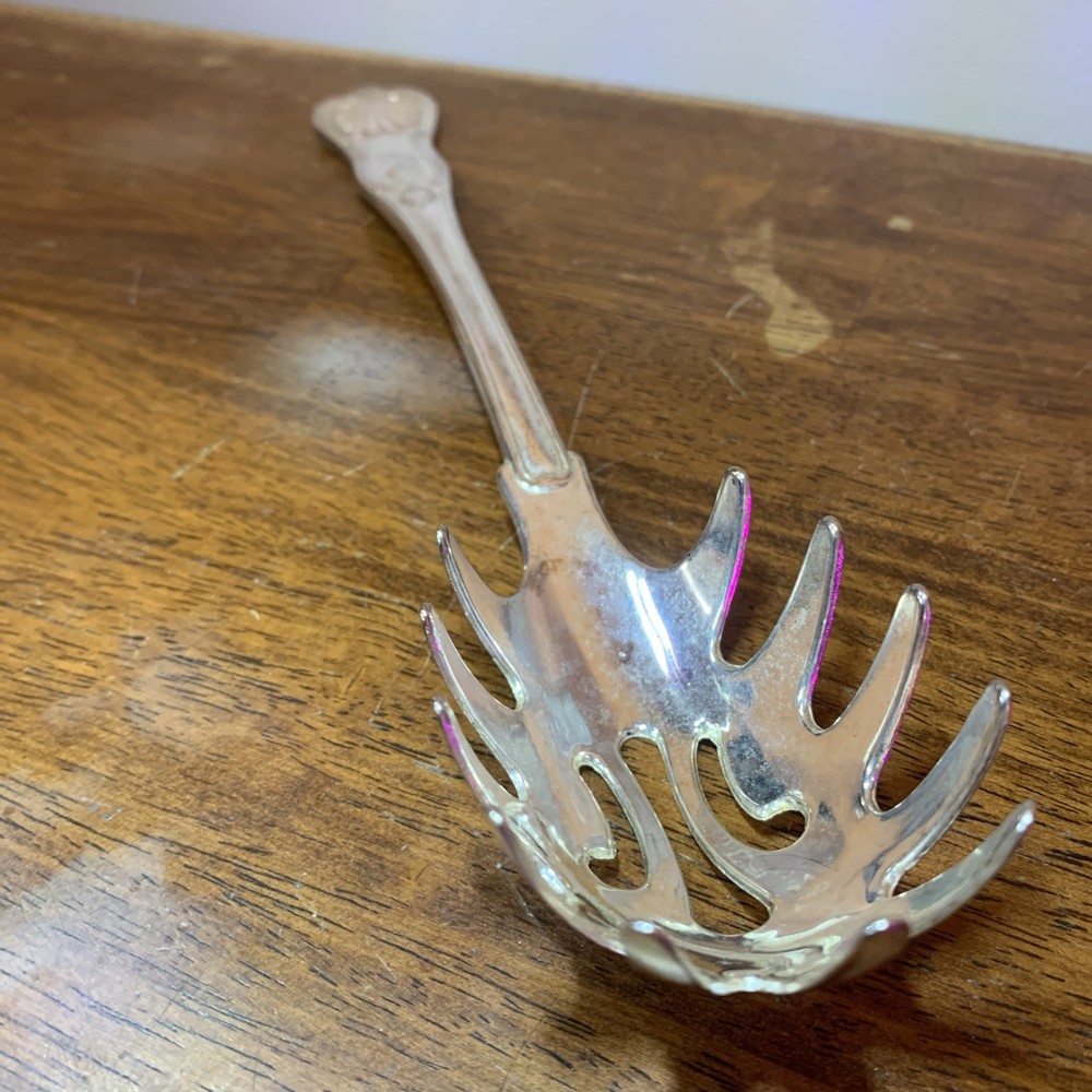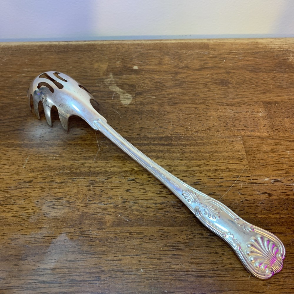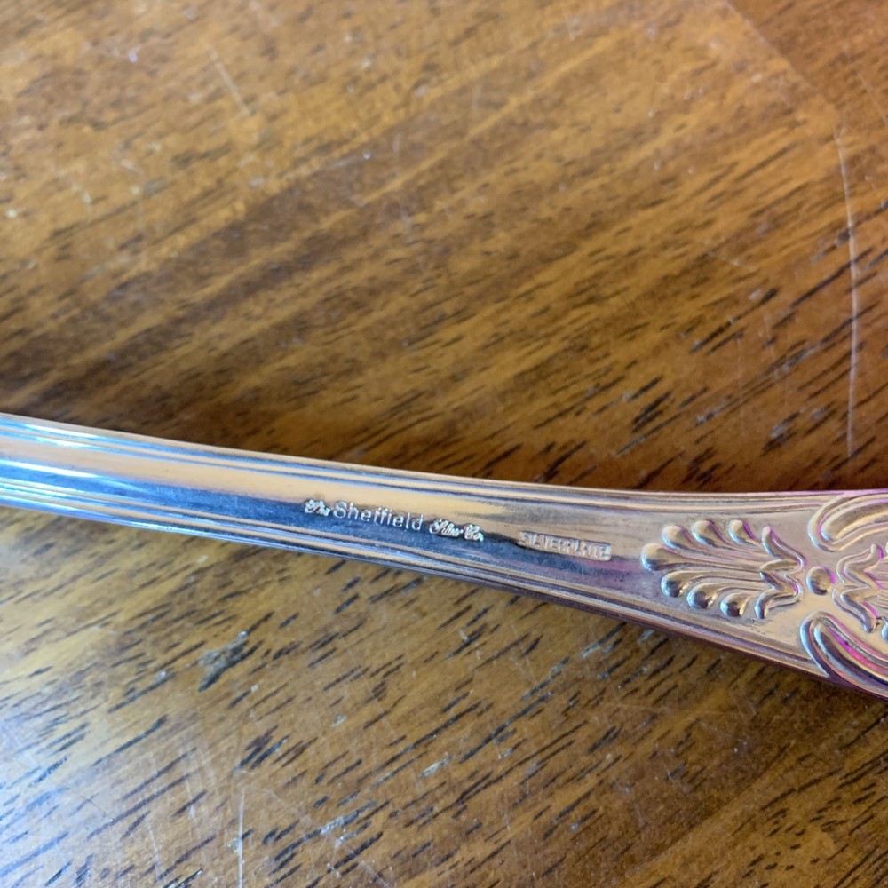This vintage Sheffield Silver Co. 11" Silverplate Pasta Spoon Utensil is a high-quality silver utensil made in Italy. The spoon features a classic design with a beautiful silverplate finish, perfect for serving pasta or other dishes. Made by the renowned brand Sheffield, this pasta spoon is a timeless piece that adds a touch of elegance to any dining table. Ideal for collectors or those looking for unique and stylish silverware for their kitchen. Good condition but has wear from use and age.