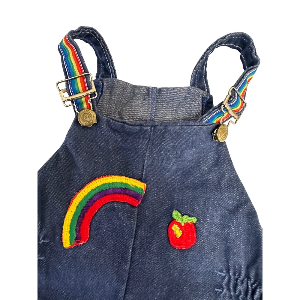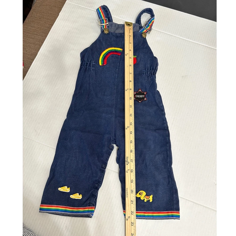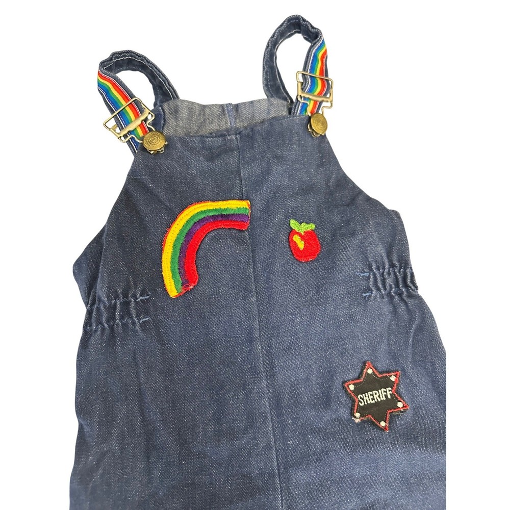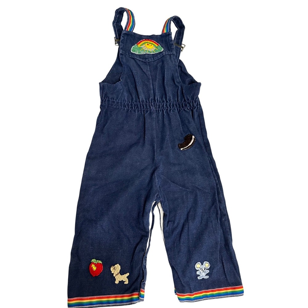 Vintage denim overalls featuring adorable rainbow and character patches. These overalls have adjustable straps with metal buckles, a comfortable elastic waistband, and snap closures along the inseam for easy changing. The charming patches include a rainbow, apple, sheriff star, shoes, dog, and mouse, adding a playful touch to this classic piece. The rainbow trim at the bottom of the legs completes the look. Color: Blue Department: Girls Type: One-Piece Style: Overall Fabric Type: Denim Material: Cotton Blend, 100% Cotton, Polyester Blend, Denim Pattern: Patchwork Occasion: Casual Number of Pieces: 1 Piece Keywords: vintage overalls, denim overalls, rainbow overalls, patchwork overalls, kids overalls, baby overalls, toddler overalls, 18 months, styled by the shepherd, retro clothing, vintage clothing, denim, rainbow, patches