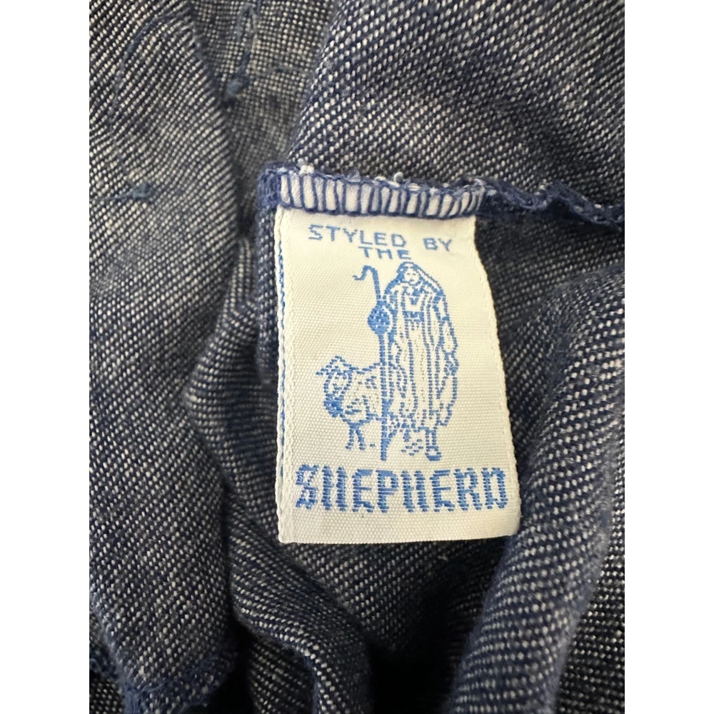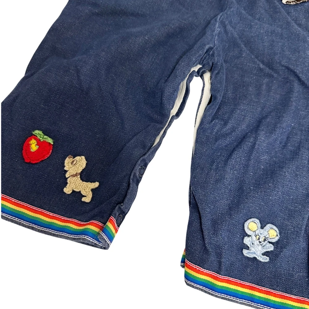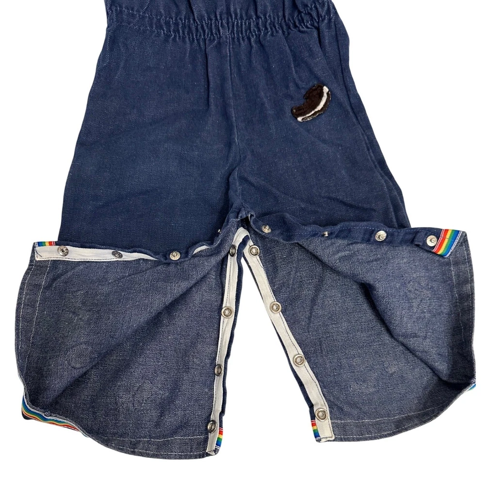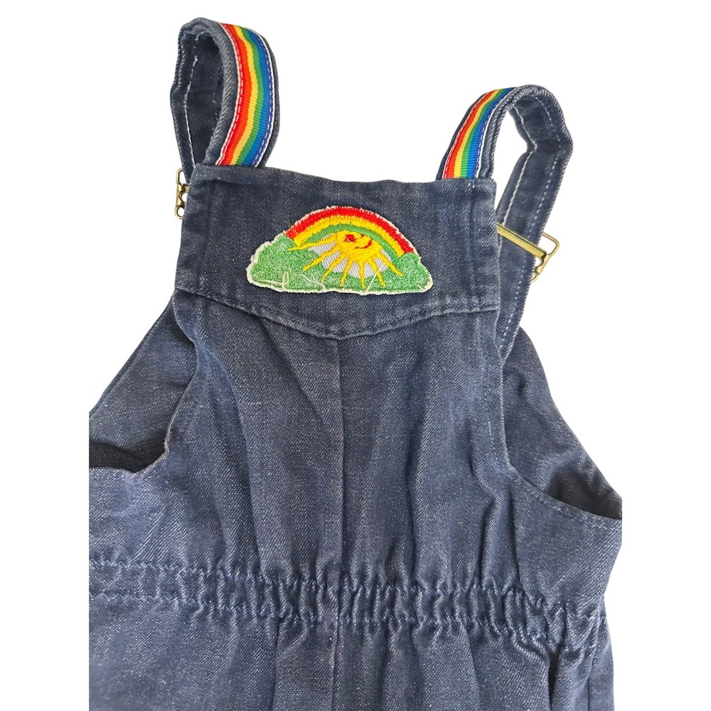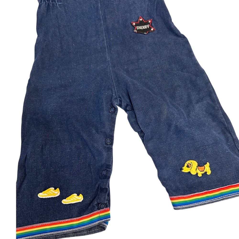Vintage denim overalls featuring adorable rainbow and character patches. These overalls have adjustable straps with metal buckles, a comfortable elastic waistband, and snap closures along the inseam for easy changing. The charming patches include a rainbow, apple, sheriff star, shoes, dog, and mouse, adding a playful touch to this classic piece. The rainbow trim at the bottom of the legs completes the look. Color: Blue Department: Girls Type: One-Piece Style: Overall Fabric Type: Denim Material: Cotton Blend, 100% Cotton, Polyester Blend, Denim Pattern: Patchwork Occasion: Casual Number of Pieces: 1 Piece Keywords: vintage overalls, denim overalls, rainbow overalls, patchwork overalls, kids overalls, baby overalls, toddler overalls, 18 months, styled by the shepherd, retro clothing, vintage clothing, denim, rainbow, patches