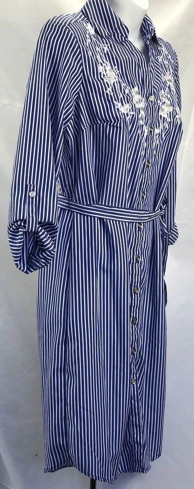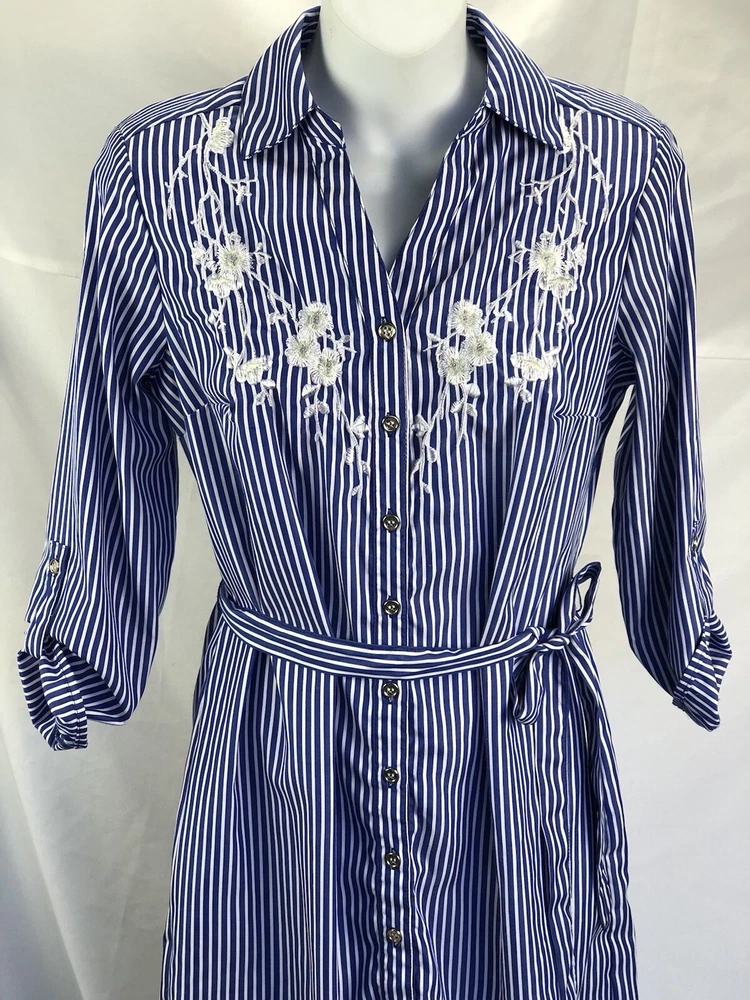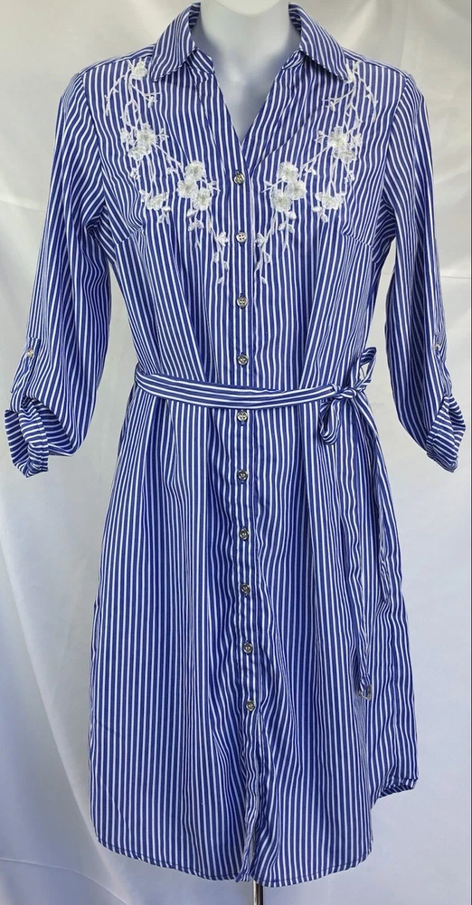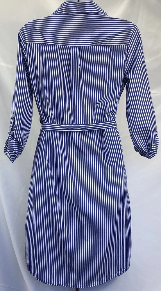 MLLE Gabrielle Shirt Dress S Blue/Wht Stripe knee length Belt Roll tab Sleeve. Chest 36" Length 37" Excellent Fashion Gem