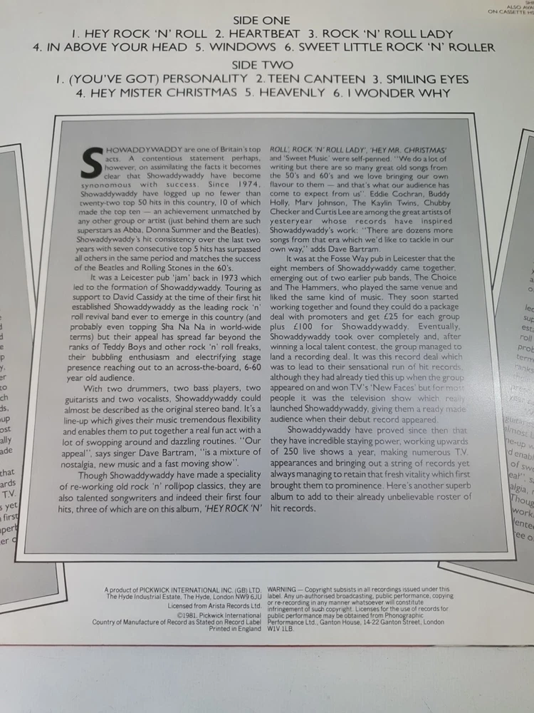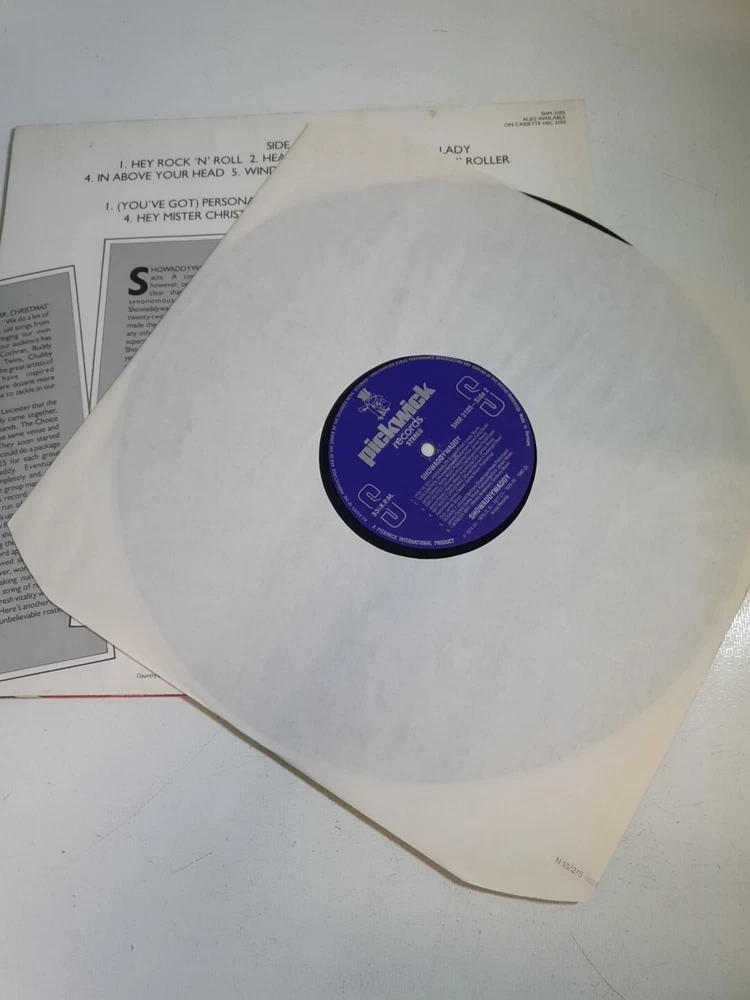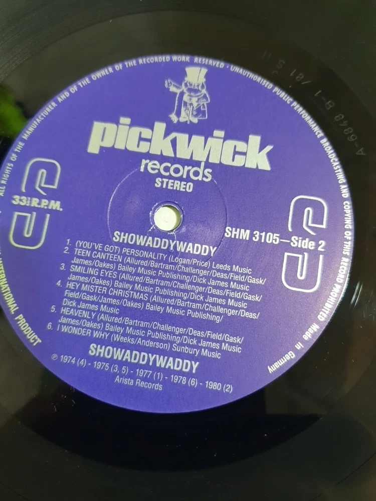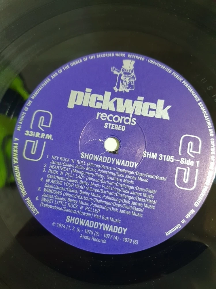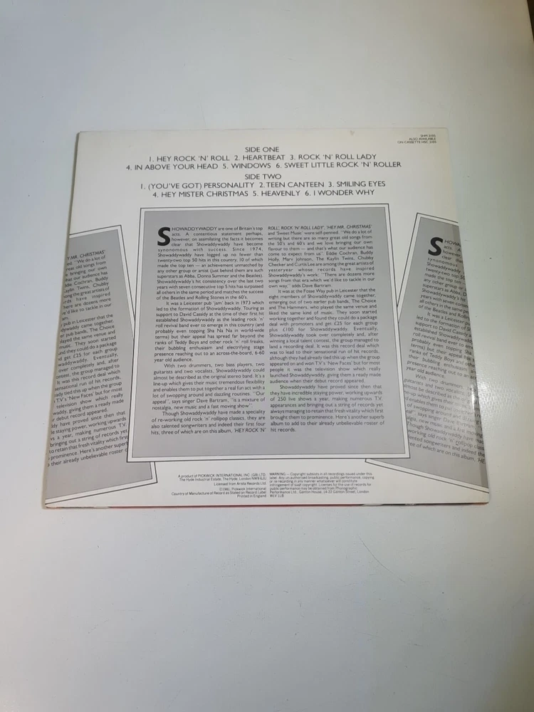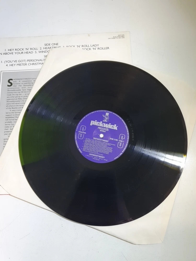 This vintage Showaddywaddy self-titled vinyl LP record is a must-have for any occasion. The 1981 release from Pickwick Records features 33 RPM speed and a cardboard sleeve case type. The black vinyl material is in excellent shape, making it a great addition to any collection. Hey Rock 'N' Roll Hey Mr Christmas I wonder why And many more ........ The LP includes original inner sleeve and cover, and is a first edition release. The record grading is near mint (NM or M-), and the sleeve grading is also excellent (EX). The album is a compilation of pop and rock 'n' roll genres from the 1970s era, and is a great choice for any music lover.