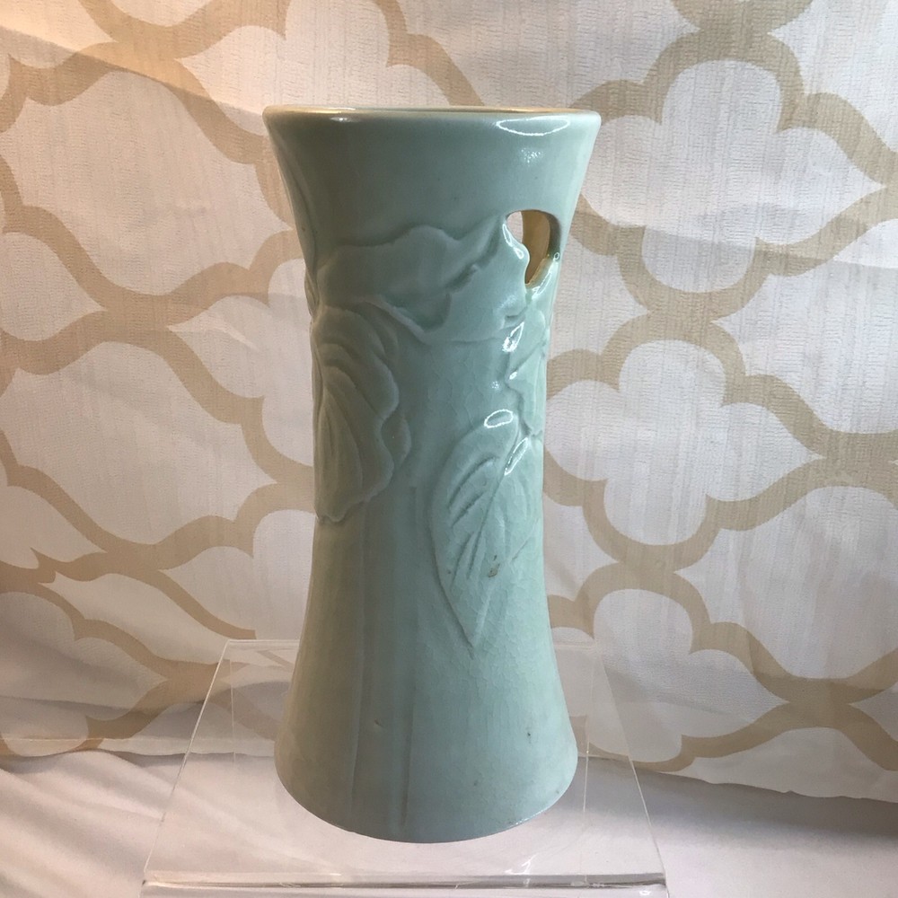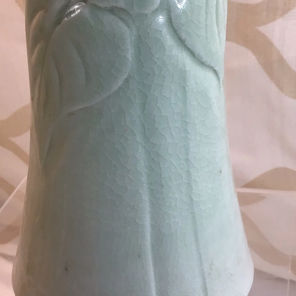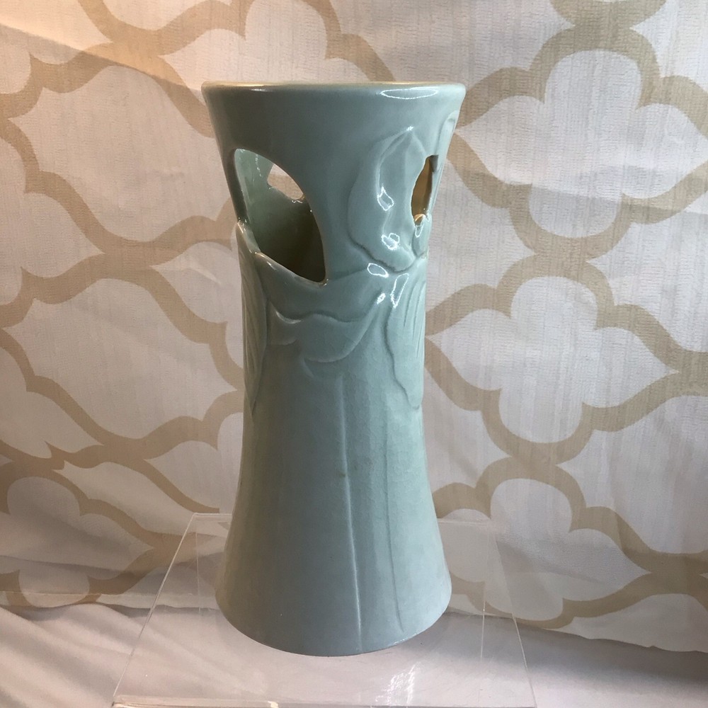 This vintage ceramic vase stands at 7 inches tall and features a green glazed finish with textured carvings. Handmade in 1985, this vase showcases a flower subject and bears a signature. Its medium size makes it suitable for various occasions and its 1980s style adds a touch of retro charm to any space. Perfect for collectors of unique decorative pieces, this original vase from the late 20th century exudes a timeless appeal with its intricate details and craftsmanship. Made in 1985, unable to decipher the signature. Has a beautiful green crackle finish with cut outs. No chips or cracks. Please look at the pictures closely, as this is the item that you will receive.