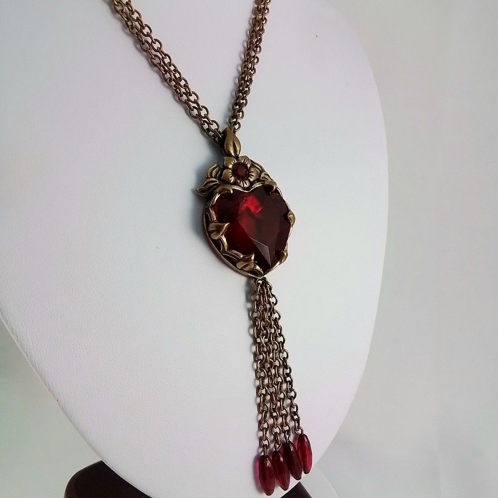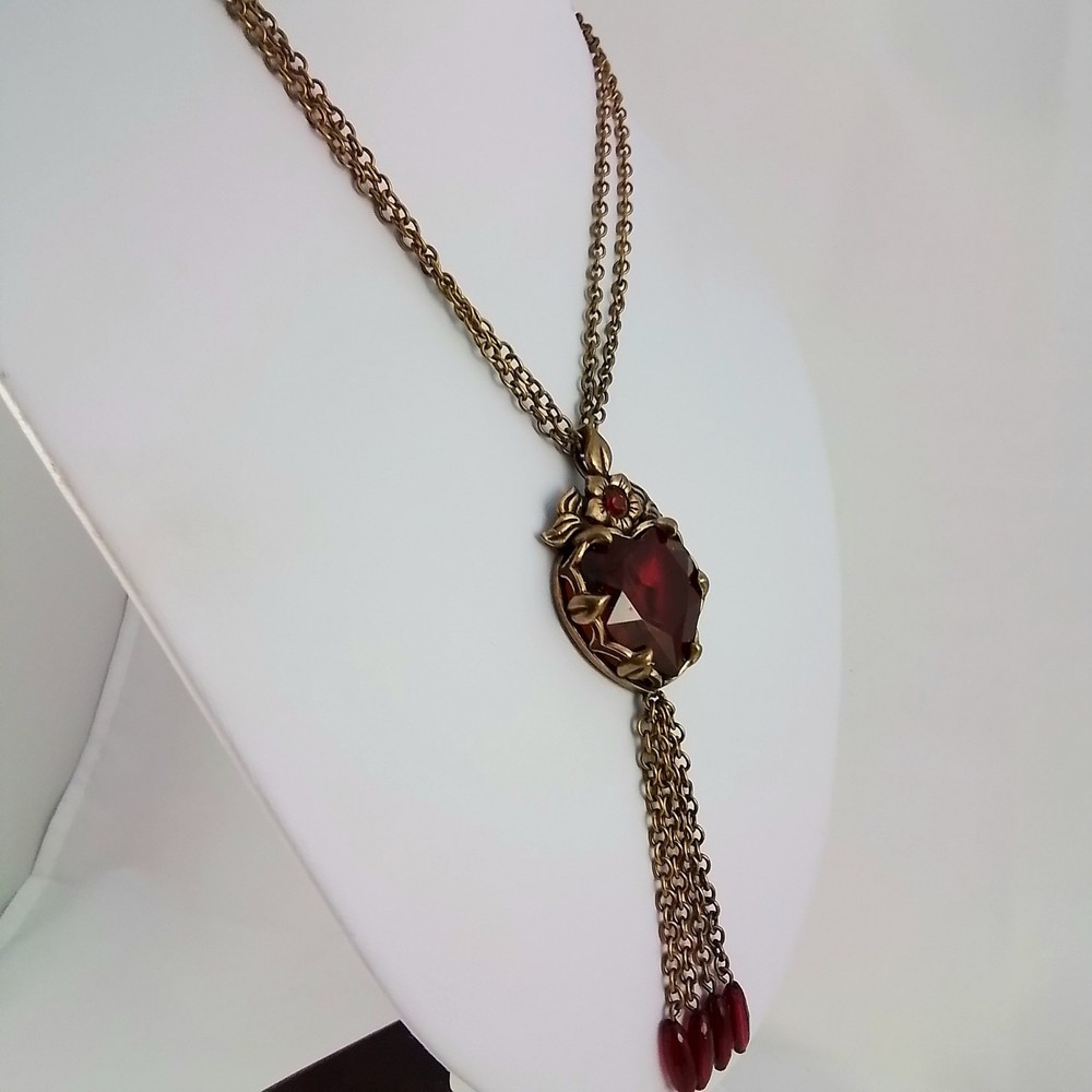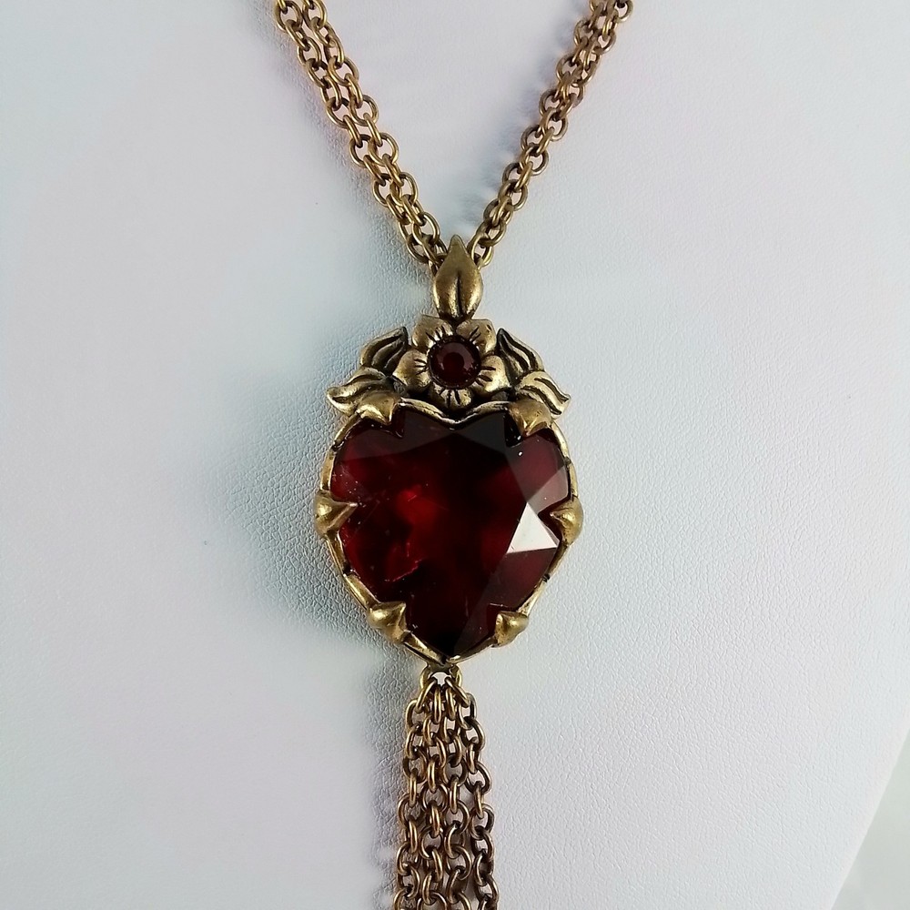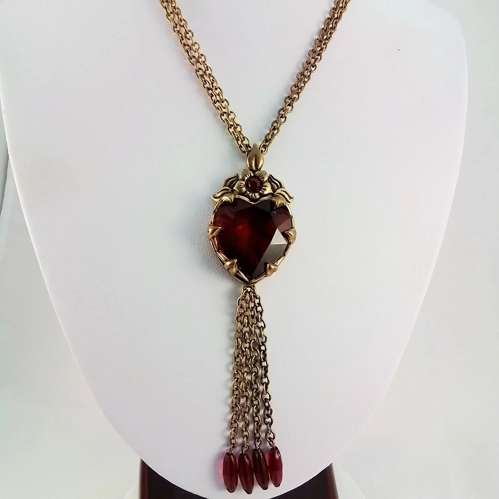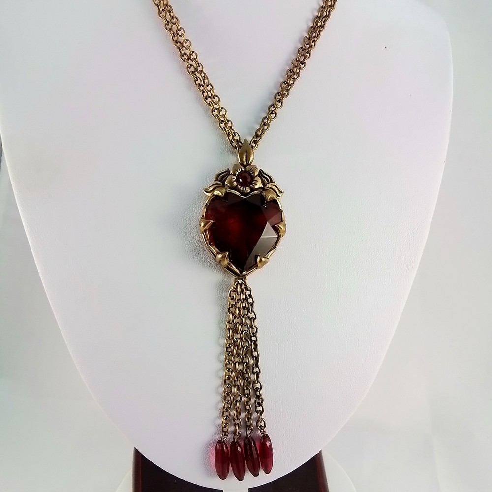Chico's Heart Pendant Necklace This is a stunning pendant by Chico's. Deep Red acrylic red cabachon with red beaded tassels. A real cool fashion piece. The necklace is 20 inches long but is adjustable. The pendant measures 4 inches, including tassels. Chico's name is attached at the clasp as well as on the back. Condition: Great vintage condition