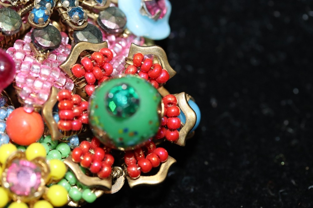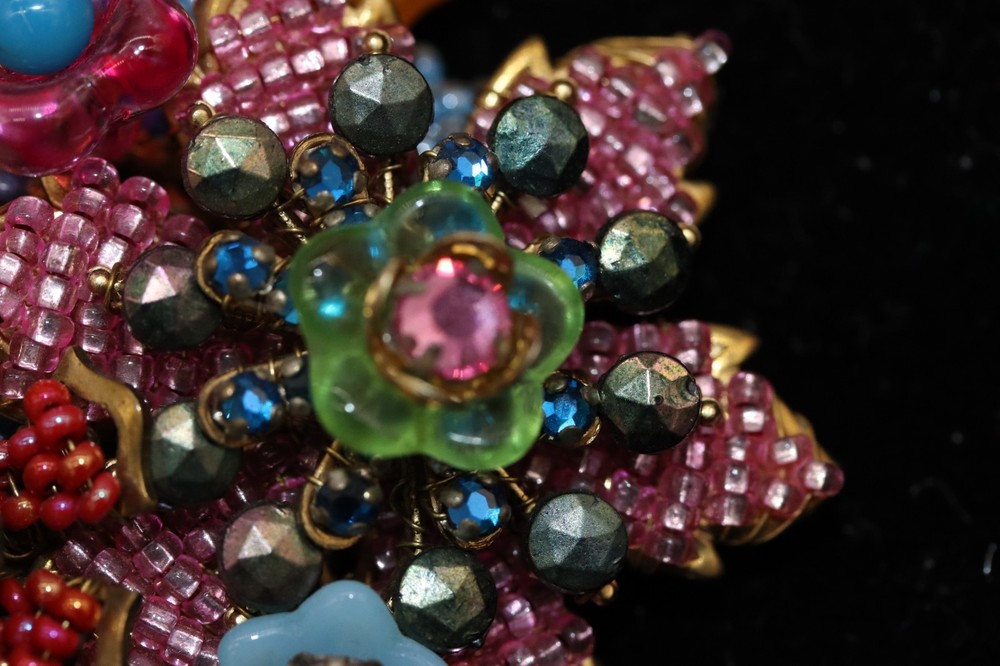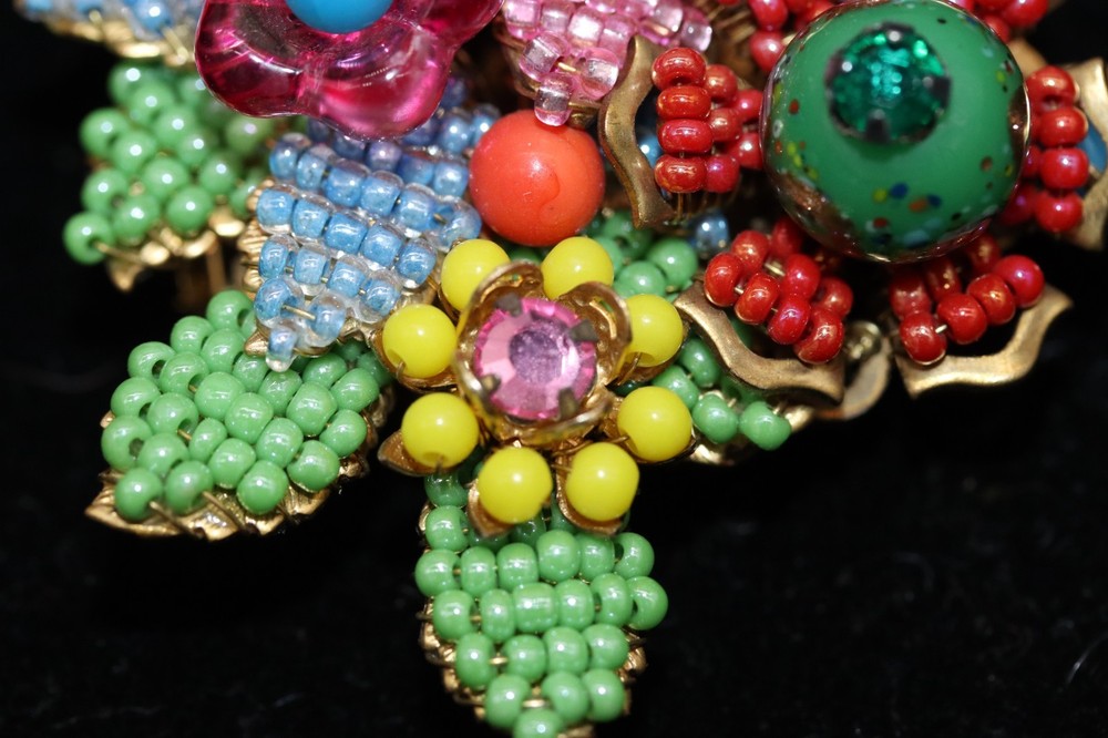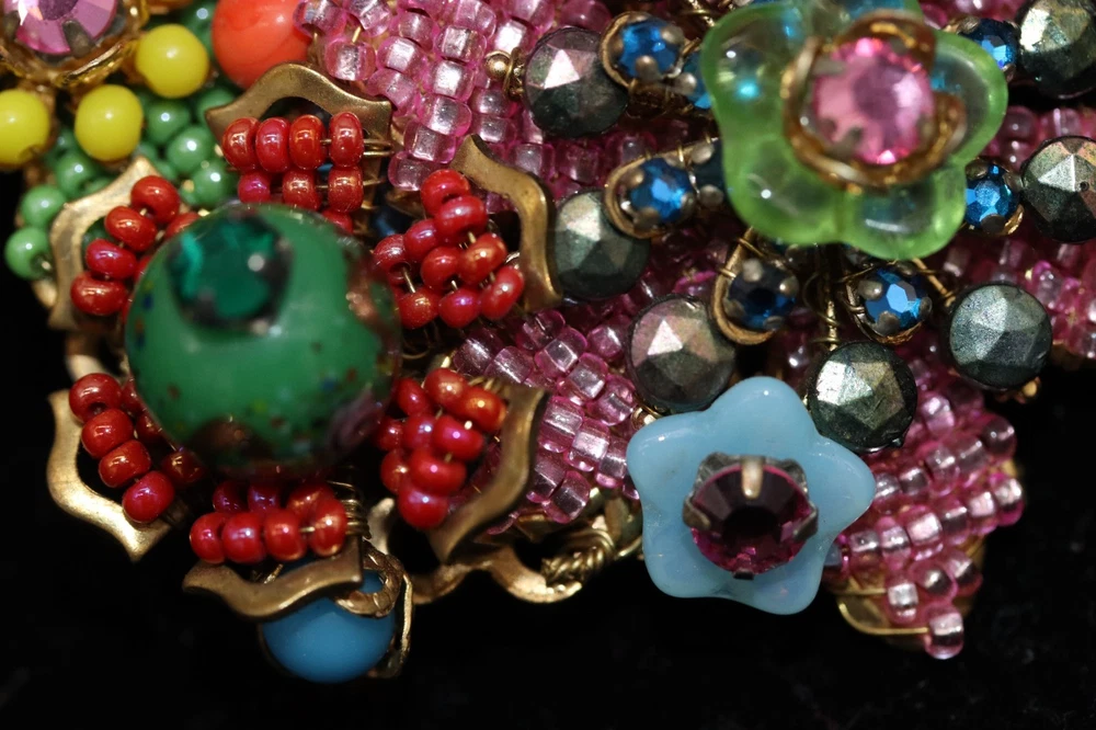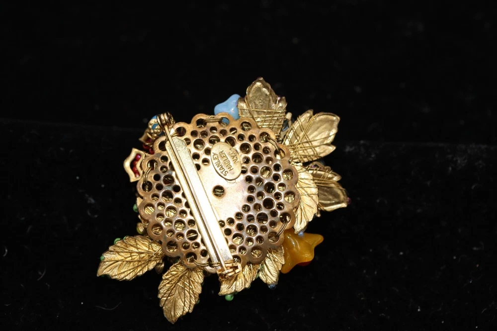 Vintage signed Stanley Hagler flower brooch. 2.5" long by 2" wide. Beautiful beadwork of greens, pinks, reds, and blues. Pressed glass flowers of blue, orange, pink and green. Flowers have rhinestones or beads in the centers. One green glass bead that is painted. Has a rollover clasp on back that works perfectly. Marked Stanley Hagler NYC on back. No missing stones or beads. Mint condition.