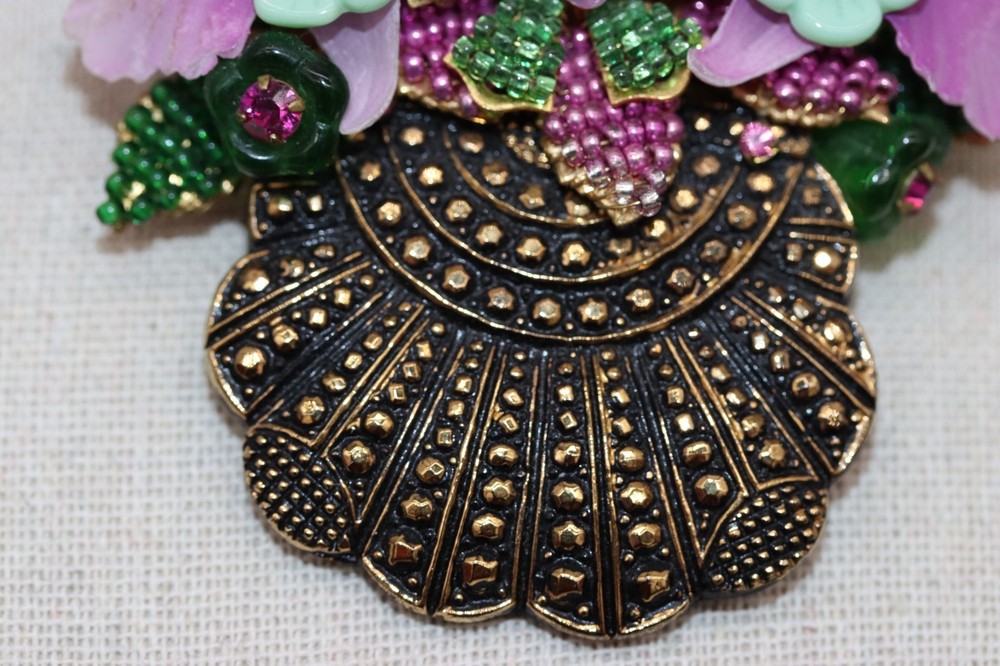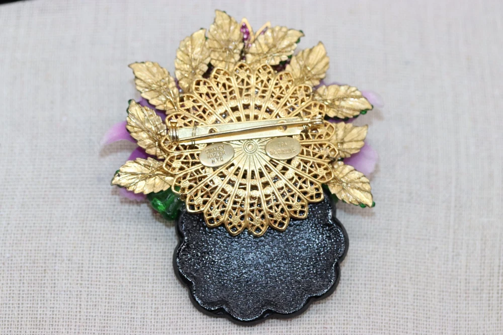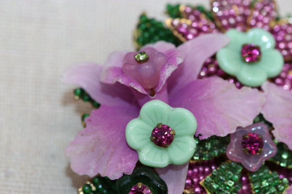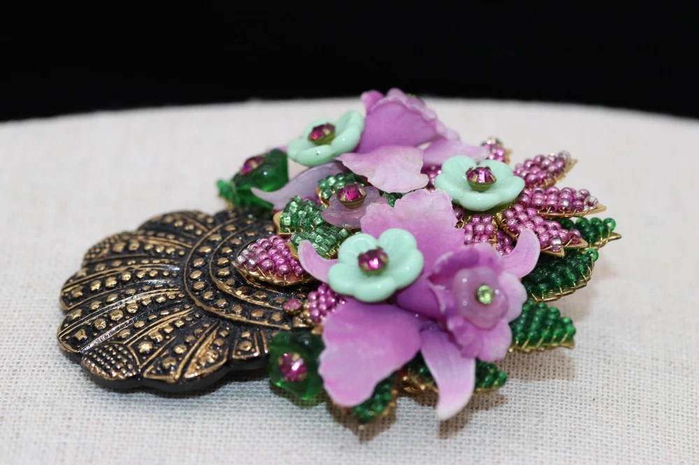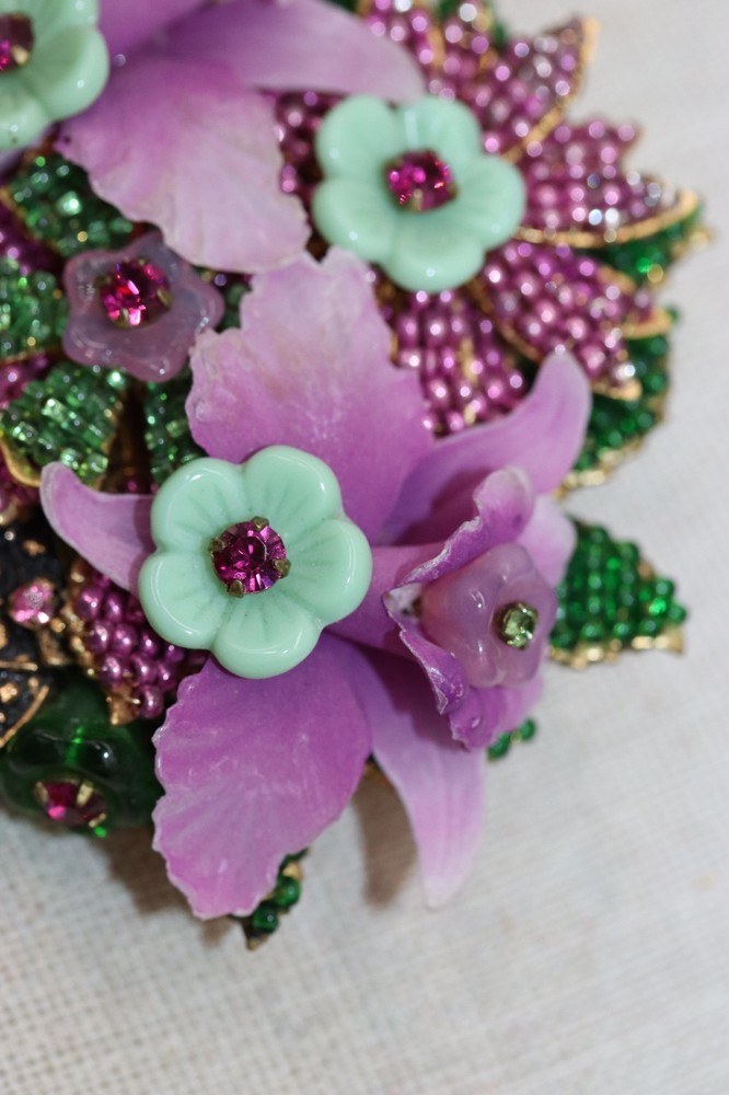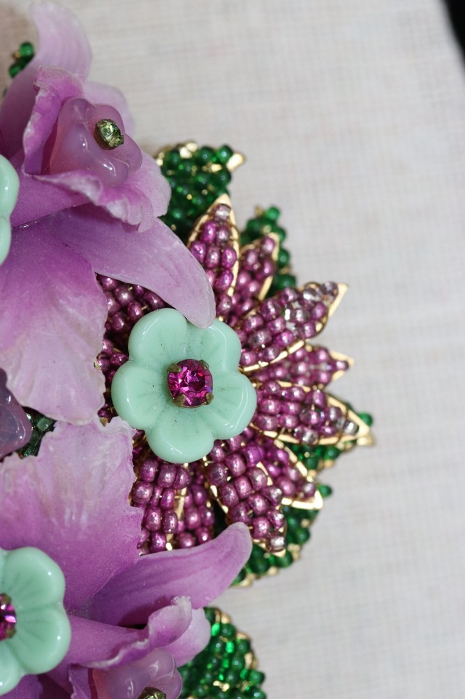 Vintage signed Orchids Floral Bouquet brooch. 3" long by 2.5" wide. Beadwork, pressed glass, and rhinestone flowers set against a gold tone background basket/vase. Please see pictures. Colors of lavender purple and green. Marked on back, Stanley Hagler and Ian St Gielar. There are no missing stones or chips to glass. Mint condition.