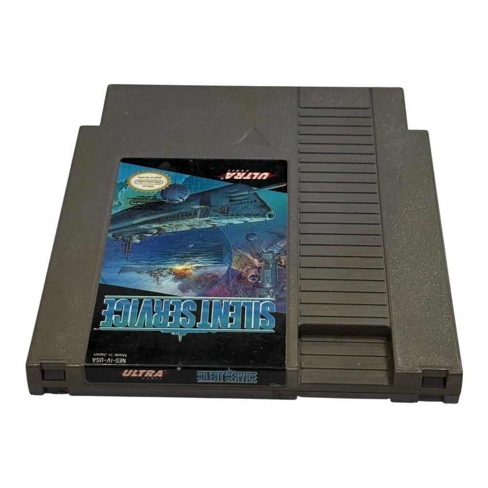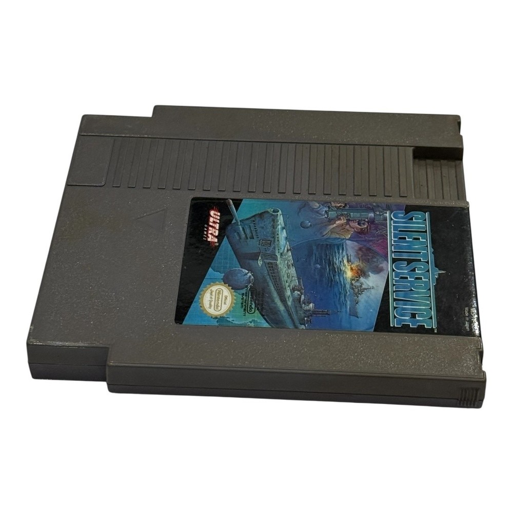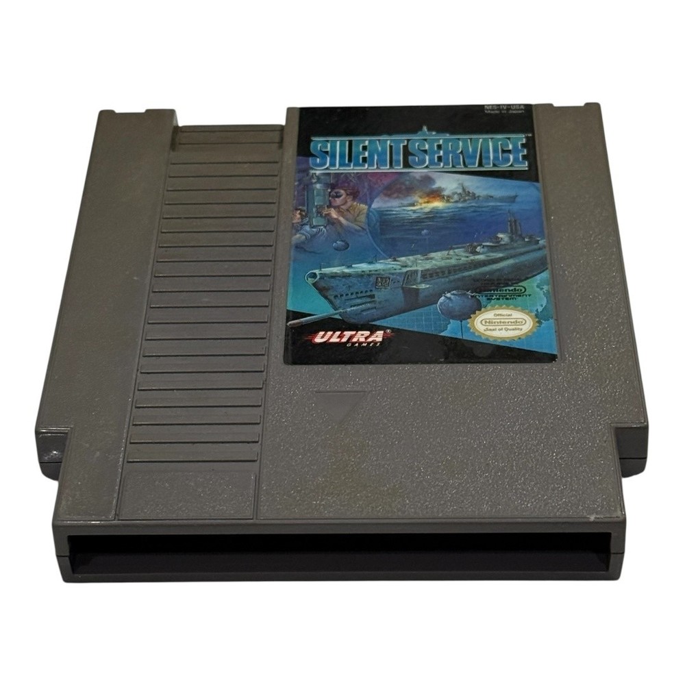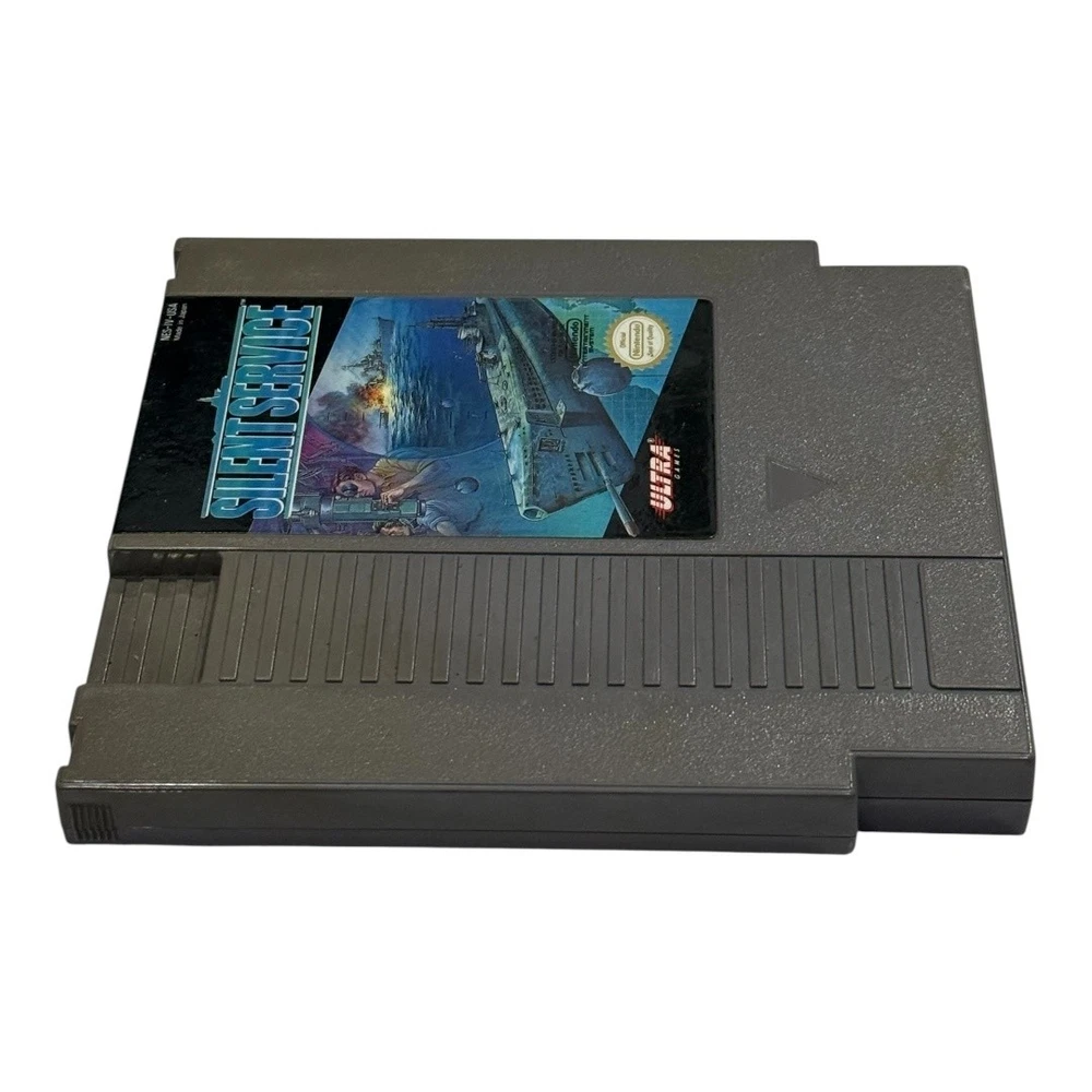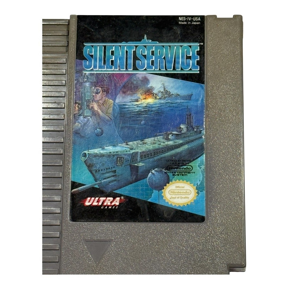Vintage Silent Service NES Nintendo Game Cartridge Japan Ultra Submarine War 1989 Condition: Good used condition – cartridge shows light general wear, some minor surface marks, tested and working Compatible with Nintendo Entertainment System (NES) Published by Ultra Games Original release year: 1989 Made in Japan Game type: Submarine simulation, World War II naval strategy Authentic Nintendo game with label art featuring submarine and naval warfare scene Official Nintendo Seal of Quality present Model number: NES-IV-USA Back of cartridge includes original caution/cleaning instructions label, no writing or stickers Great vintage addition for any NES or retro gaming collection