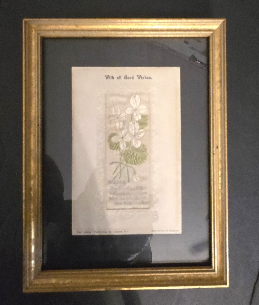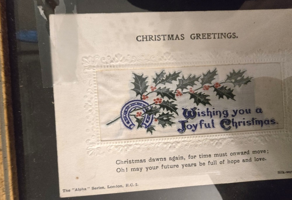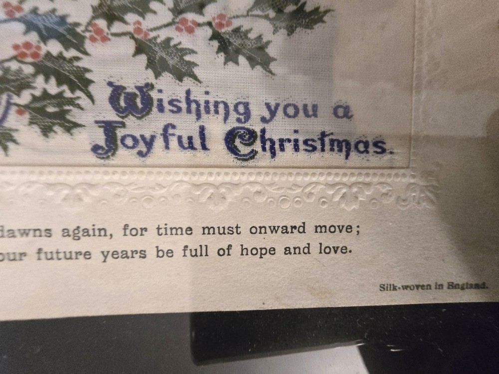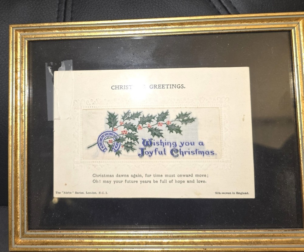 Bring history into your space with this beautiful matched pair of antique silk-woven postcards , professionally framed behind glass. Produced by Alpha Publishing Co., London, England , these cards feature woven text and imagery — an elegant holiday greeting scene and a botanical motif. Perfect for: Victorian décor Textile art collectors Holiday / seasonal styling Gift for vintage lovers Gallery wall accents ✿ Details: Set of 2 framed silk-woven postcards One reads: “Wishing You a Joyful Christmas” Both marked: “Silk-woven in England” and Alpha Publishing Co., London Framed size (approx.): [insert your measurements] In vintage condition with age-appropriate patina on frames These are not modern prints — they are true woven silk postcards, created on early 1900s textile looms. 📦 Ships carefully packed and protected. antique silk woven postcard stevengraph style woven greeting card alpha publishing london victorian wall art textile art framed