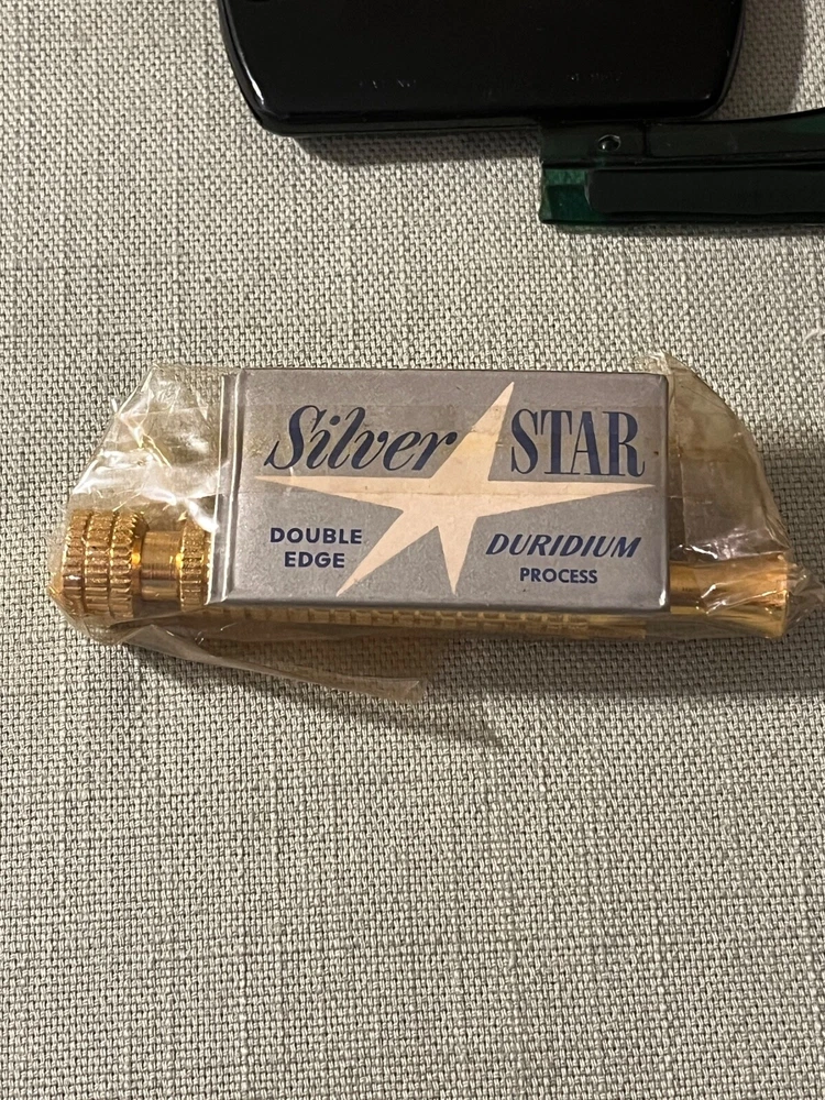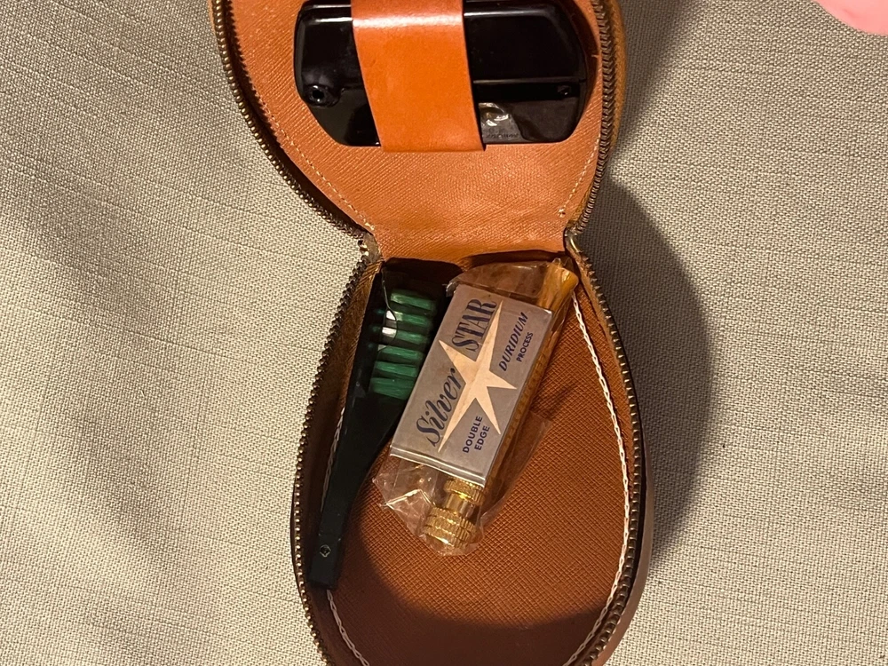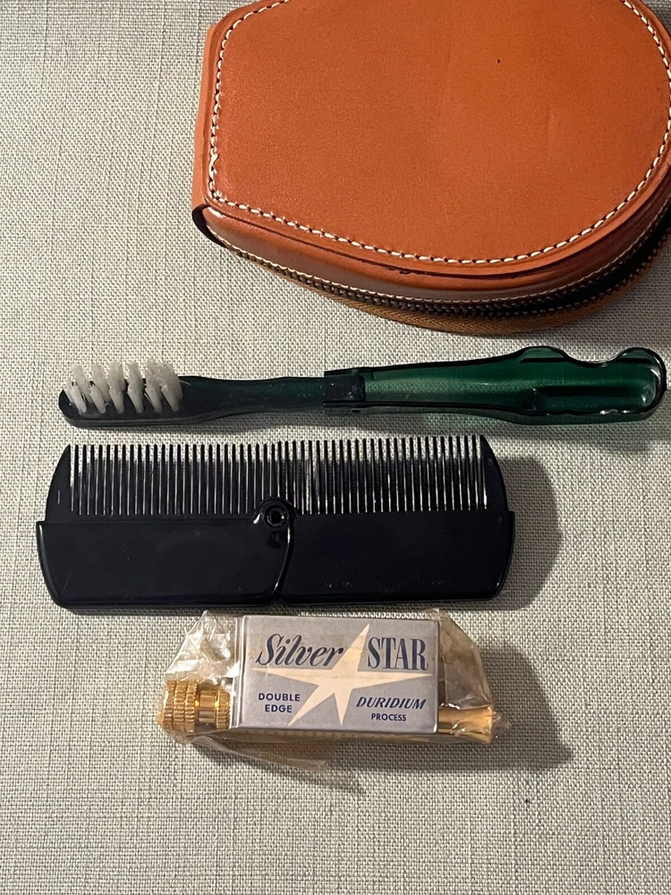 Vintage Silver Star Feather Weight Double Edge Razor In Travel Case, Toothbrush, and comb. New old stock. Very good condition as seen in pictures. Ships USPS ground advantage.