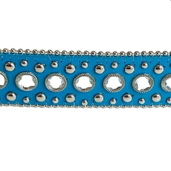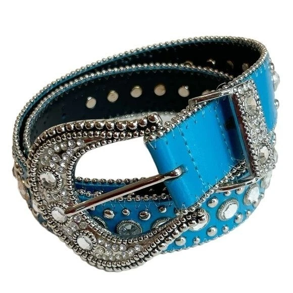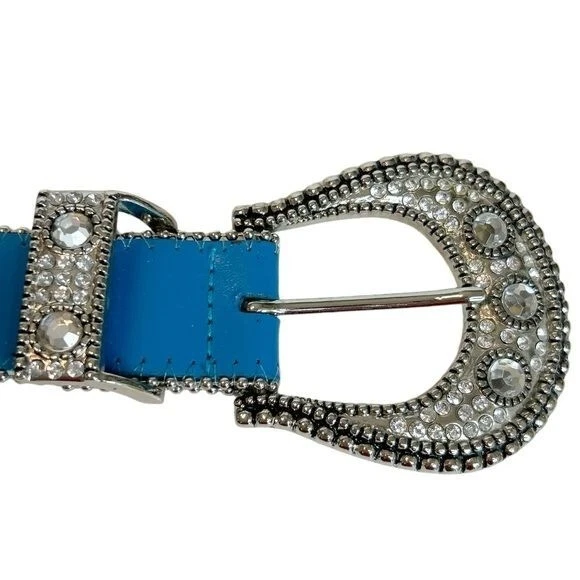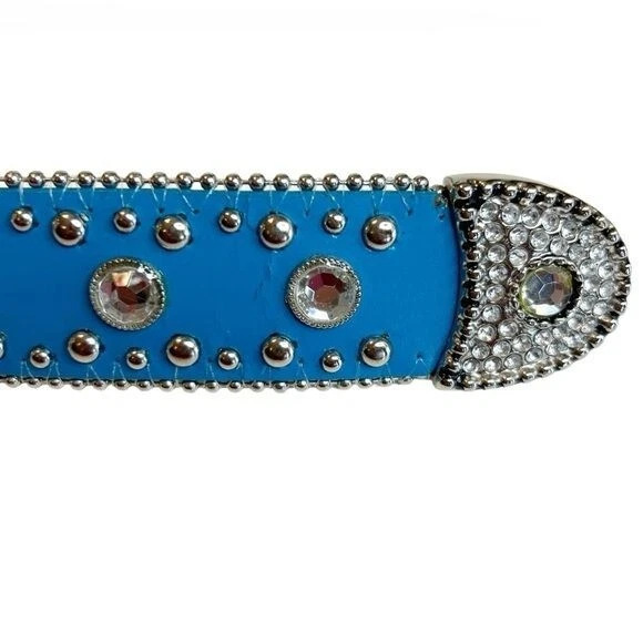 Silver End Heavy blinged silver buckle Two rows of silver studs Leather Belt Rhinestone - Size Belt length 38 with 4 holes Buckle 3" - Color Blue Clear Silver - Pre-owned condition. Some minor wear at the belt holes - Smoke and pet free home * I accept reasonable offers. * Same or next day shipping. * New items posted daily. * All used items are cleaned, washed, and/or thoroughly steamed before listing. * Bundle discounts in closet Thank you for your consideration.