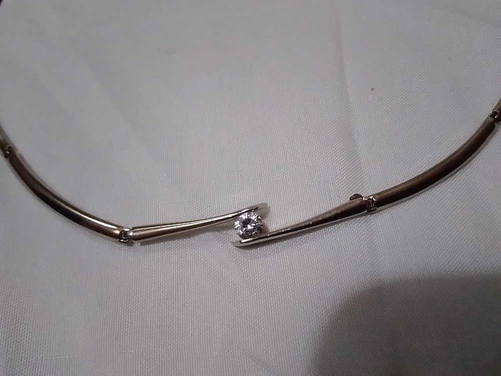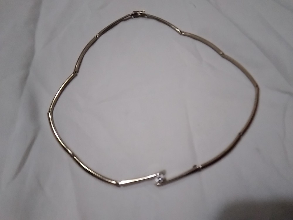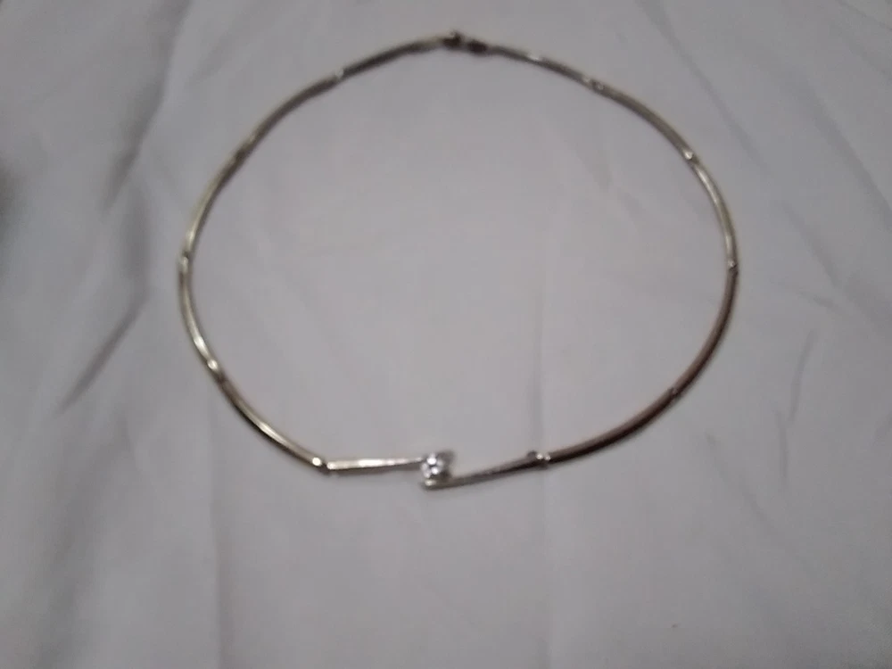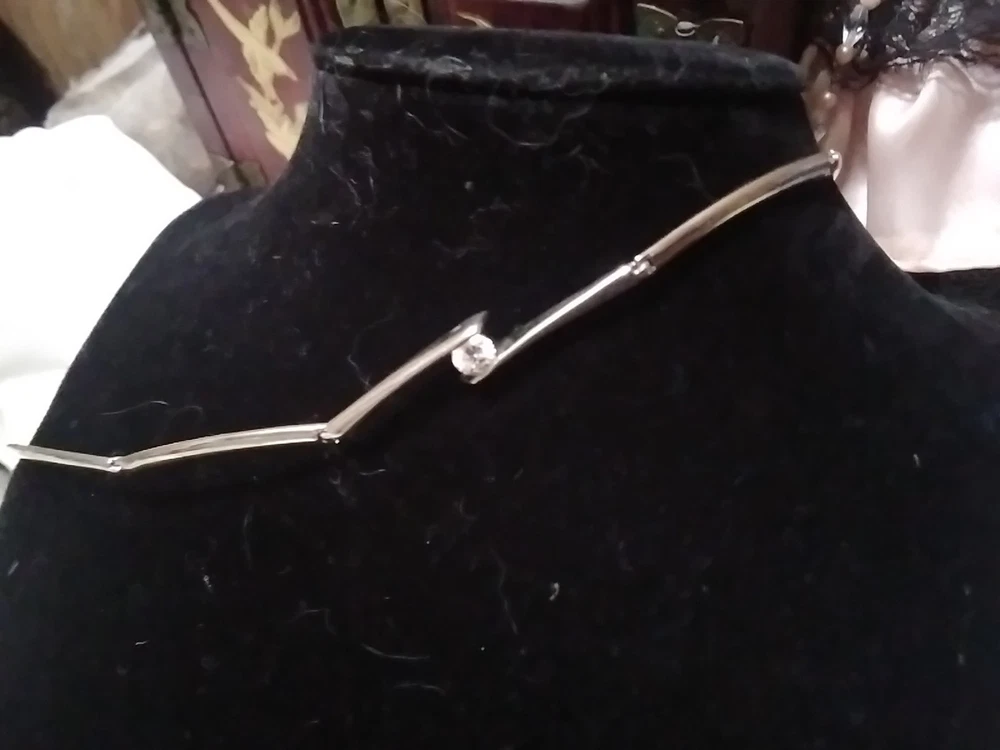 Elevate your accessory game with this vintage silver-tone collar necklace, a timeless piece that blends classic elegance with a touch of modern flair. Adorned with sparkling white rhinestones and a central crystal that catches the light with every movement, this necklace is designed to complement a variety of outfits, from formal evening wear to casual day ensembles. Crafted with precision, the necklace features a sleek silver metal chain and a secure foldover clasp, ensuring comfort and ease of wear. Measuring 16 inches in length, it sits gracefully at the base of the neck, offering a polished look for any woman who appreciates the charm of vintage jewelry.
