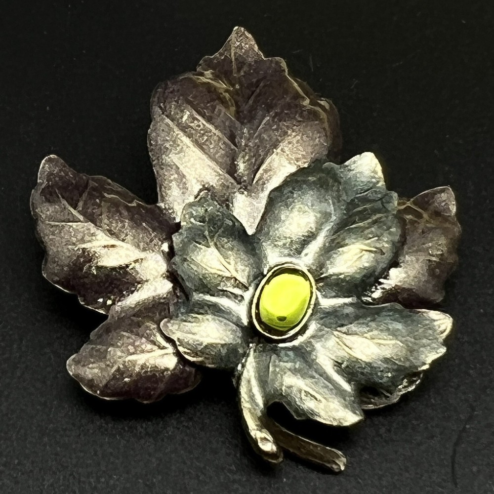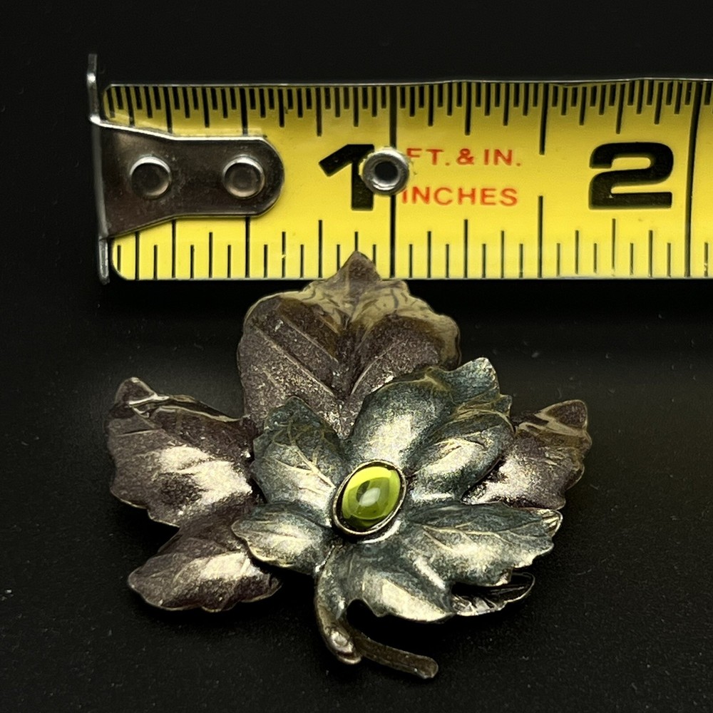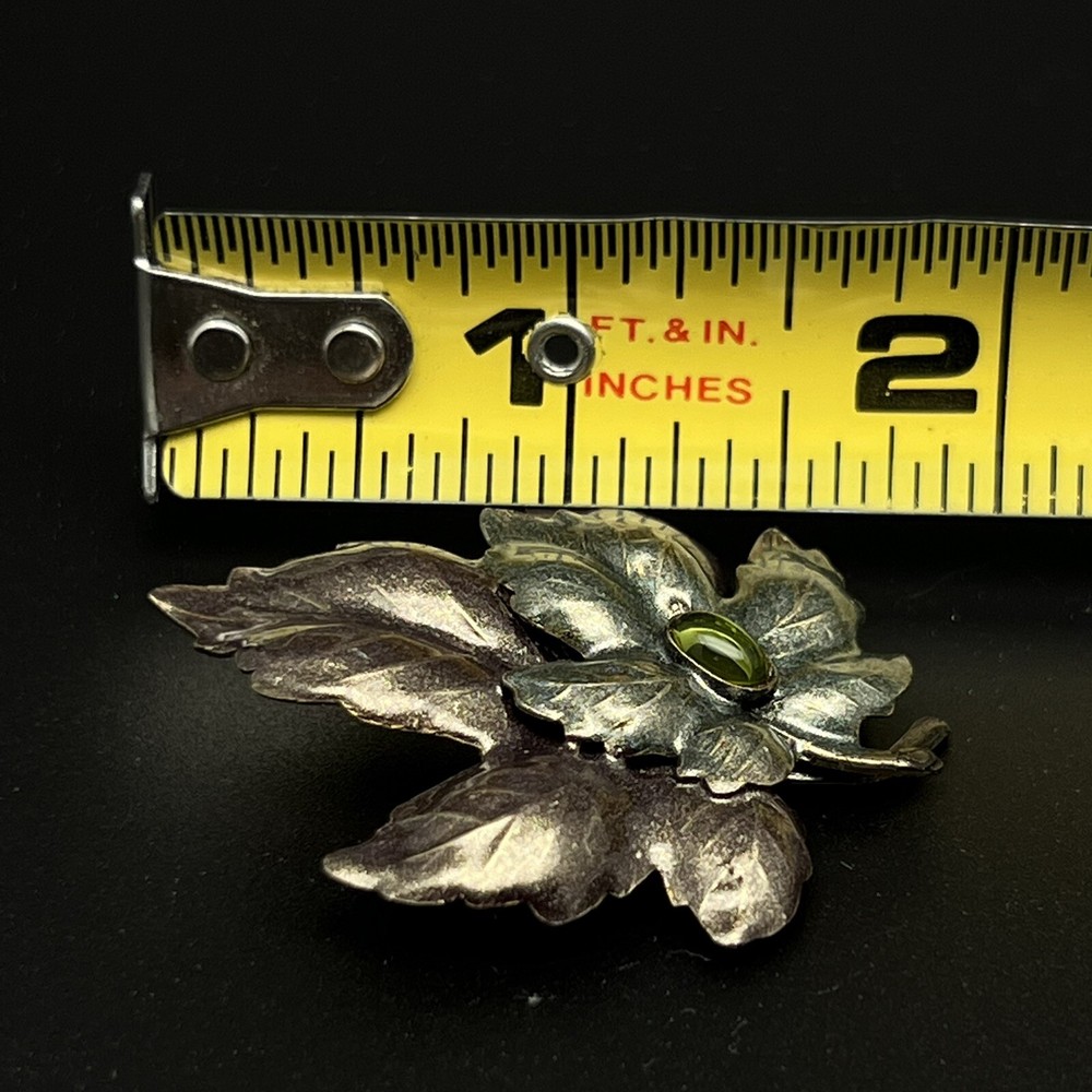Vintage Leaf Silver Tone With Center Green Faux Stone.