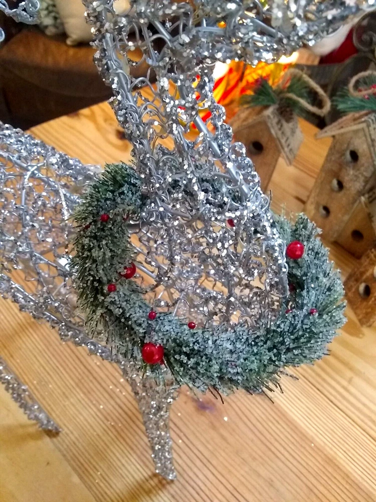 Today I have to offer you a Vintage 18" Tall silver wire and glitter reindeer figurine with a beautiful bottle brush wreath around his neck. This vintage ranger figurine comes from my own personal family estate and is in very good previously displayed condition showing no signs of hardware however one of the reindeers ears is missing please zoom in on photos for exact measurements and condition it would be a lovely addition to your family's heirloom holiday collectibles thank you for stopping by feel free to contact me with any questions you may have all measures of safety will be taken while preparing for shipment.All serious offers considered I hope you have a wonderful happy healthy and safe holiday season