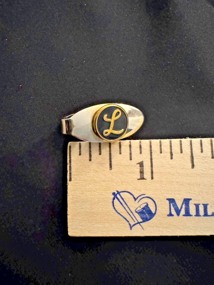 This Vintage Silver and Gold Toned Monogrammed "L" Bar Tie Clip is a stylish and classic accessory for men. The tie clip features a monogrammed "L" design, adding a personalized touch to any outfit. Crafted with a silver base and gold accents, this accessory exudes sophistication and timeless elegance. Perfect for formal occasions or adding a touch of refinement to a business attire, this tie clip is a versatile and eye-catching addition to any man's wardrobe.