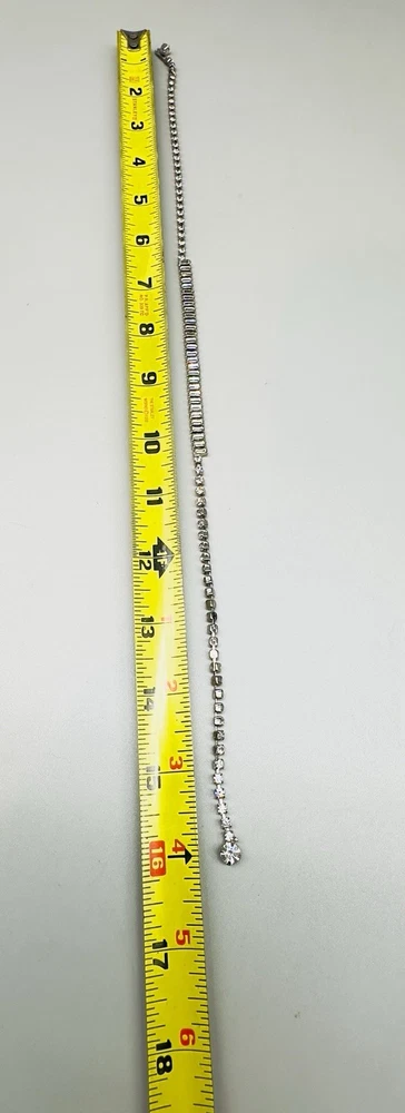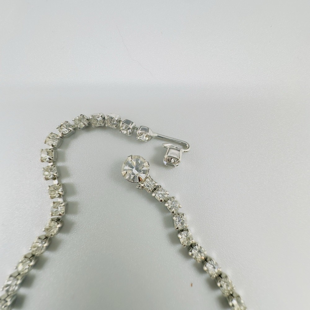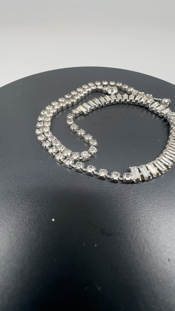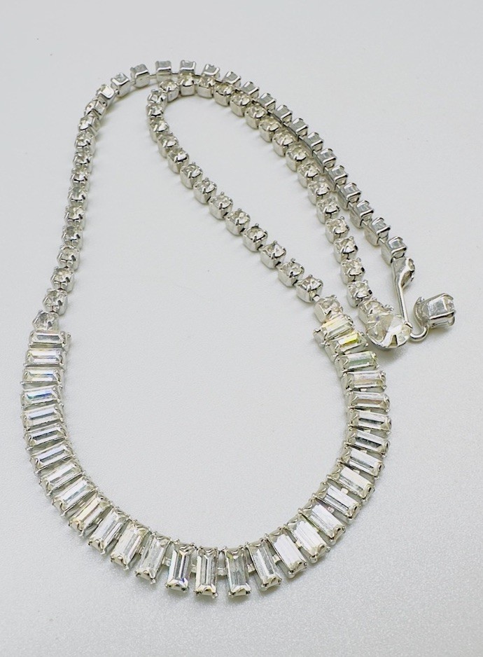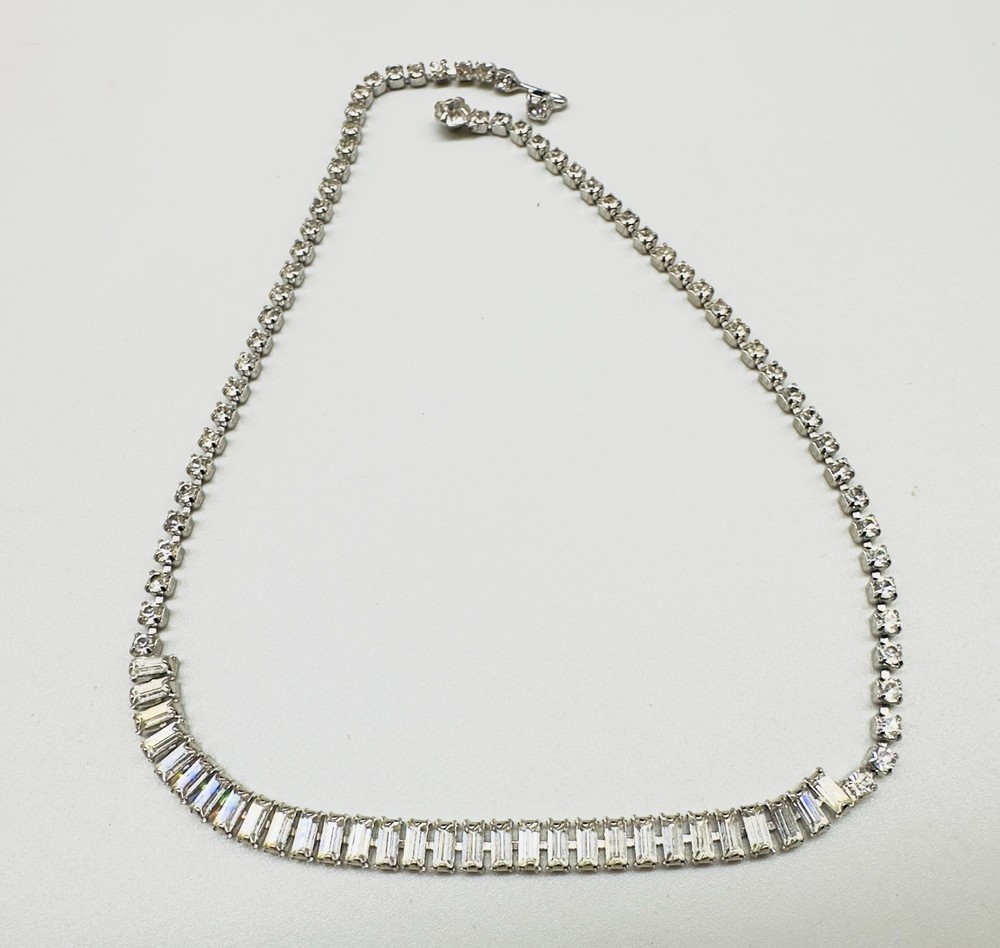 Style:ChokerNecklace Length:16 inType:NecklaceSetting Style:ProngMain Stone Shape:BaguetteBrand:UnbrandedMain Stone Color:White/ColorlessYear Manufactured:1960-1969Material:RhinestoneJewelry Department:FashionVintage:Yes