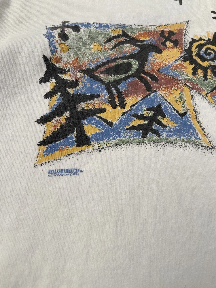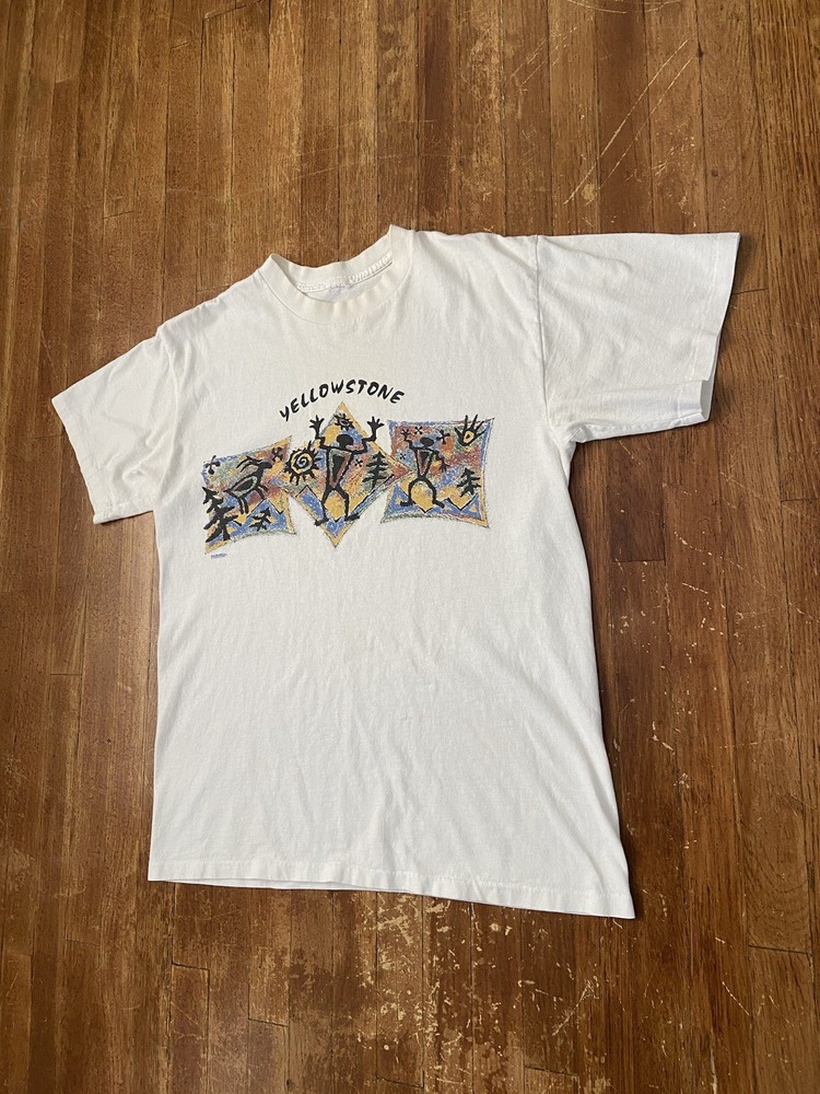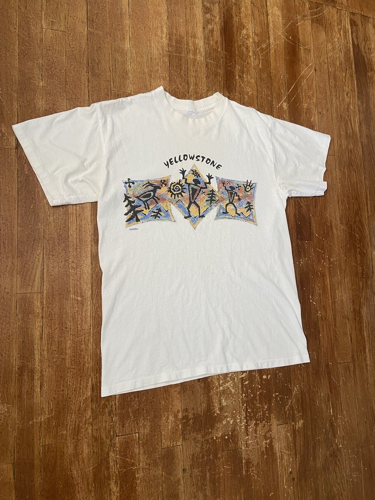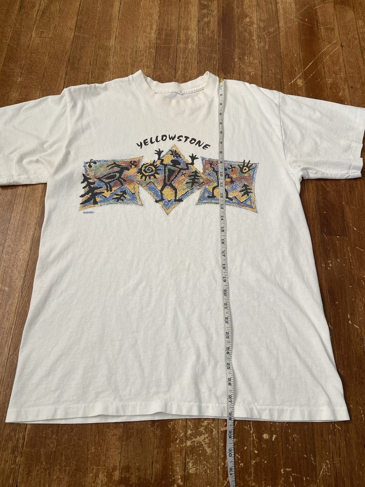 This Vintage Single Stitch Yellowstone National Park Center Logo White T-Shirt in size Large is a classic piece from the 90s that is perfect for any nature lover or outdoor enthusiast. Made of comfortable cotton material with a solid pattern and short sleeves, this t-shirt features a crew neckline and is machine washable for easy maintenance. The inclusion of the Yellowstone National Park logo adds a unique accent, making it a must-have addition to any collection of 90s-themed clothing. Perfect for wearing all seasons long, this t-shirt is a timeless and stylish choice for any wardrobe.