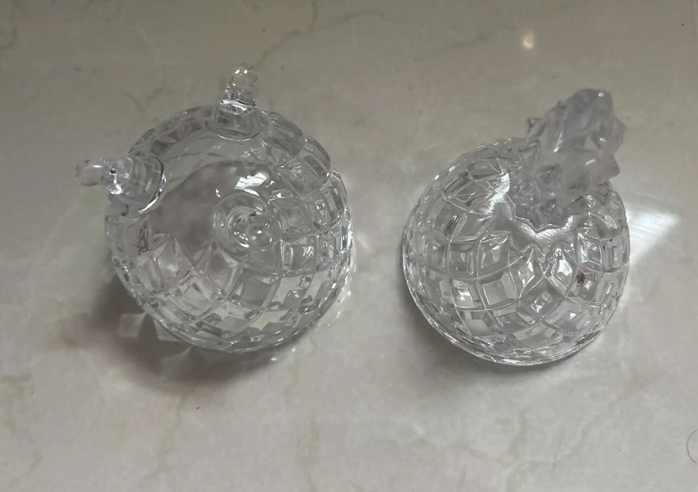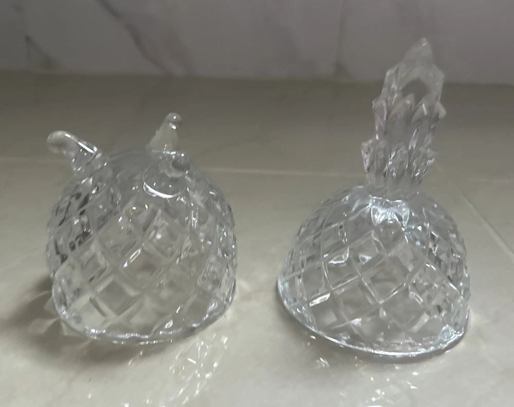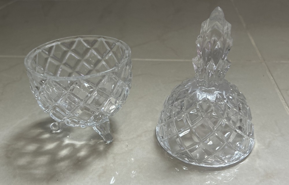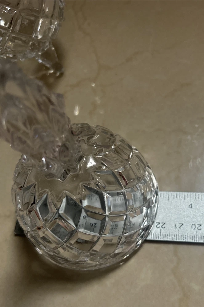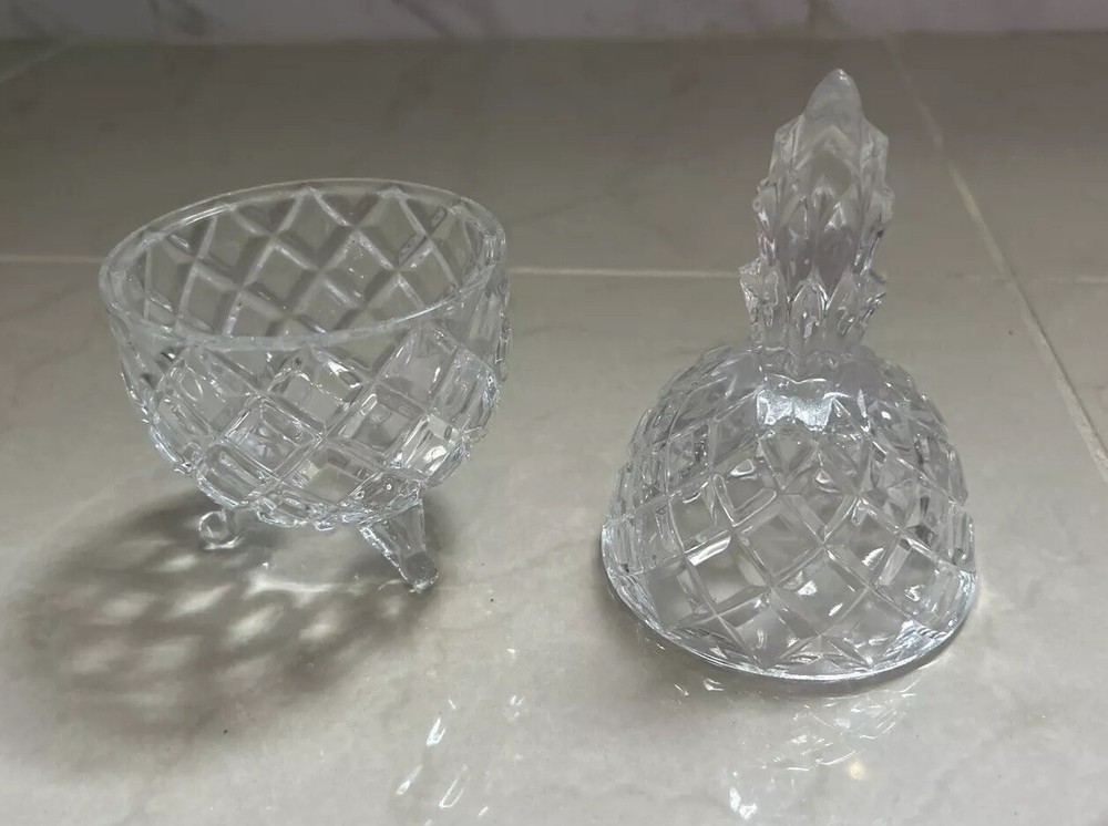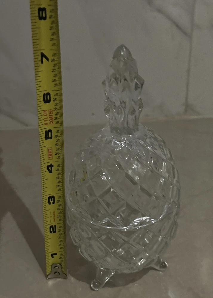 Shape:pineappleItem Length:7 inch highMaterial:CrystalItem Width:3 inchManufacturer Warranty:NoneTheme:CandyColor:ClearHandmade:NoBrand:UnbrandedModel:CoverItem Weight:1-poundItem Diameter:3 inchCapacity:6 oz.Item Height:7 inchPackaging:UnboxedNumber of Compartments:2gtin13:Does not applyPattern:DiamondCountry/Region of Manufacture:UnknownType:Candy DishFeatures:with coverNumber of Items in Set:2Keeps Hot For:does not applyStyle:pineappleKeeps Cold For:does not applyOriginal/Licensed Reproduction:OriginalCustom Bundle:NoVintage:YesAntique:NoUPC:Does not apply