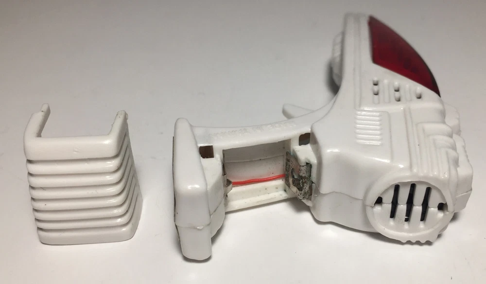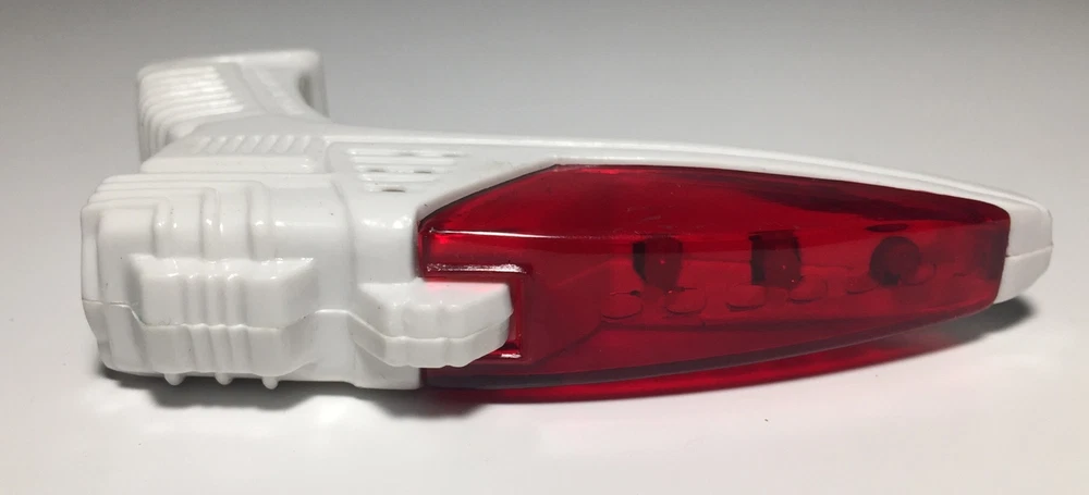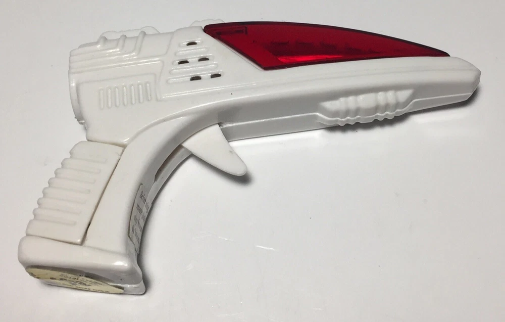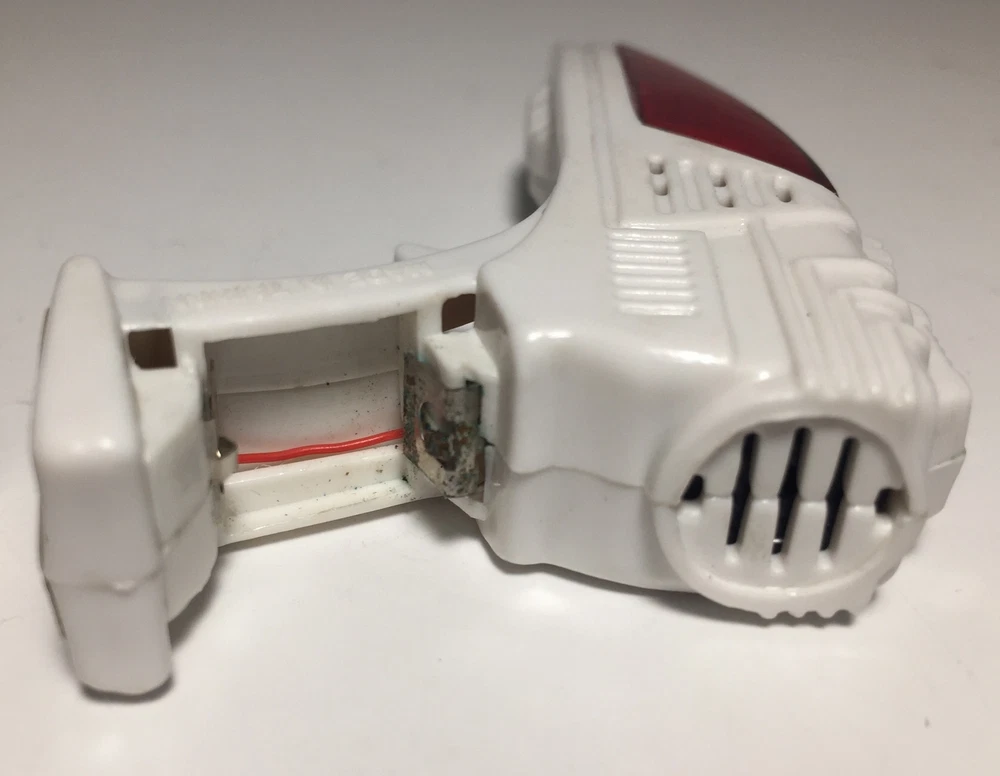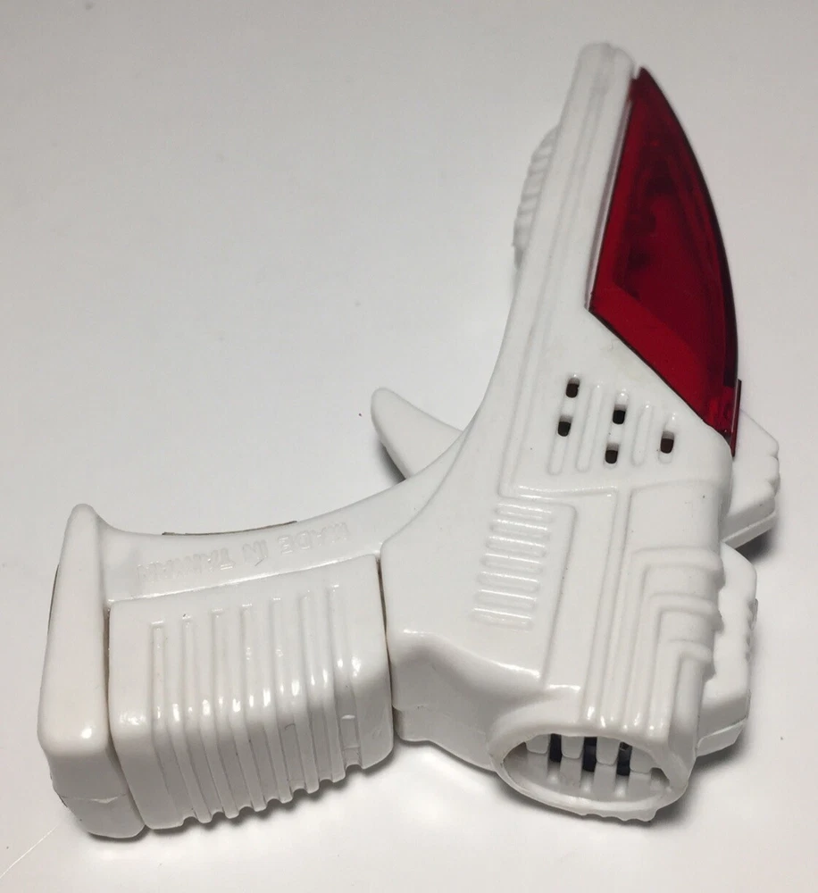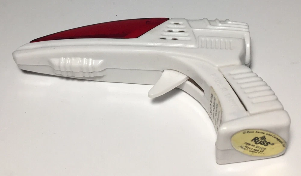 Vintage Small 3 1/2” Russ Berrie And Company Space Gun Toy Item No. 18105. The toy gun has been tested and works. The battery compartment does have some corrosion but it does still work. It measures approximately 3 1/2”. It takes two LR44 batteries that are not included. Please feel free to ask any questions. The item will ship out safely and securely the same or next business day.