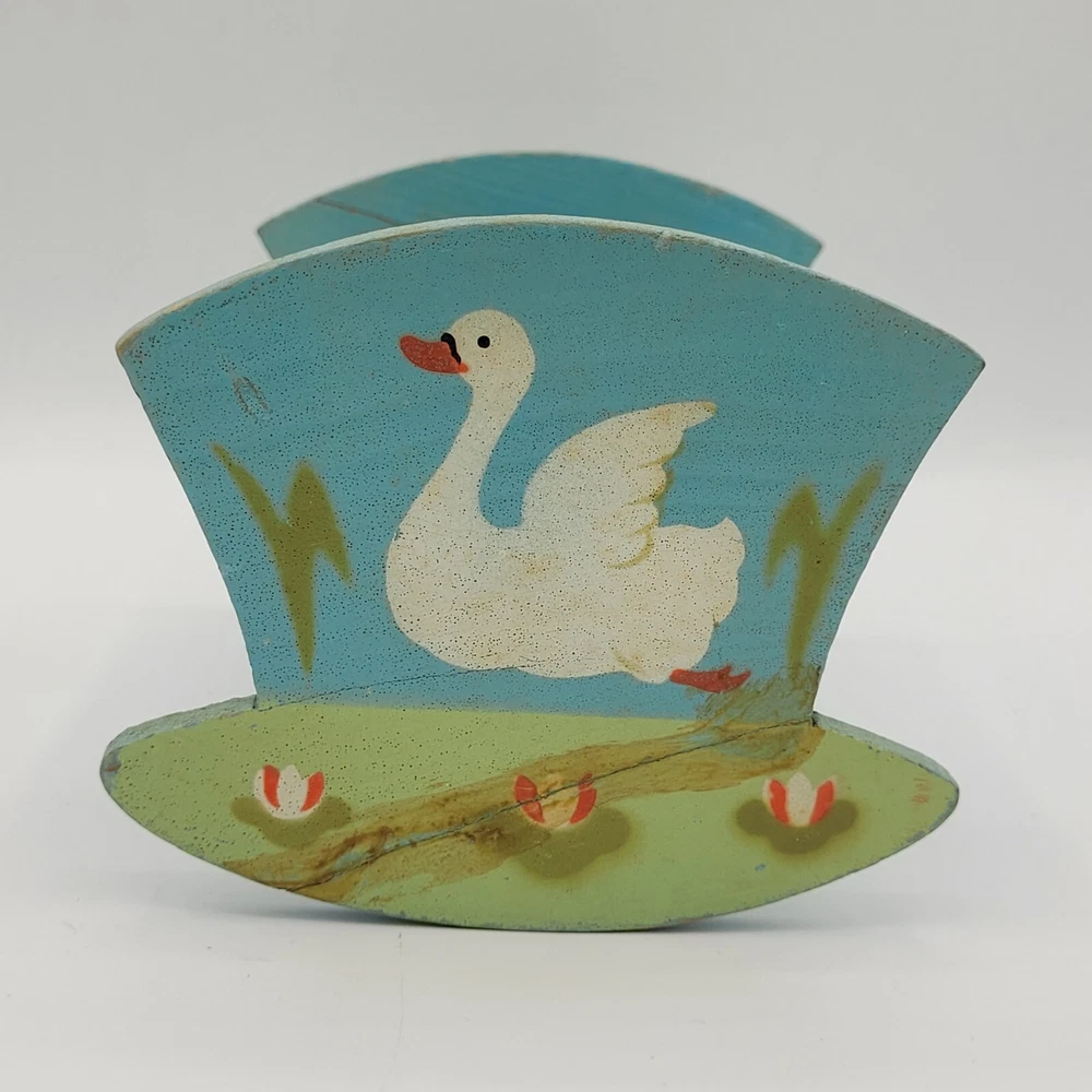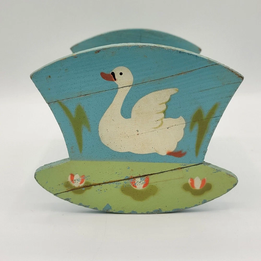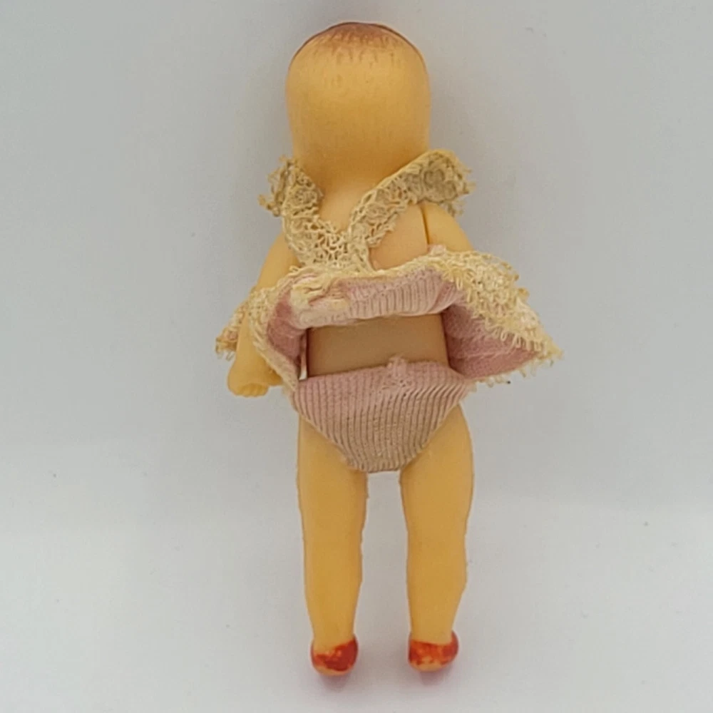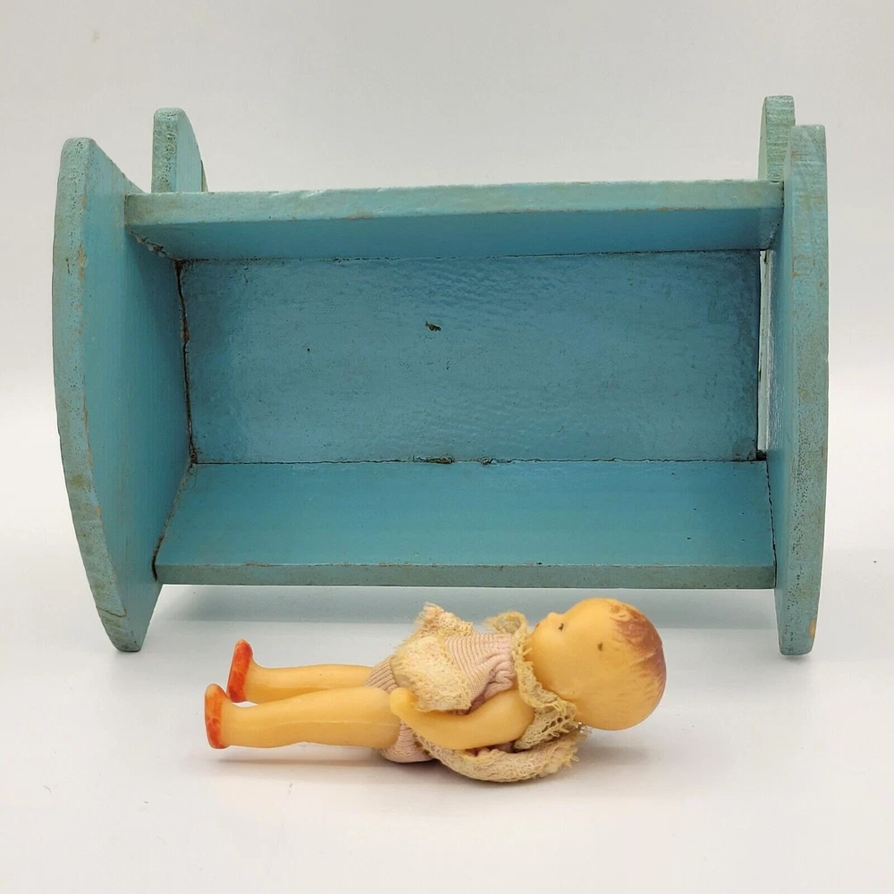 Vintage Small Wooden Doll Cradle With Doll Features: Hand painted cradle featuring folk design Baby doll with hand painted features. Vintage items show wear consistent with age. Cradle has an area of repair on end, see pictures. Baby doll shows some hair and shoe, etc. color loss and fading, discoloration of clothing. See pictures for more details. Approximate cradle measurements are: 4" H x 6" L x 4.5" W Approximate baby doll measurements are: 3.25" L x 1.25" W Packaged securely for shipping.