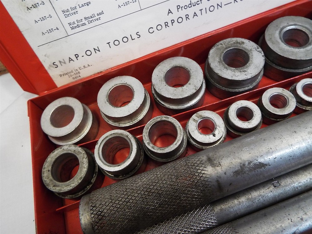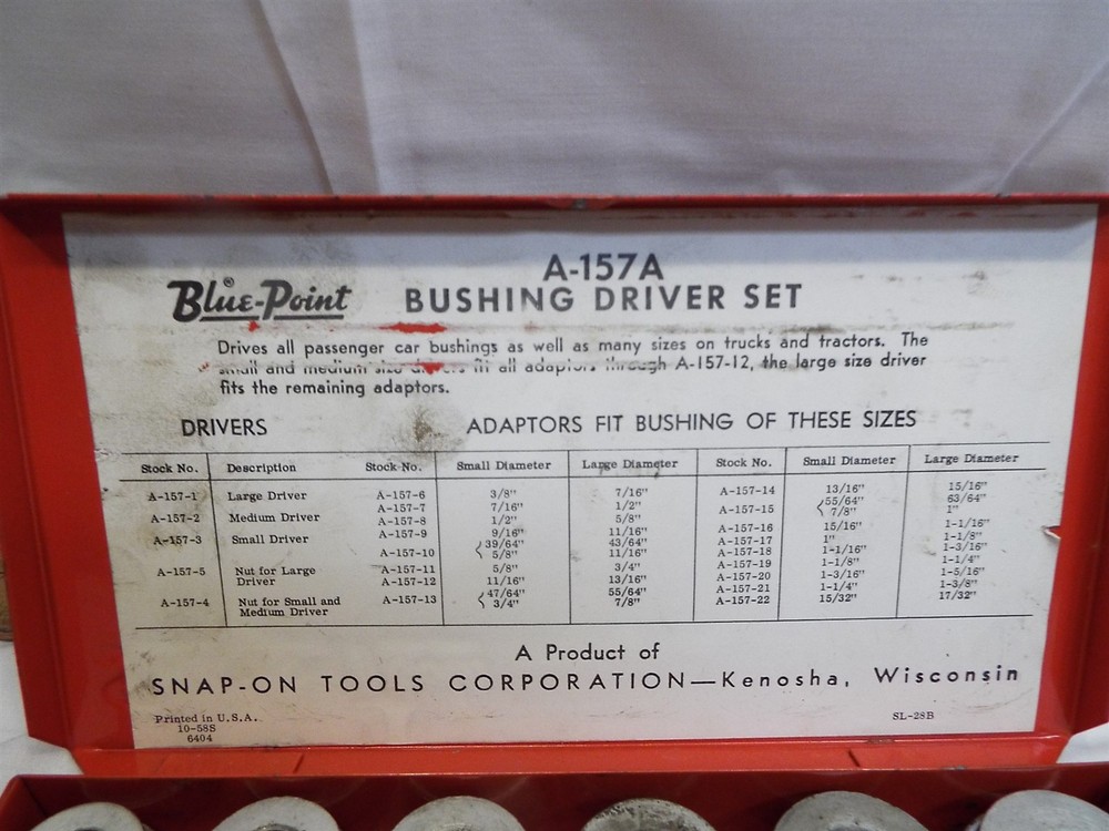 Item Description A bushing driver set. THe inner label reads Blue Point, but the handles and case read Snap-On. Looks to be complete, comes as shown. Looks to be sizes 3/8" to 1-3/8", not sure. Some mild soiling from use, some mild oxidation spots. Offered as-is. 020425 - FO We sell mostly USED and UNIQUE items. Expect minor evidence of use or imperfections, dings etc. from age. We take many photos of our items to assist with the description. Please use the photos to help judge content and condition. BUY WITH CONFIDENCE : We have sold over 25,000 antiques on-line since 1997 with over 15,000 positive customer feedback. We have been giving quality service to the on-line collector community for over 19 years. Our selling history speaks for itself so that you can buy with confidence. RETURNS : Accepted, full purchase price refunded upon return. Buyer to pay return shipping. Please inspect your item, and notify us of a return within 3 days of receiving it. SHIPPING : 99% of items shipped within three business days. Powered by SixBit's eCommerce Solution