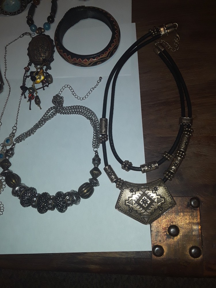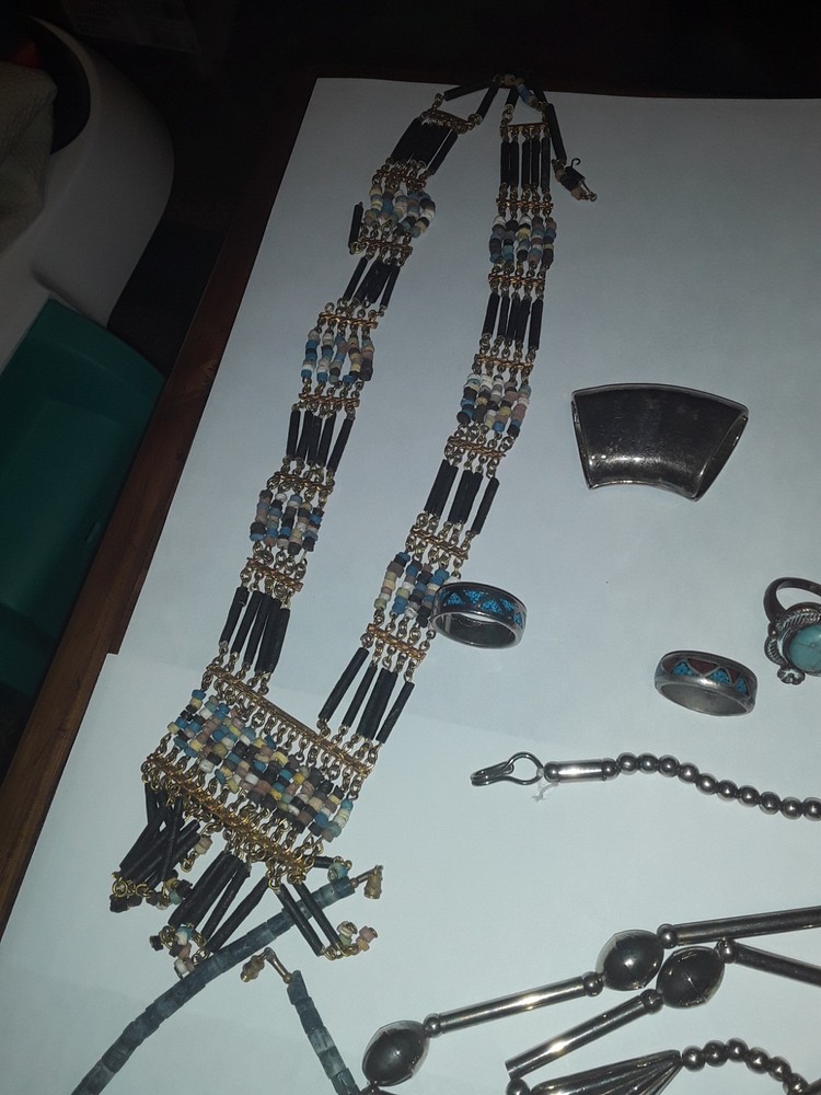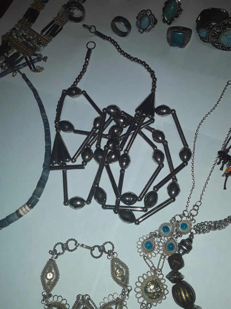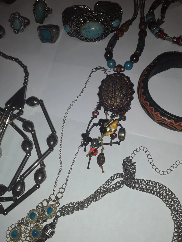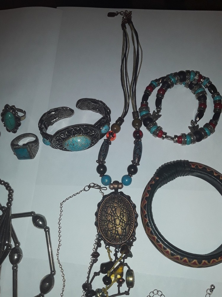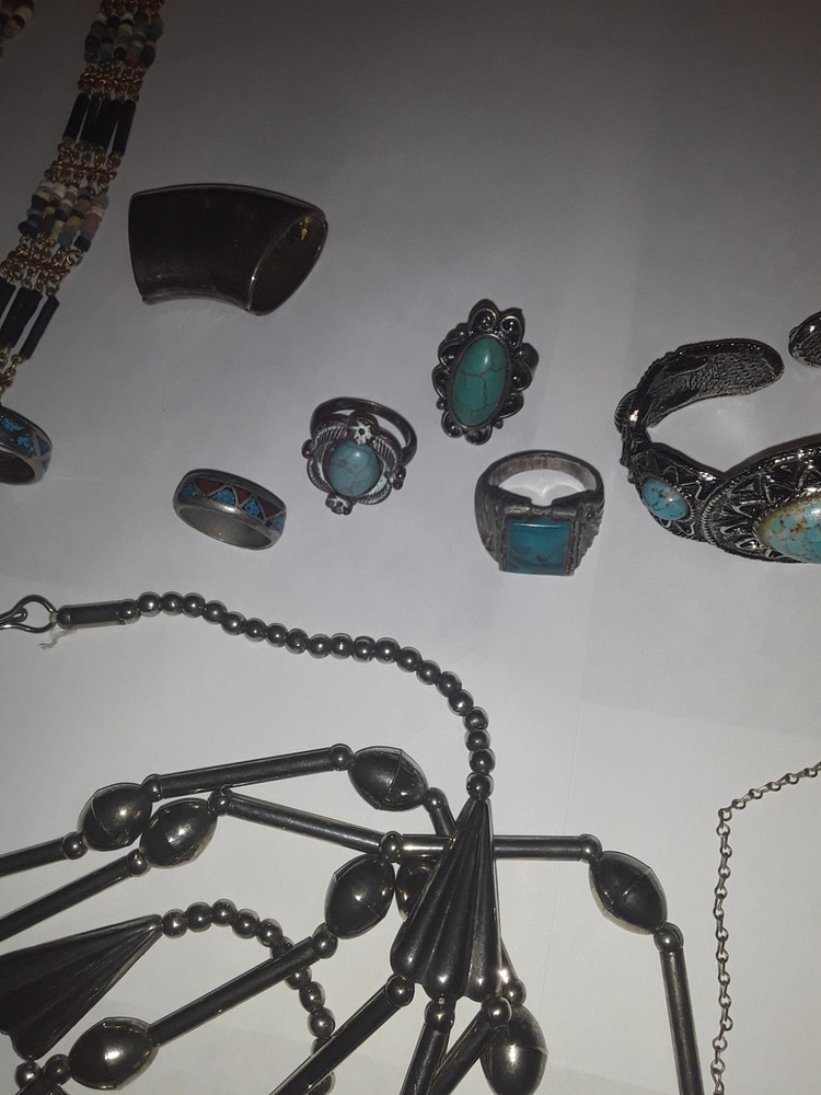 This vintage Southwestern style mixed jewelry lot offers a unique and eclectic collection of pieces. The assortment includes a variety of items such as necklaces, bracelets, and rings, all showcasing traditional Southwestern designs with a modern twist. Each piece is carefully curated to create a diverse and eye-catching set that can be worn as a statement or everyday accessory. Perfect for those who appreciate intricate craftsmanship and one-of-a-kind pieces. PREOWNED/acquired items as pictured. Some pieces could use minor cleaning/polishing if so desired due to age and storage. Please see pictures as they are to be considered part of the description accordingly . Thankyou