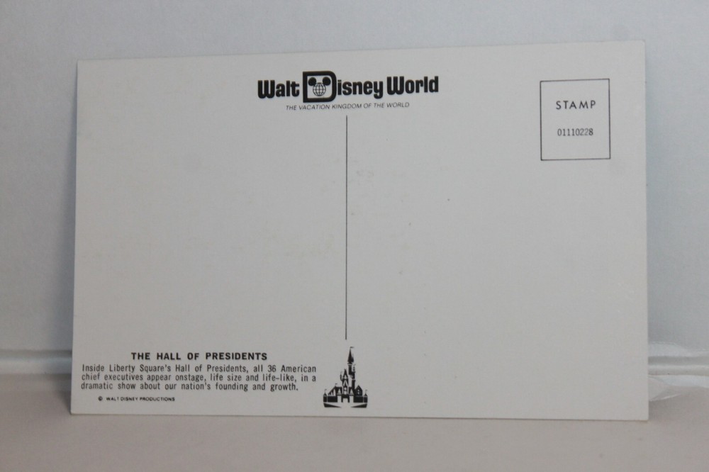 Vintage Souvenir Travel Postcard Disney World Hall of Presidents . Any photos used are of the item that you will be receiving, they are not stock photos. Will combine shipping costs for multiple purchases. Shipments to the Continental U.S. only. Sorry, No APO or FPO. Please pay promptly. Please visit our Ebay store for more great items. Combined shipping is not automatic. If you're not sure how to do it, Please contact us and we'll be happy to help.