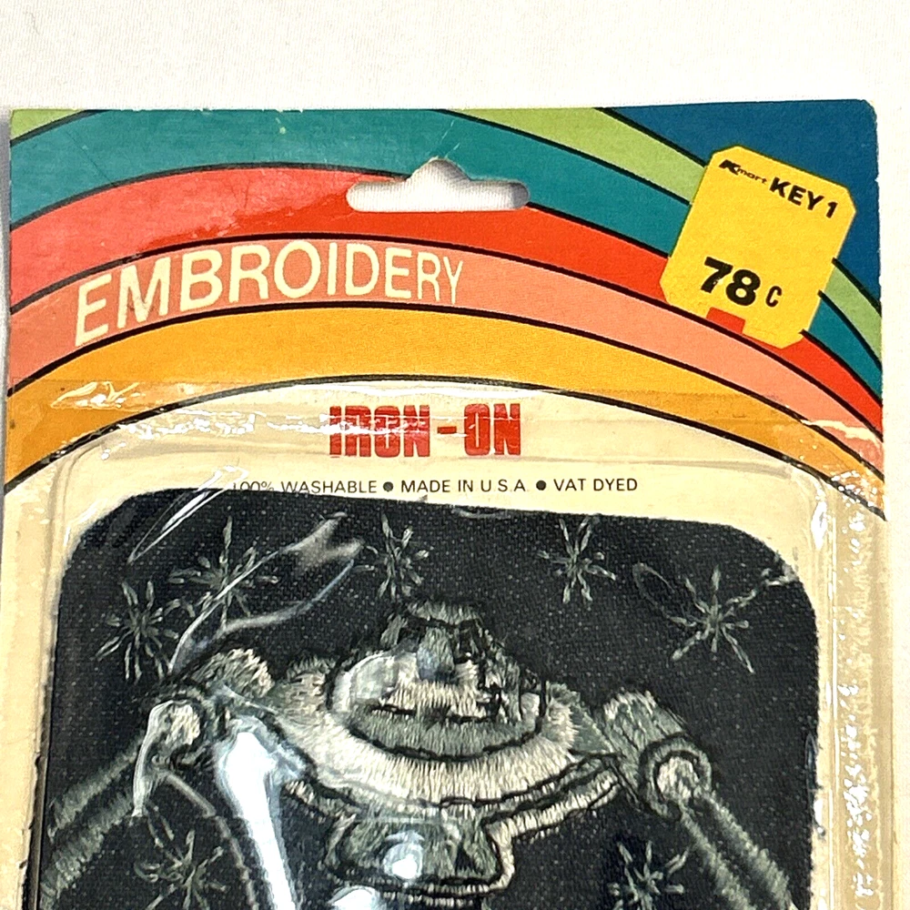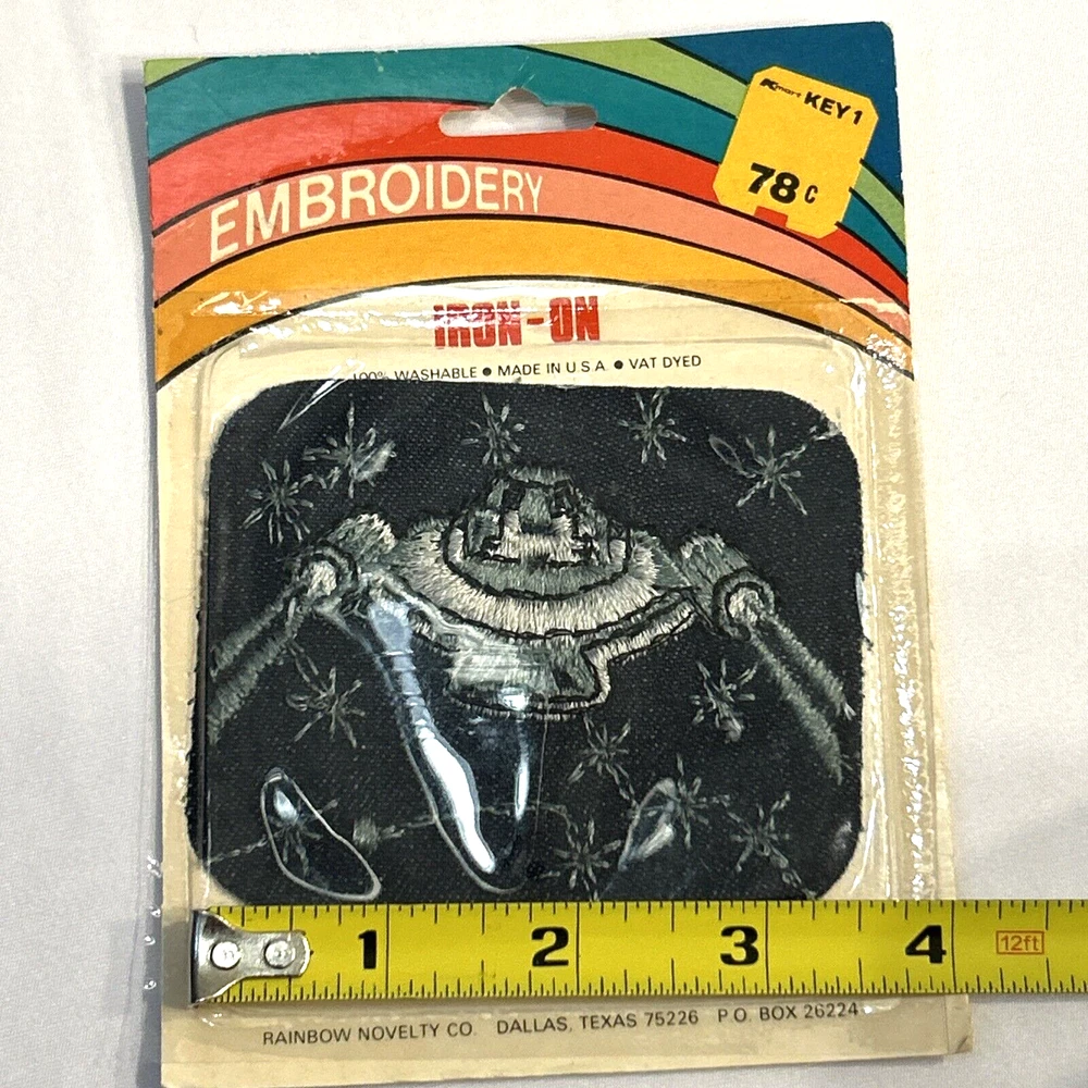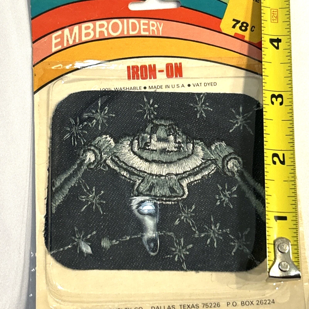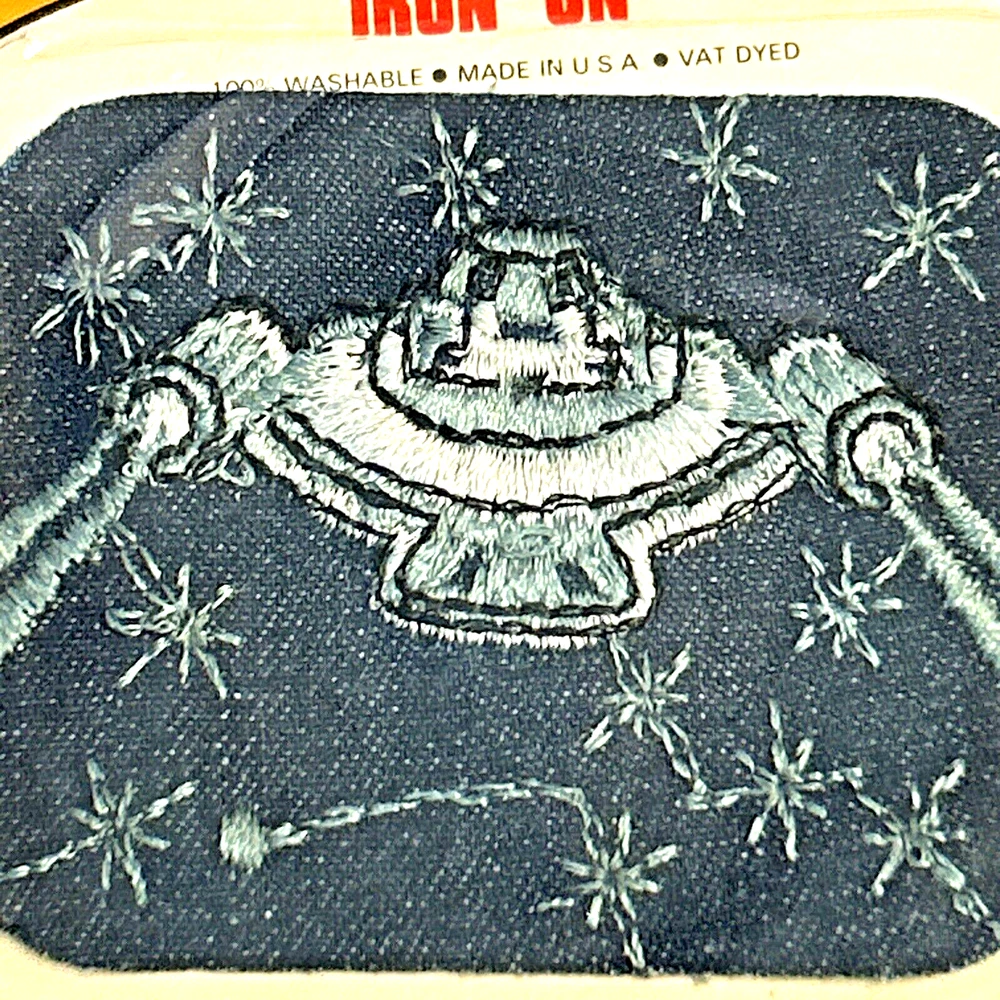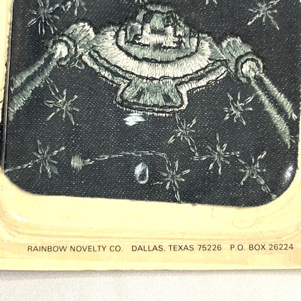 Vintage Space Ship Rainbow Novelty Embroidered Iron On Patch Sealed Vintage and still in its sealed packaging - unopened Very good condition Approximately 3.5" X 3" Iron on patch - directions on back Denim blue background with embroidered blue and white space ship and stars Thank you for looking at this vintage listing from Magpie Revibe !