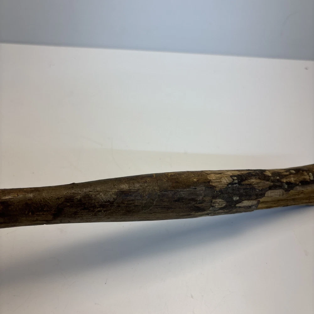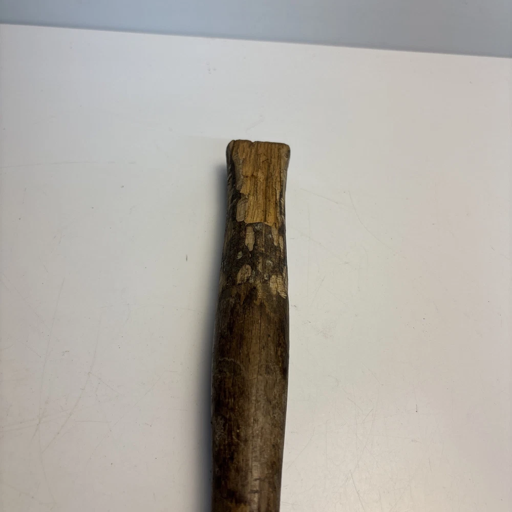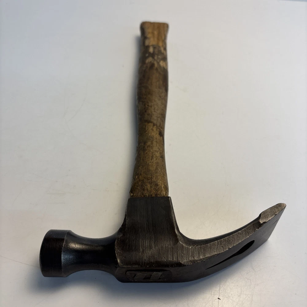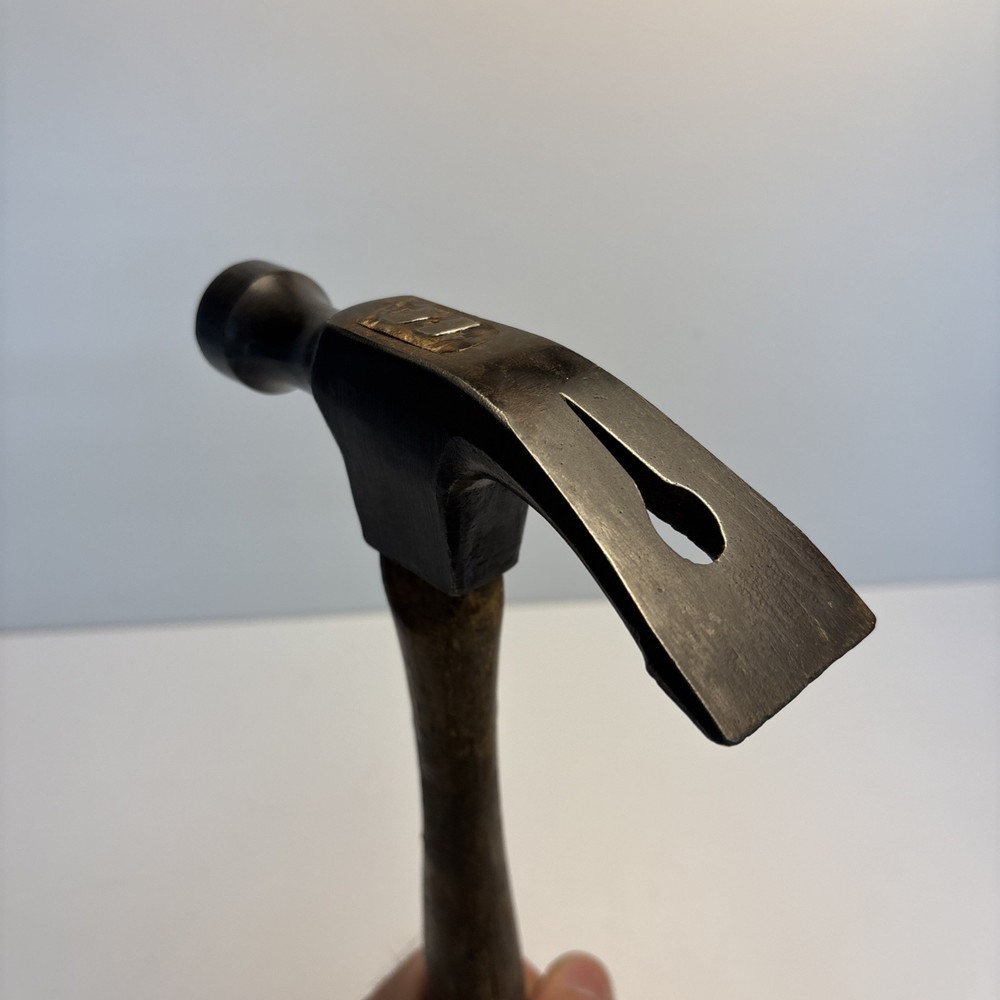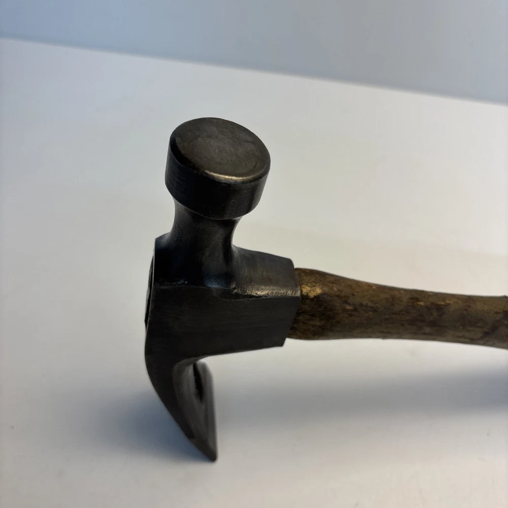 Vintage unmarked mason / bricklayer hammer with slotted nail puller claw. Forged steel head with smooth round striking face and wide blade-style claw featuring keyhole nail slot. Traditional wood handle. No visible maker’s marks. See photos for complete details. Condition Pre-owned vintage condition. Head is slightly loose on the handle. Bottom of the wood handle is cracked and missing a section. Normal surface wear from age and use. See photos for complete details.