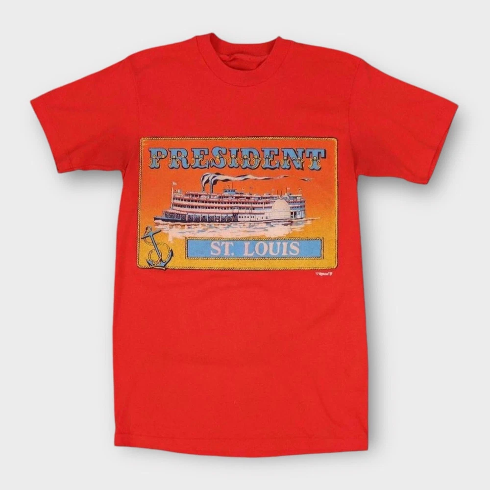 This vintage St. Louis T-shirt is a must-have for any hipster, streetwear, or nautical enthusiast. Made from lightweight and breathable cotton canvas fabric, this shirt features a crew neck and short sleeves, perfect for all seasons. The 3D graphic print adds a unique touch to the shirt, making it perfect for casual wear or travel. The shirt is machine washable and easy to care for, with a regular fit that flatters any body type. The red color adds a pop of color to any outfit, while the slimming feature ensures a comfortable and flattering fit. Whether you're exploring the city or heading out on a boat, this T-shirt is the perfect addition to your wardrobe. Tag Size: N/A Best Fit: * Men: XS * Women: S Condition: No Noticeable Flaws Approximate Flat Measurements: * Chest: 16.5” * Length: 27.5” * Material: Cotton All items are second hand, many being vintage and may have small imperfections. Anything major is noted.