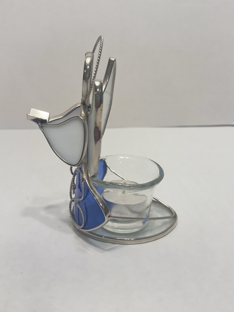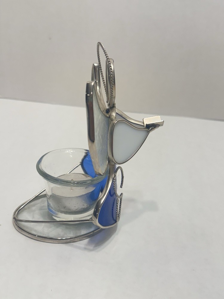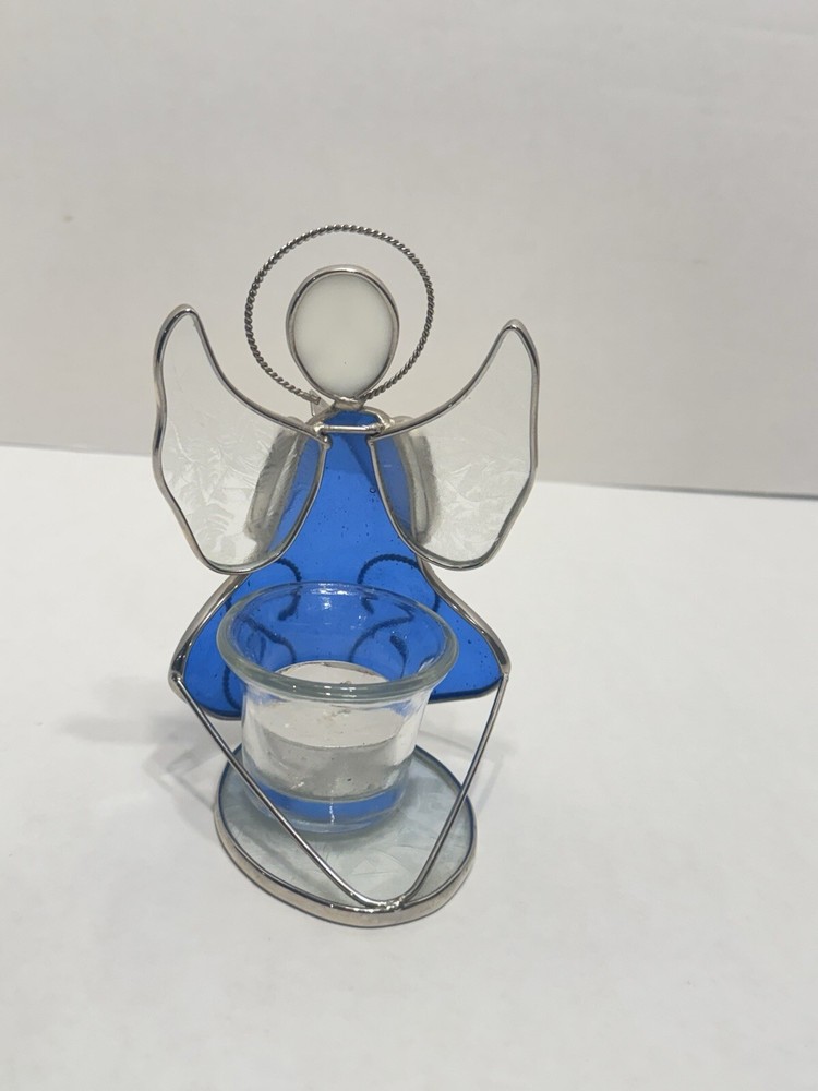 This Vintage Stained Glass & silver metal Choir Angel Candle Holder features a unique design of a choir angel holding a songbook and wearing a halo. The tealight holder is made of silver metal material with stained glass accents in blue, white, and frosted clear colors, adding a touch of elegance to any space. Standing approximately 6" in height Please feel free to call me with any questions you have