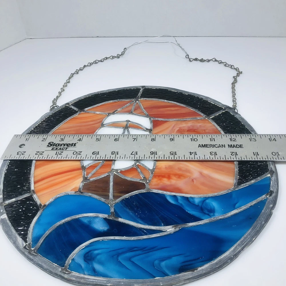 Add a touch of vintage charm to your home decor with this beautiful stained glass sailboat window hanging panel suncatcher. The intricate floral pattern and colorful design make it a perfect addition to any room that needs a little bit of nature and art. Crafted by hand in the late 20th century, this unmarked suncatcher features a framed, ready-to-hang design and is made of high-quality glass. Its nautical and ocean-themed elements, including ships and boats, sea life, and the ocean itself, make it a perfect addition to any home that loves the sea. Don't miss out on this unique and decorative piece that is sure to add beauty and character to your home.