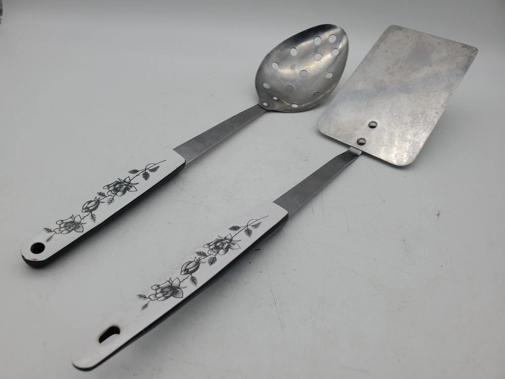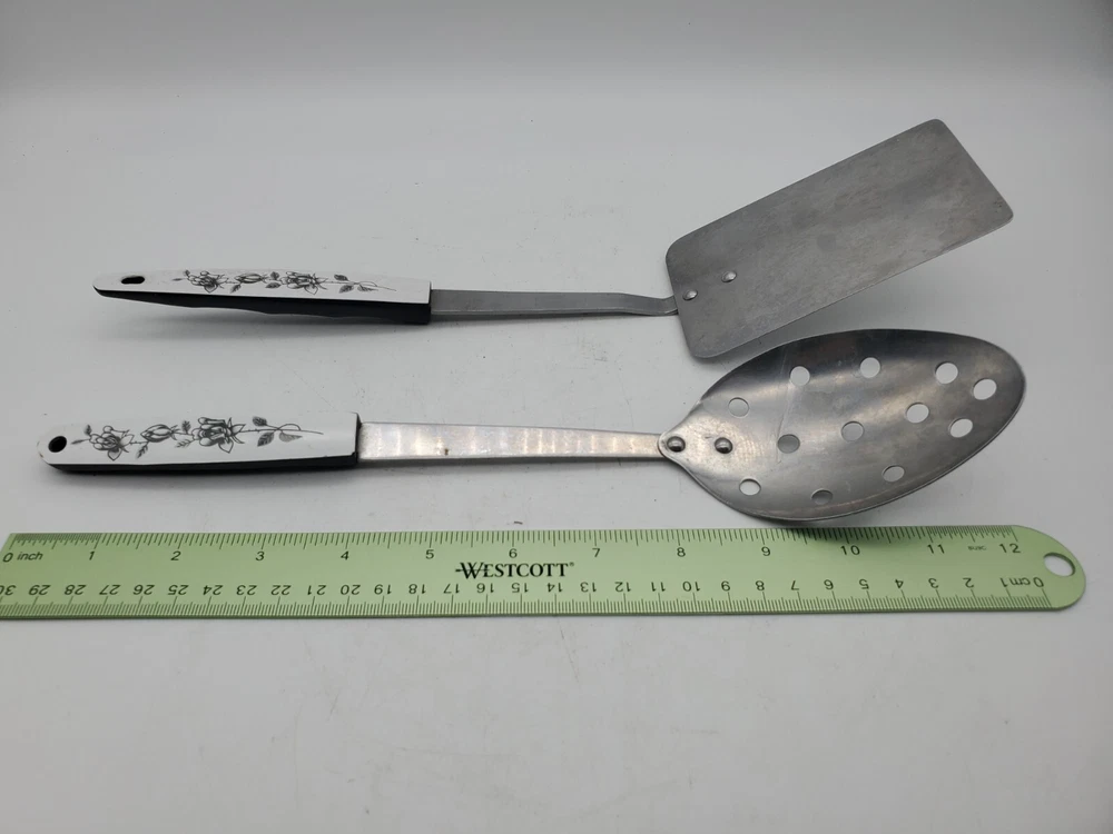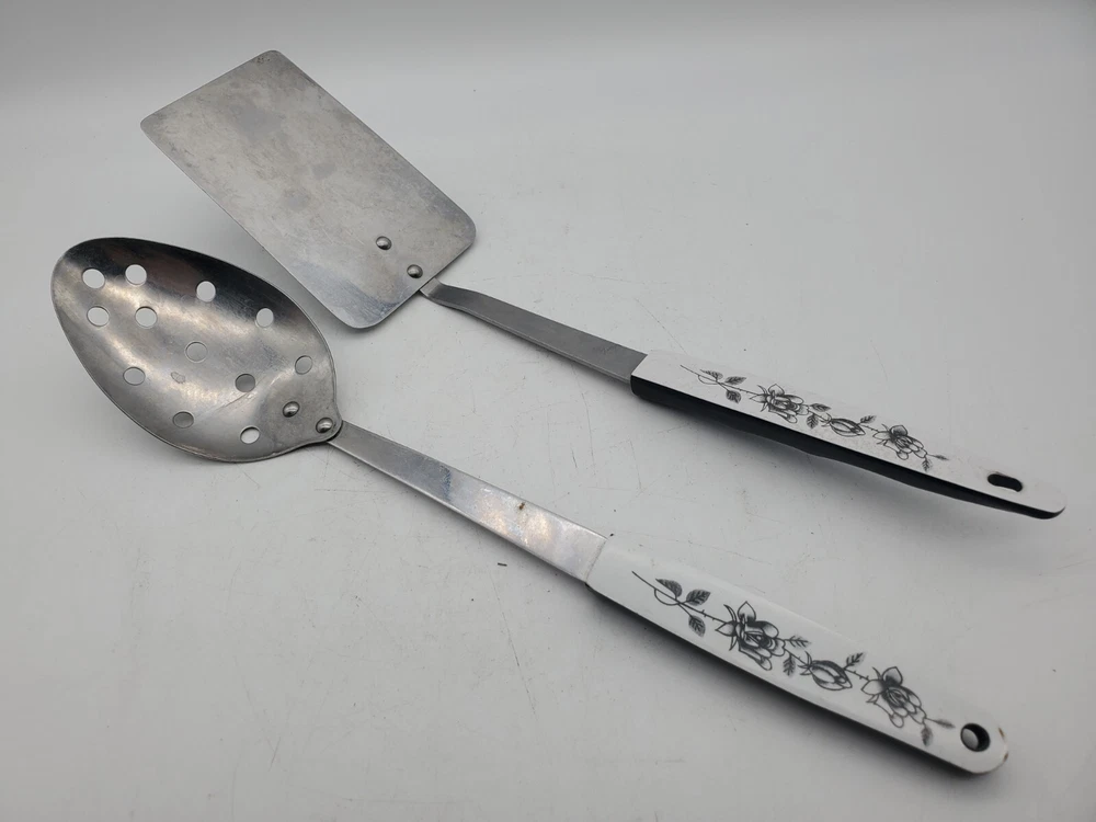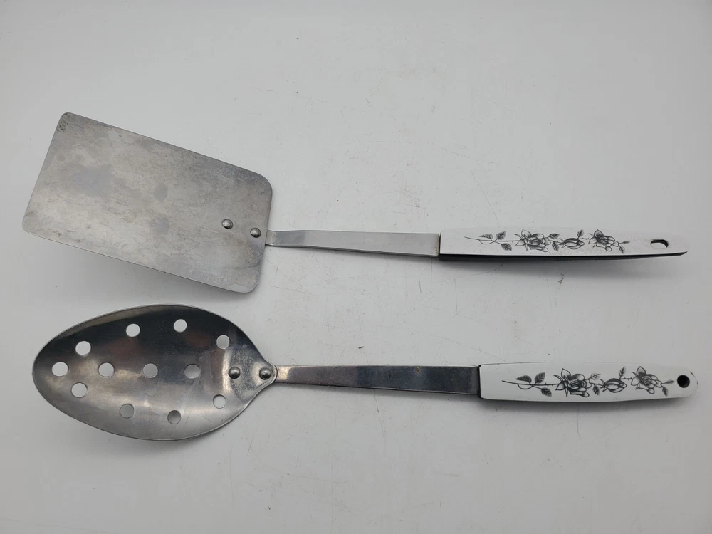 Color: Silver black white Number of Items in Set: 2 Material: Metal and Plastic Country/Region of Manufacture: Japan gtin13: Does not apply Set Includes: Slotted Spoons & Skimmers, Spatula Type: Slotted Spoons & Skimmers Brand: Unknown Pattern: Floral UPC: Does not apply Handle Material: Plastic