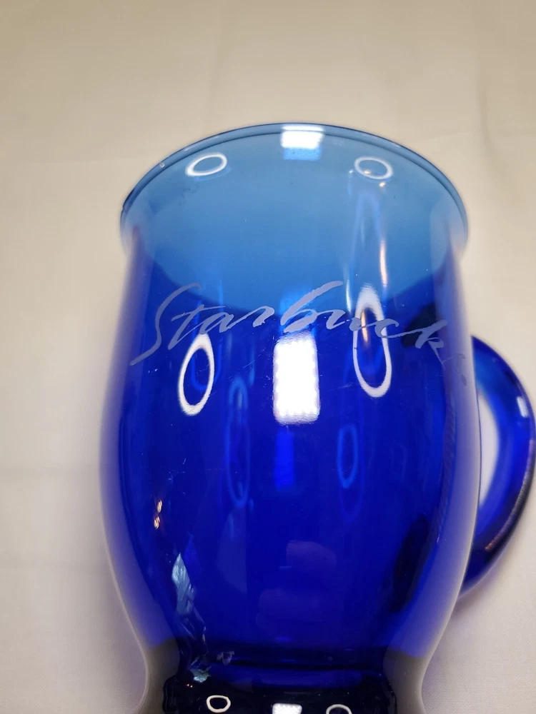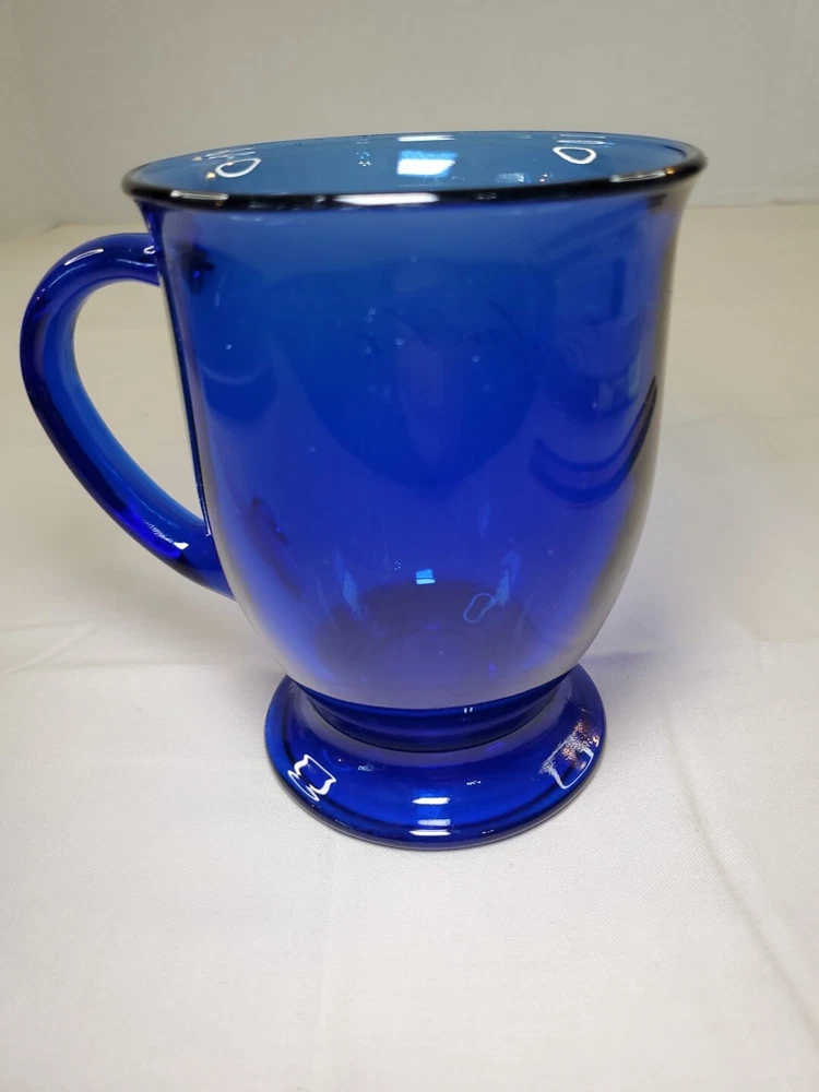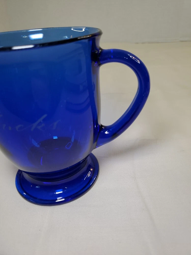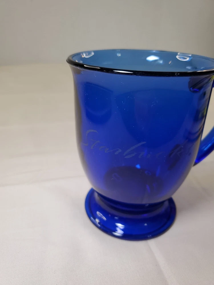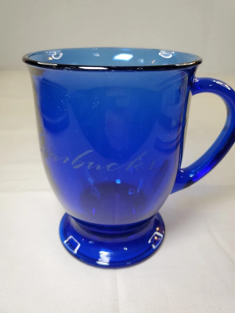 THANK YOU FOR VISITING OUR STORE. WE SHIP 6 DAYS A WEEK (UNLESS THERE IS A FEDERAL HOLIDAY). MOST ITEMS WILL SHIP IN A STURDY BOX AS NEEDED. PLEASE FEEL FREE TO REACH OUT IF YOU HAVE ANY QUESTIONS. WE WILL COMBINE SHIPPING WHEN AVAILABLE. This vintage Starbucks glass mug is a must-have for any coffee and tea enthusiast out there! With a beautiful cobalt blue color and the iconic Starbucks logo etched on the front, this mug is a true collector's item. Made in the United States by Anchor Hocking, this mug is sturdy and perfect for enjoying your favorite beverage. The mug has a 14 oz capacity, making it a great addition to any collection. Whether you're a Starbucks fanatic or just looking for a unique piece to add to your coffee and tea collection, this vintage glass mug is sure to impress. Don't miss out on the chance to own a piece of Starbucks histor