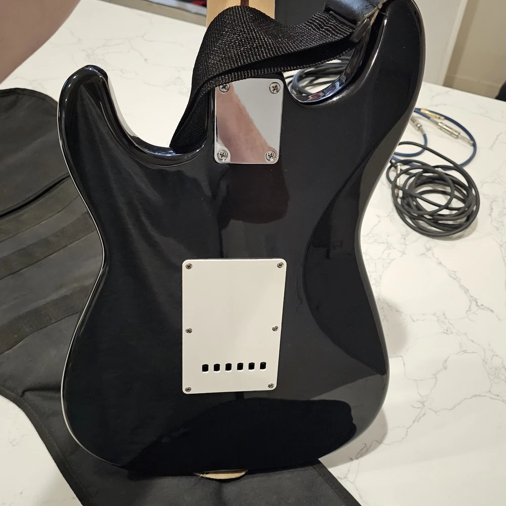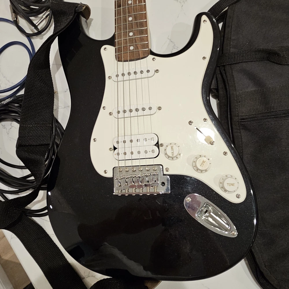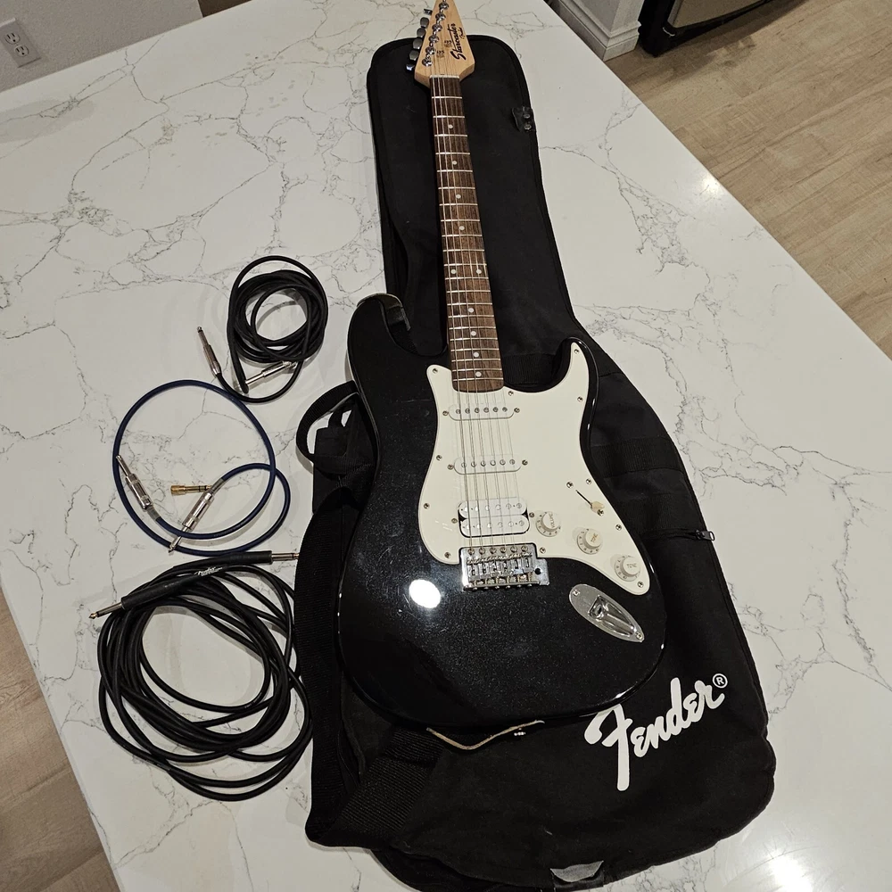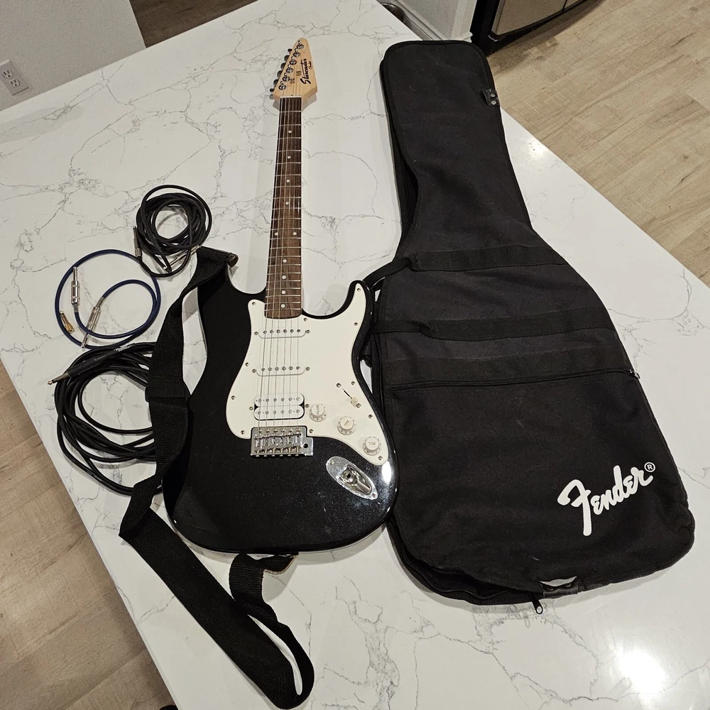 Starcaster By Fender Strat Electric Guitar Black 6 String With Fender Soft Case. Comes With A Few Cords. May Need To Be Tuned. It Looks To Be In Good Overall Condition. Has Some Minor Signs Of Use, Possibly A Mild Blemish Here Or There, Definitely Nothing Major. Please Check All Pictures Closely For A More Detailed Visual Description Of Condition. Ships Out Free Within One Business Day.