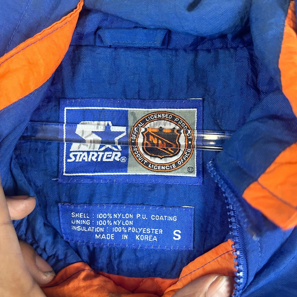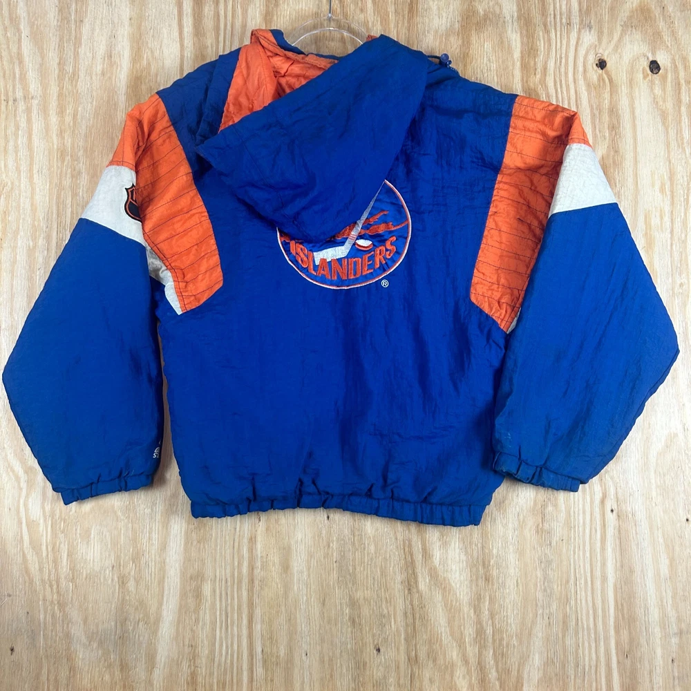 Show your love for the New York Islanders with this vintage Starter NHL puffer jacket hoodie. This blue jacket is perfect for any hockey fan, especially those who are looking for a stylish and comfortable piece of clothing. It features the team's logo on the front and is officially licensed by the National Hockey League (NHL), making it a must-have for any true fan. This jacket is made for men and comes in size small. It is perfect for all-star games and other special events, and is a great way to show your support for your favorite team. The jacket is made in Korea, Republic of and is of high quality. Get your hands on this vintage Starter NHL New York Islanders puffer jacket hoodie today and show your love for the team in style! SKU: 160019