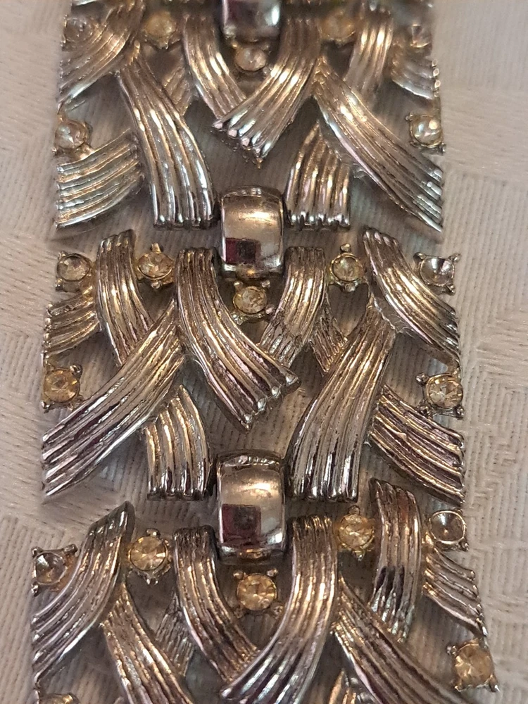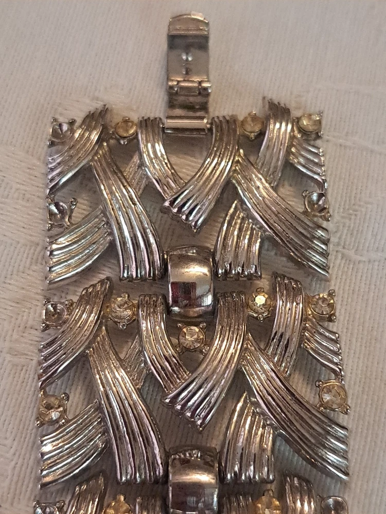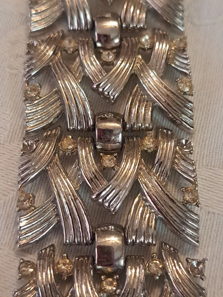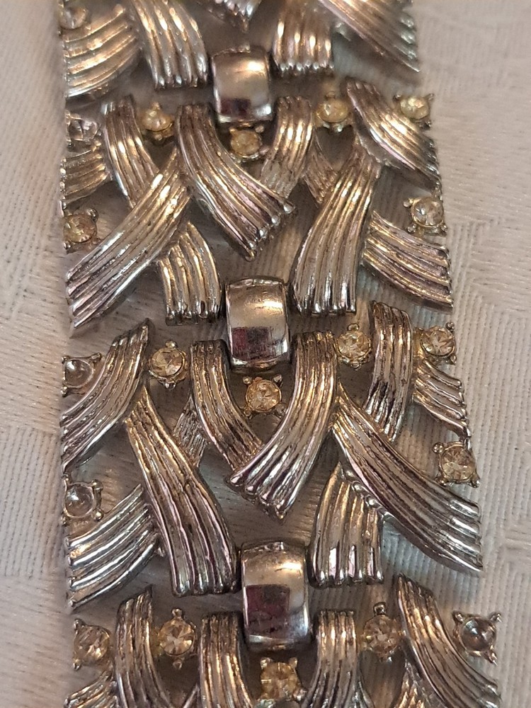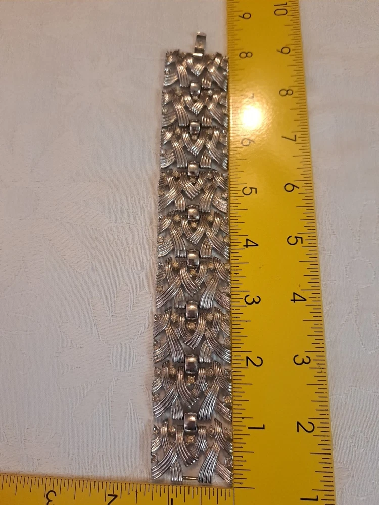 The Vintage Statement Crown TRIFARI Silvertone Wide Lattice Braided Link Bracelet is a stunning piece of vintage jewelry signed by the renowned brand Trifari. The bracelet features a wide lattice design with braided links in silvertone, accented with sparkling rhinestones as the main stone. The snap closure makes it easy to wear, and the classic silver color adds a touch of elegance to any outfit. Perfect for those who appreciate vintage and antique jewelry, this bracelet exudes a timeless beauty and sophistication. Missing a few tiny rhinestones. Price reflects. I can combine shipping to save you some $ 🥳