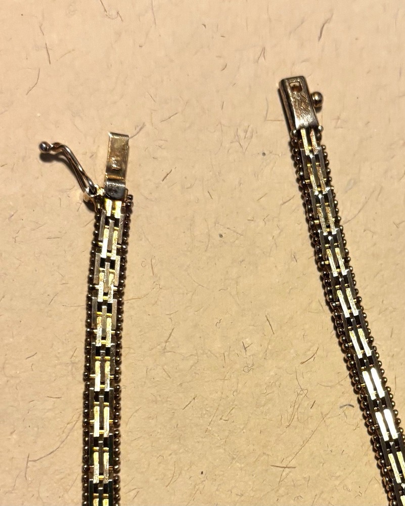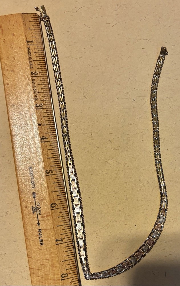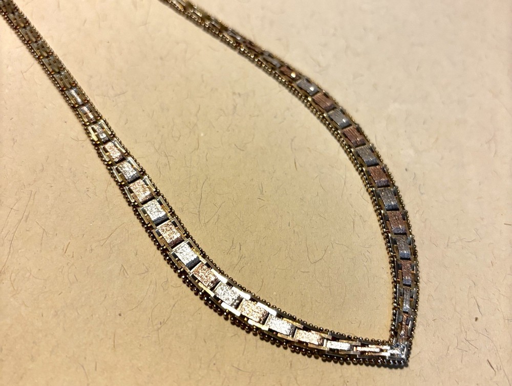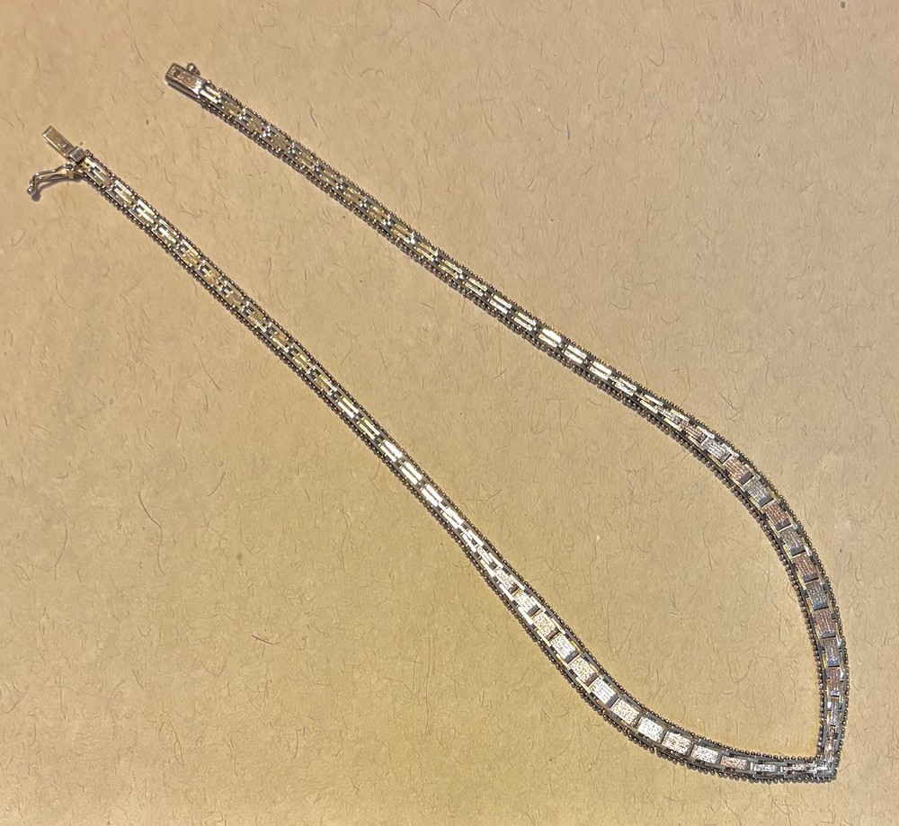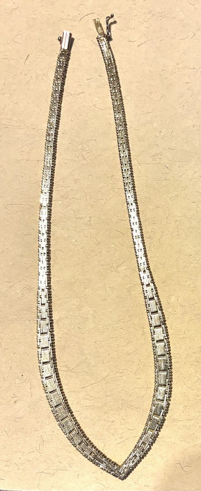 This necklace features an articulated, geometric link design often seen in vintage-style or "tennis" style jewelry. The links appear to be tricolor or multi-tonal, with repeating rectangular segments. Design: A tapered or V-shaped "chevron" collar necklace with rectangular, articulated links. Style: Often categorized as Vintage Art Deco or Modernist, frequently found in sterling silver with gold plating (vermeil) or tricolor gold. this necklace is in great condition