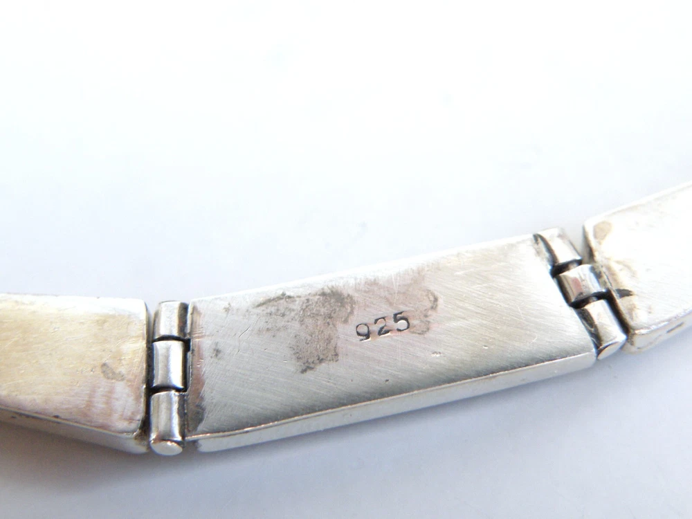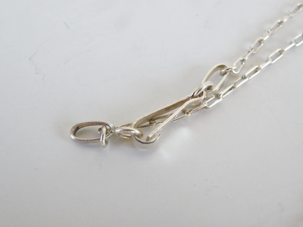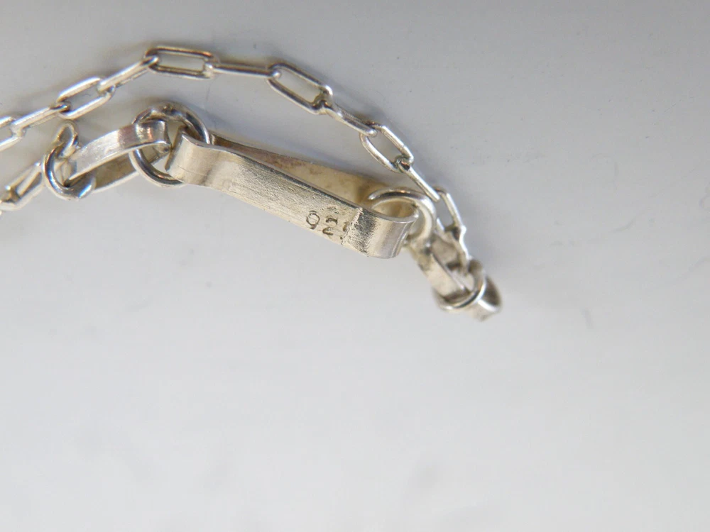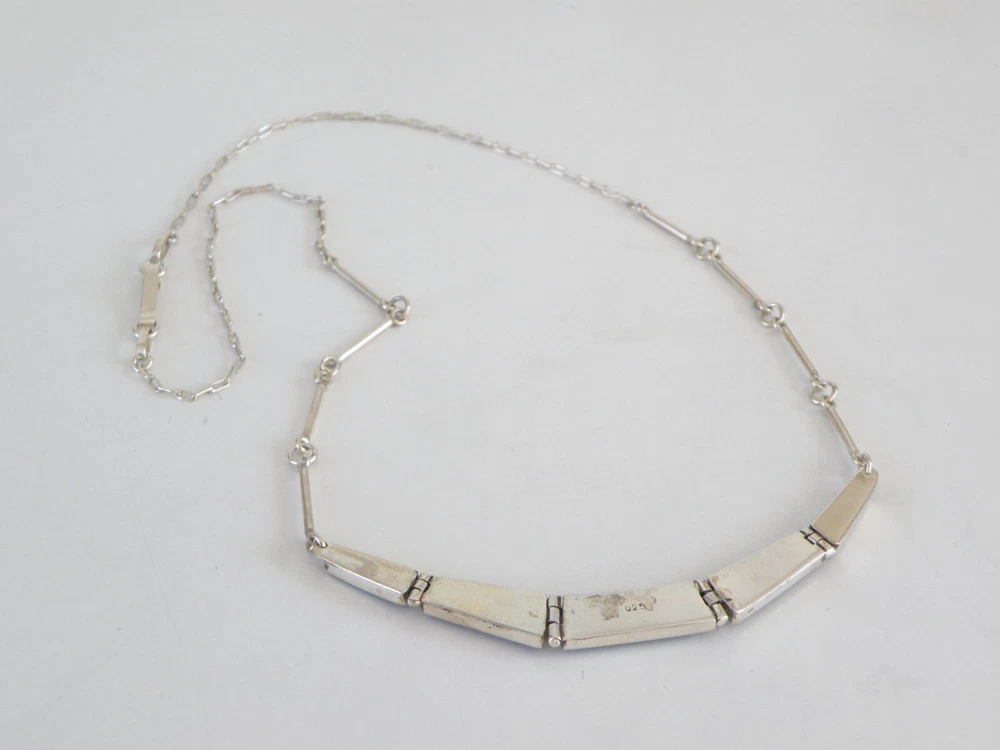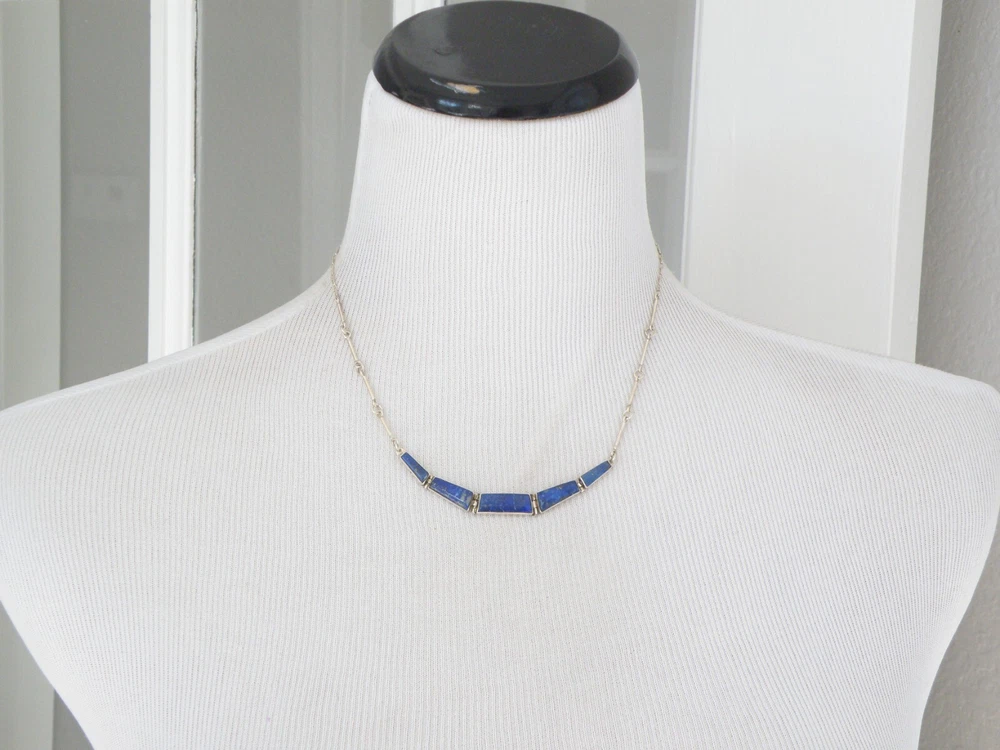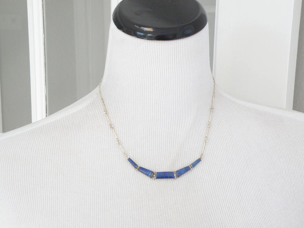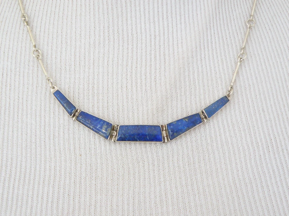 Find the key to accessory success in this statement making vintage sterling silver necklace. Beautiful natural lapis stones light up the center. This necklace appears all handmade. It is stunning. It is in good vintage condition with normal wear. No missing or damaged stones. May need to be polished. WEIGHT: 9.5 grams MEASURES APPROX: 18" long end to end x .35" widest in the center The center is approx. 3" long Center stone is approx. 8mm x 19mm Signed 925 for sterling silver is marked on the hook clasp and the back of the necklace