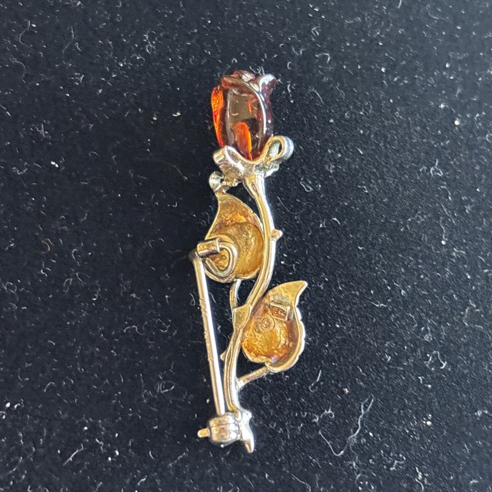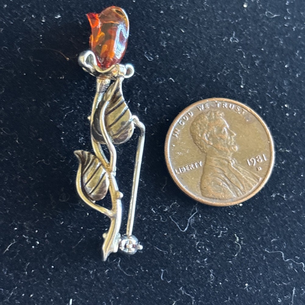 This vintage Sterling Silver Baltic Amber Rose Flower Pin Brooch is a beautiful and elegant piece of jewelry. The intricate design featuring a flower shape adds a touch of sophistication to any outfit. The use of Sterling Silver and Baltic Amber as the main stone further enhances the overall quality and beauty of the piece, making it a timeless and classic accessory for any jewelry collection.