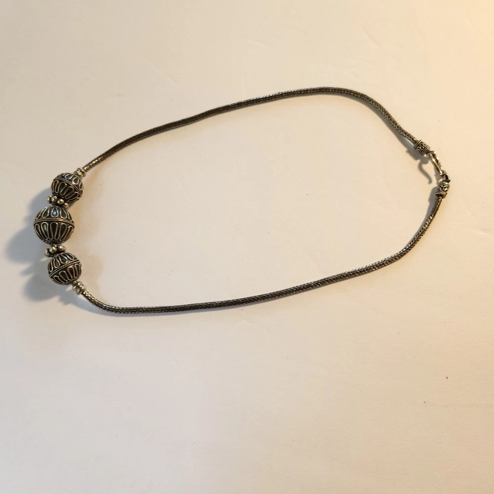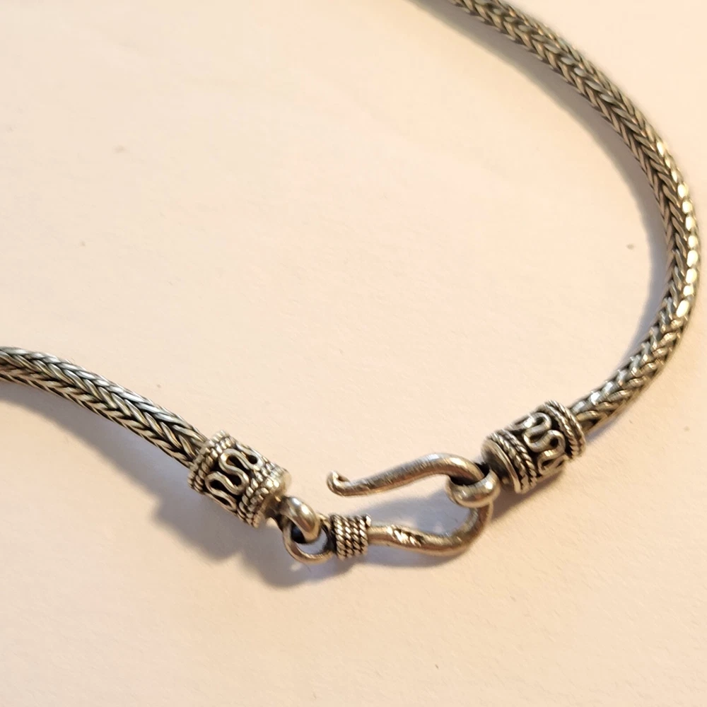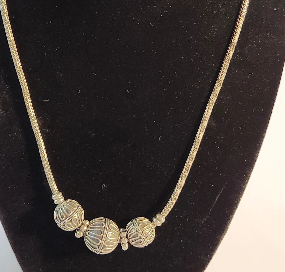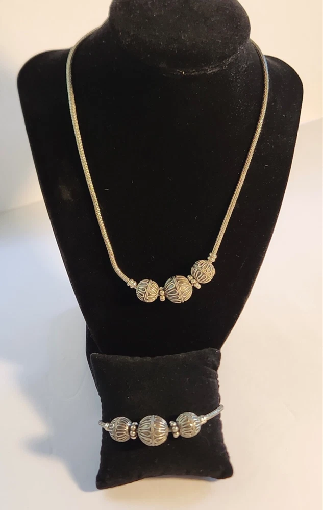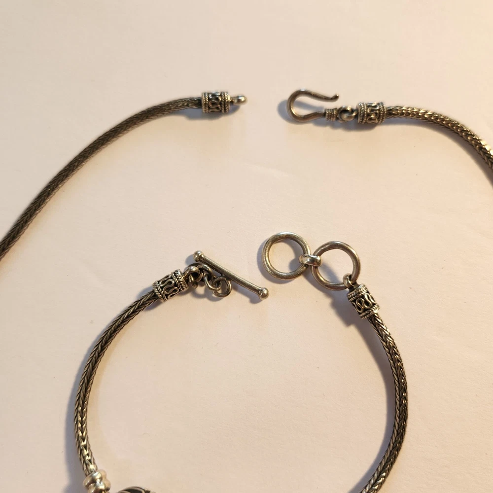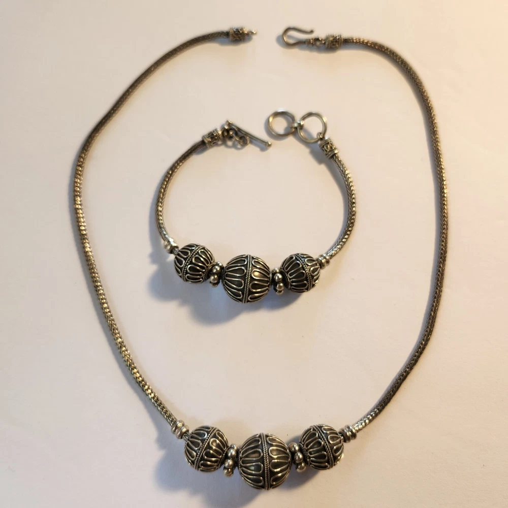 Sterling .925 silver necklace and bracelet… Bali wheat foxtail chain.. hook enclosure for necklace and and hoop for the bracelet. Both are stamped .925 the bracelet is 8 inches long and weighs 26 grams.. the necklace is 18 inches long and weighs 34 grams.. ALMOST 2 OUNCES OF STERLING SILVER… there are 3 balls on this necklace . An elegant design and sure to please.. PREOWNED.