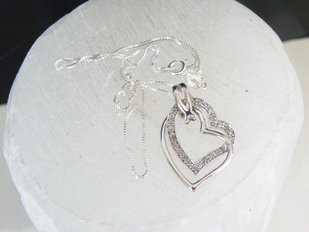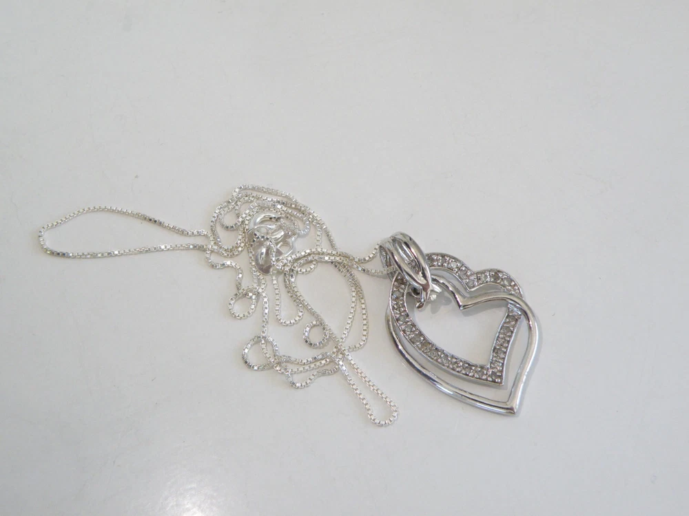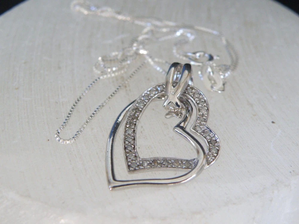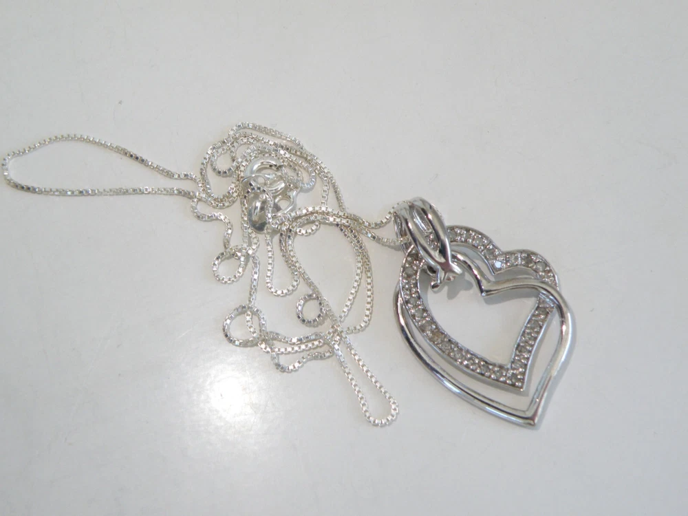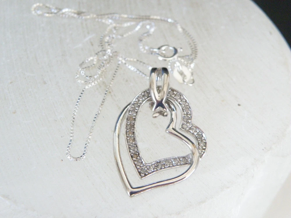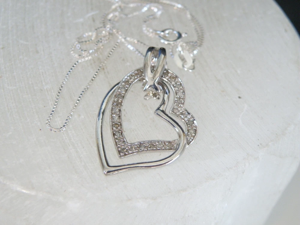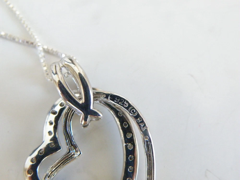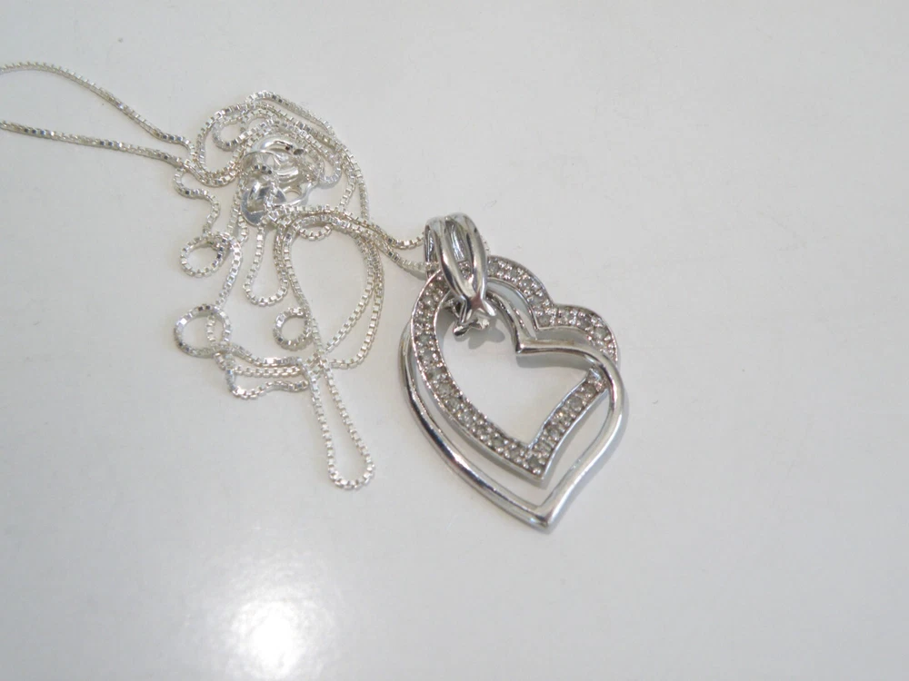 Unlock your style potential with this charming double heart diamond sterling silver pendant necklace. Measures approx. 18" long. Heart is approx.1.20" with the attached bail x .75" Weight 3.2 grams Marked 925 for sterling silver is marked on both pieces. The pendant is also marked SAI - necklace is marked Italy 925